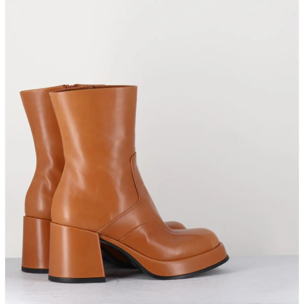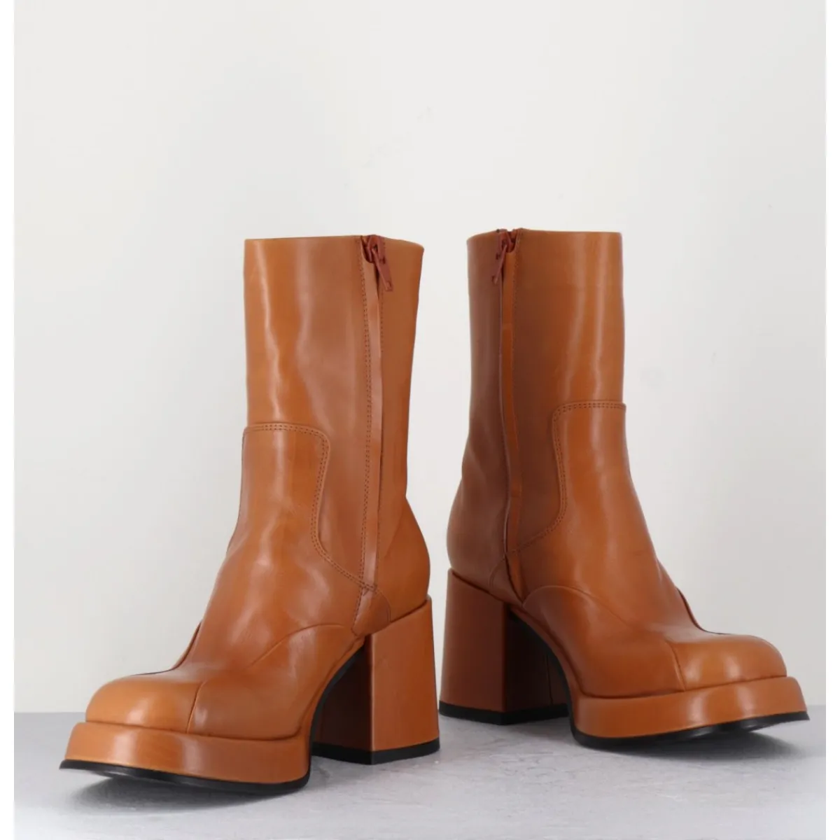 Boots 70s en cuir beige, empiècements ton sur ton sur l’avant, bout carré soft, montées sur un talon bloc et une plateforme recouverts.