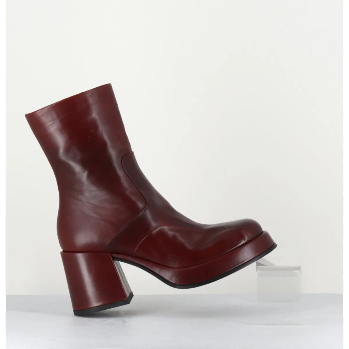 Boots 70s en cuir bordeaux, empiècements ton sur ton sur l’avant, bout carré soft, montées sur un talon bloc et une plateforme recouverts.