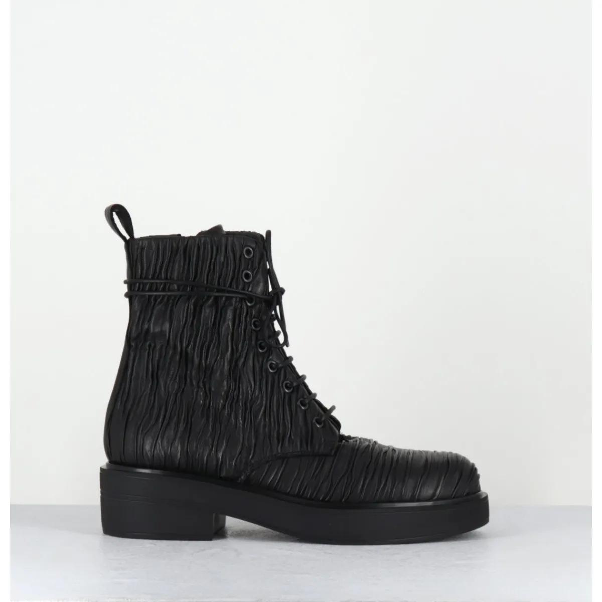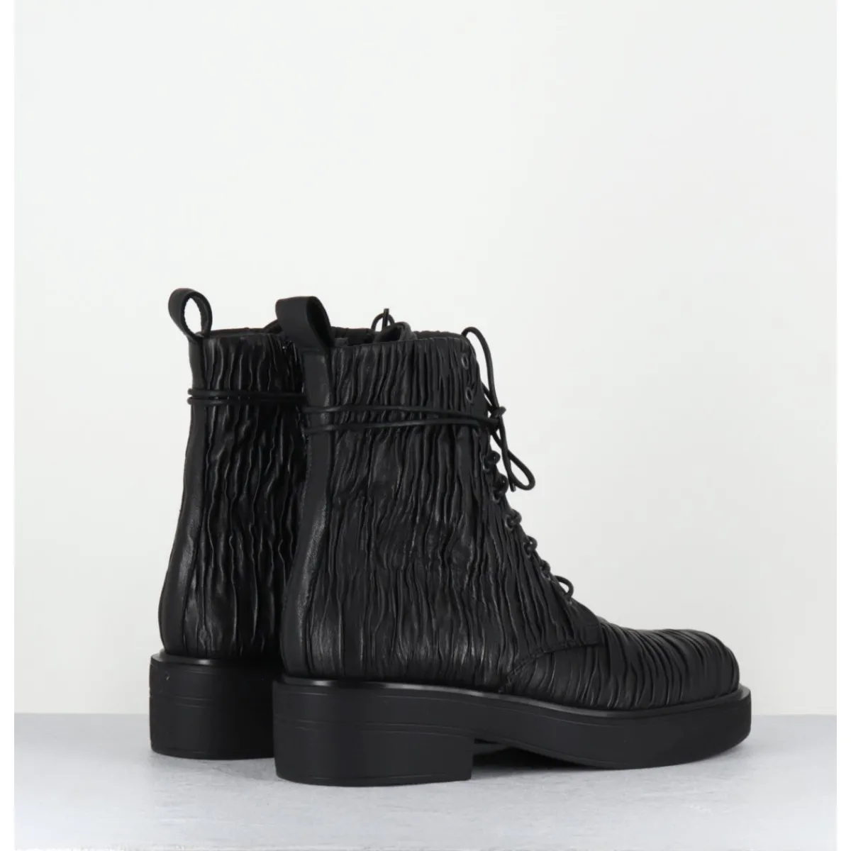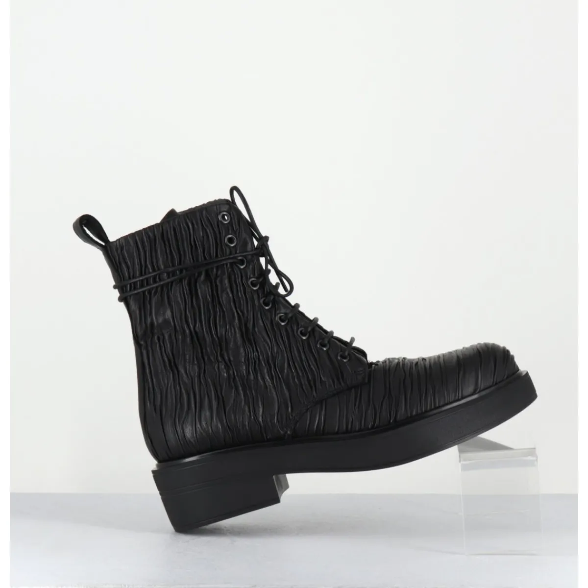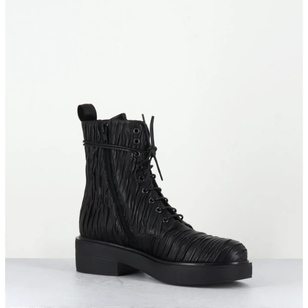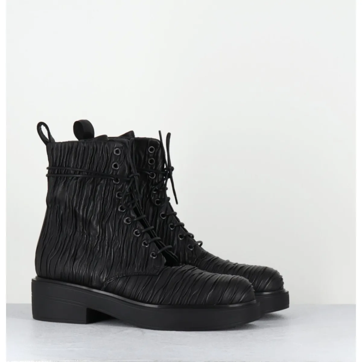 Boots à lacets esprit rangers en cuir « plissé » noir, bout en amande, montées sur un semelle épaisse en gomme légère