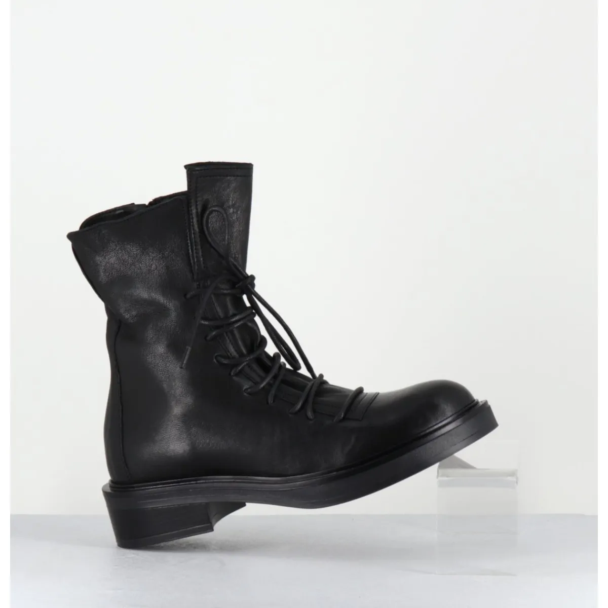 Boots en cuir noir avec lacets décoratifs, ligne Avant-garde à bout en amande, zip intérieur, montées sur une semelle en gomme légère et un petit talon confortable