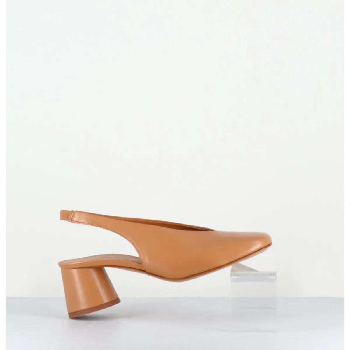 Escarpins slingback en cuir souple beige caramel légèrement brillant, bout carré doux au look rétro, bride arrière élastiquée pour plus de confort, montés sur un petit talon cylindrique
