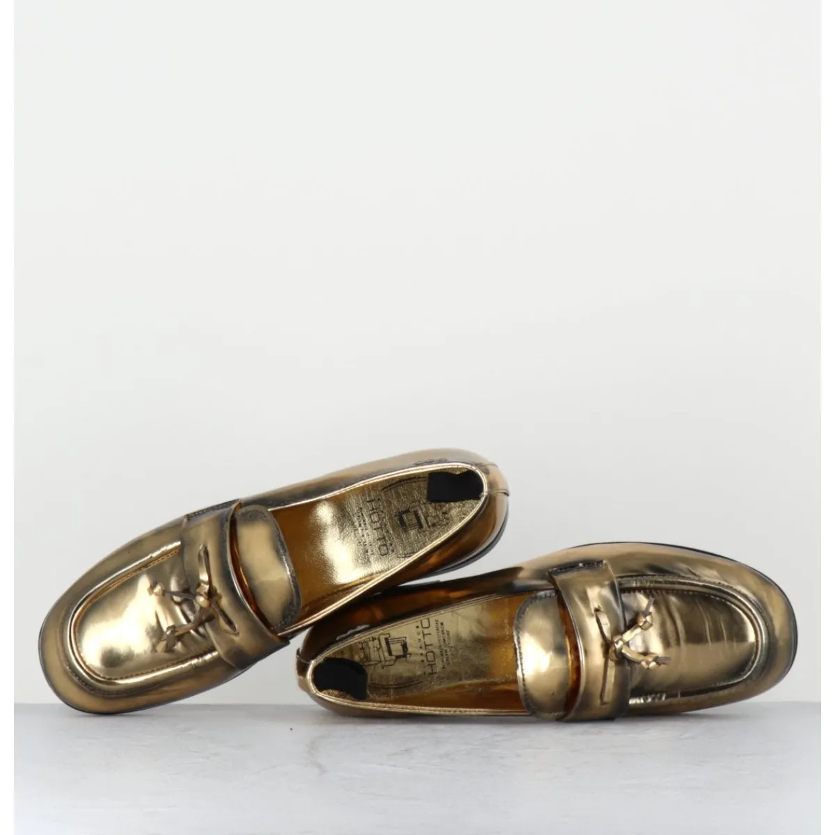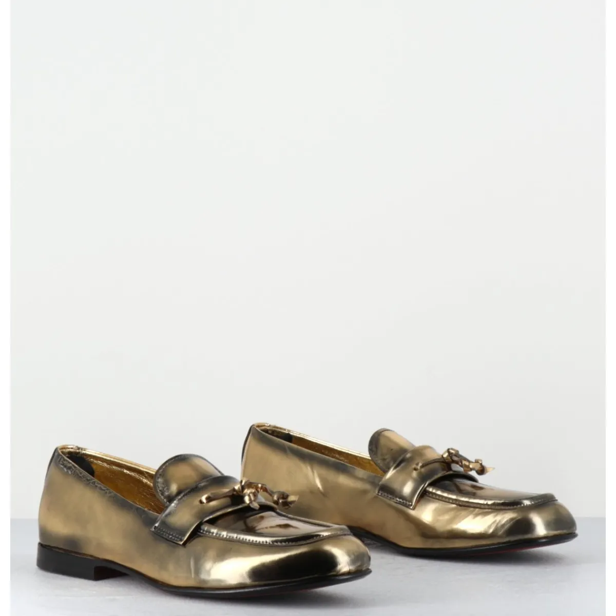 Mocassins plats en cuir glacé doré patiné à la main pour un effet vintage donnant des reflets plus foncés, bout carré arrondi, petit noeud look rétro, montées sur une semelle en cuir extrêmement souple