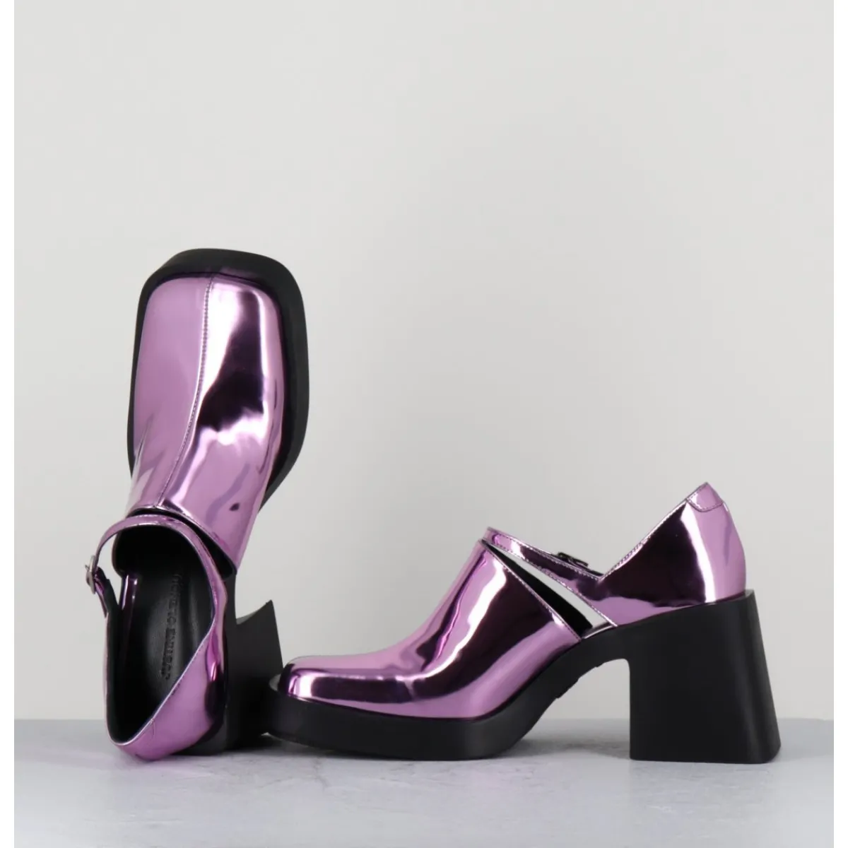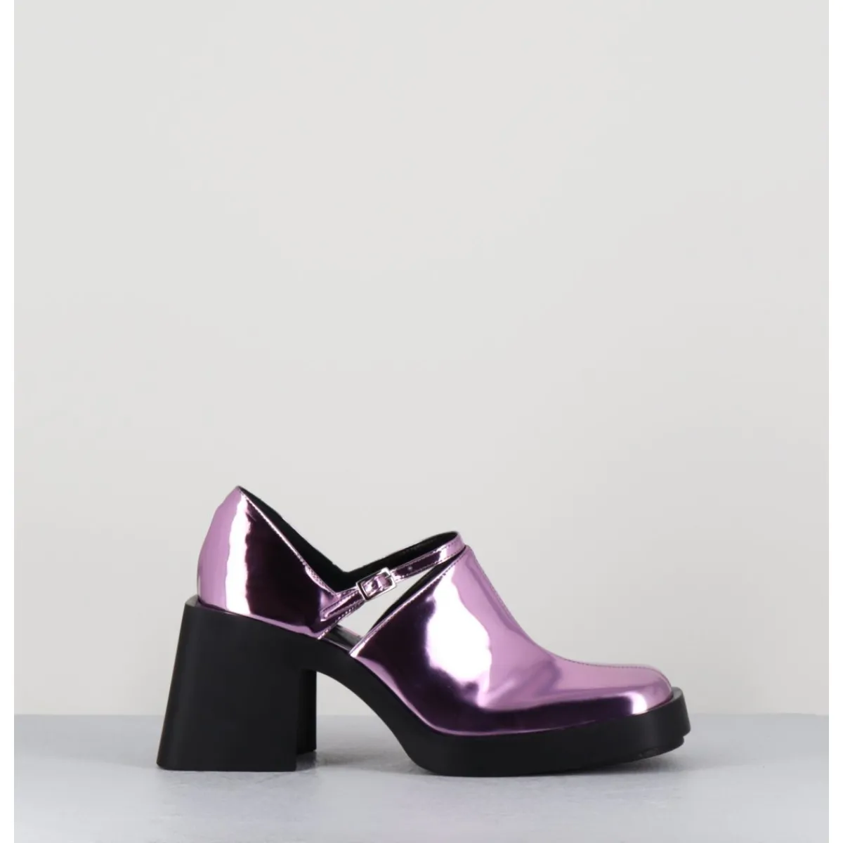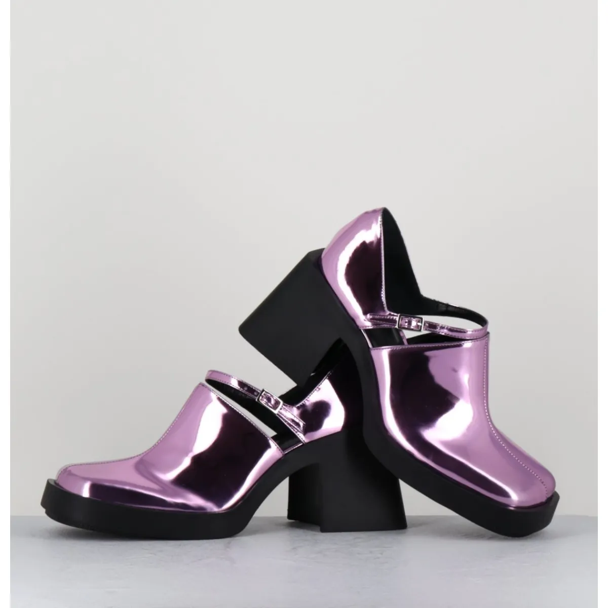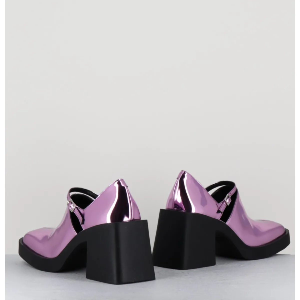 Chaussures Mary-Jane en cuir & vinyl miroir rose, 90s shape bout carré, petit bride réglable, montées sur un talon bloc chunky légèrement évasé & une fine plateforme en gomme noire