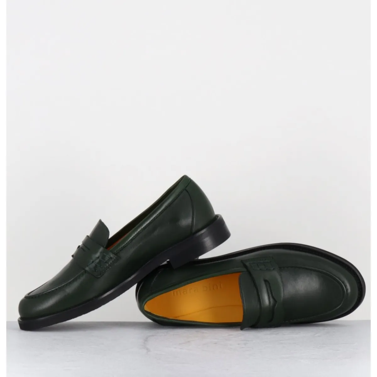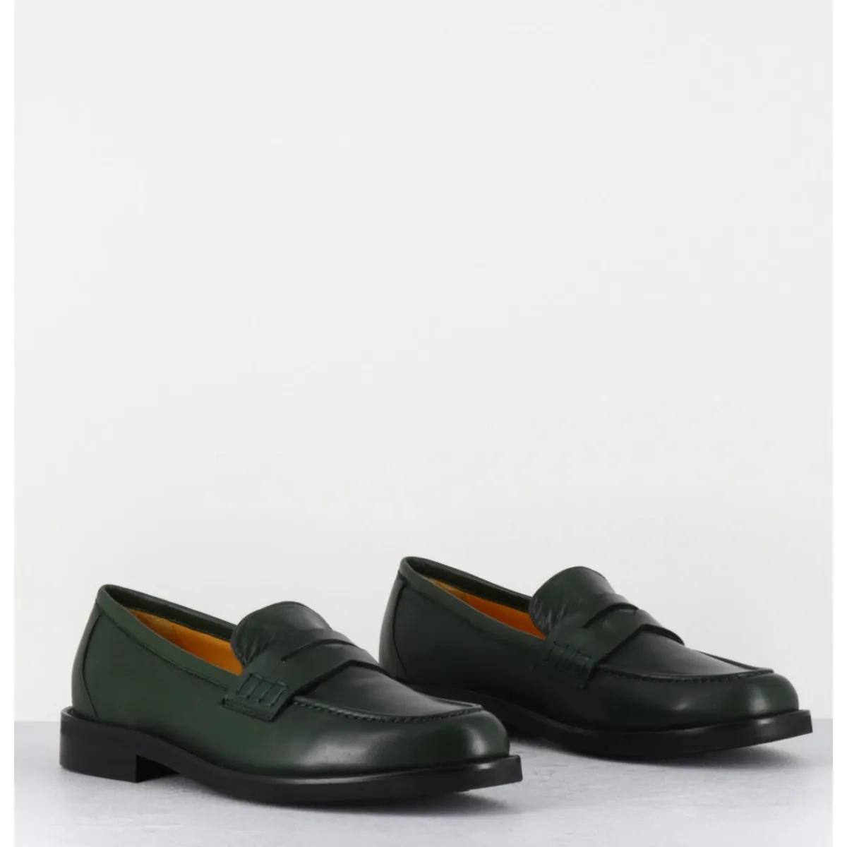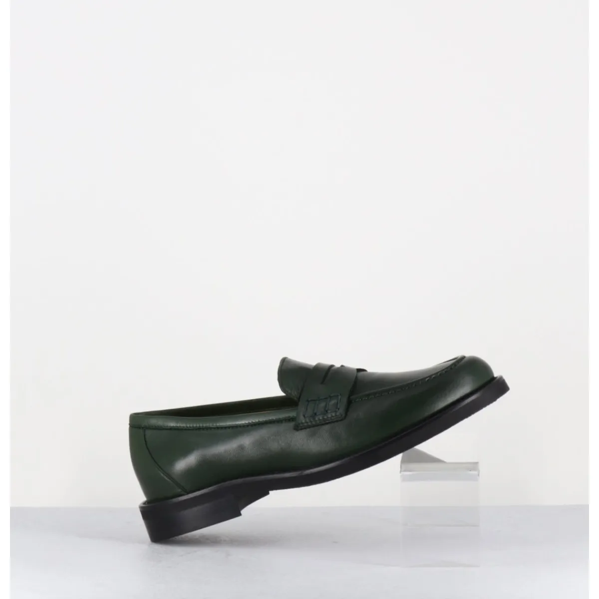 Mocassins plats en cuir vert foncé extrêmement souple, ligne pure montées sur une semelle en gomme ultra légère