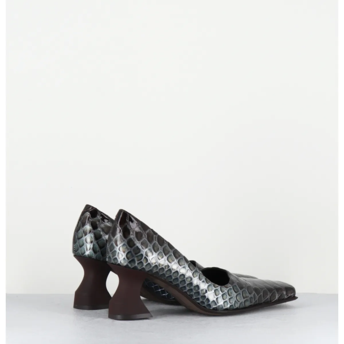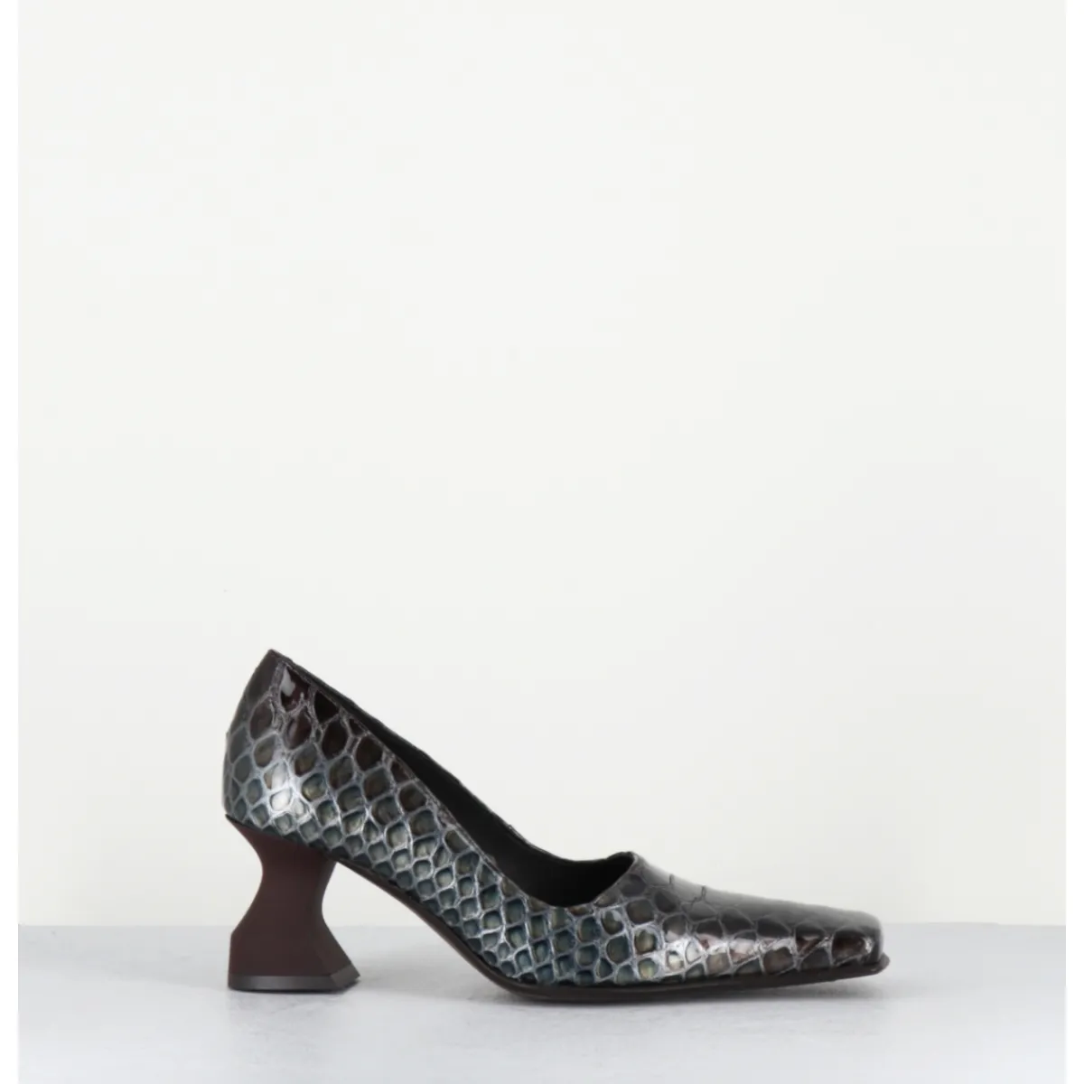 Escarpins en cuir imprimé serpent marron et bleu mélangé, ligne effilée à bout carré 90s, montées sur un talon virgule stylisé recouvert de gomme marron