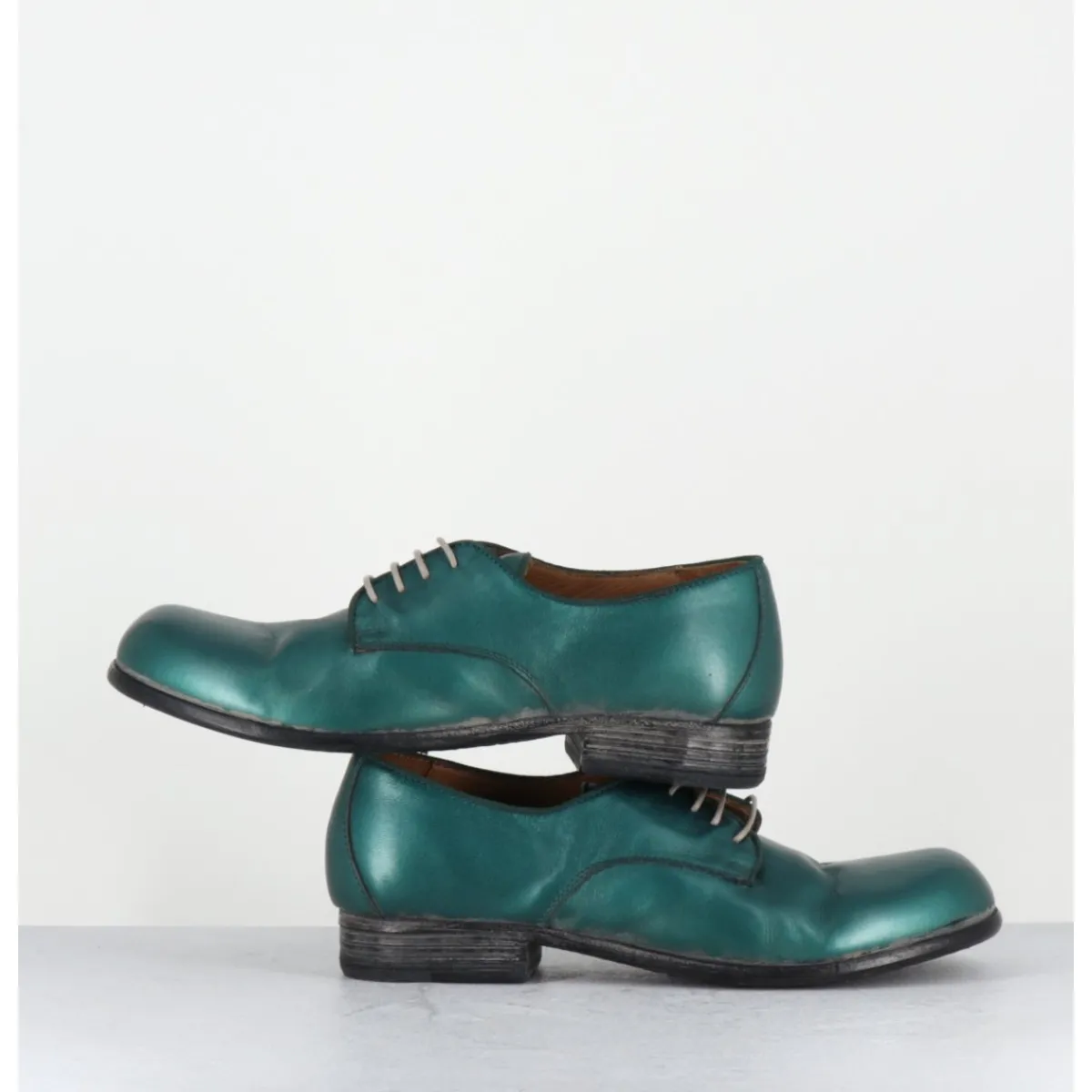Derbies à lacets en cuir souple métallisé bleu, ligne pure esprit avant-garde, bout arrondi, montées sur une semelle cousue et lavée à la main pour un effet usé