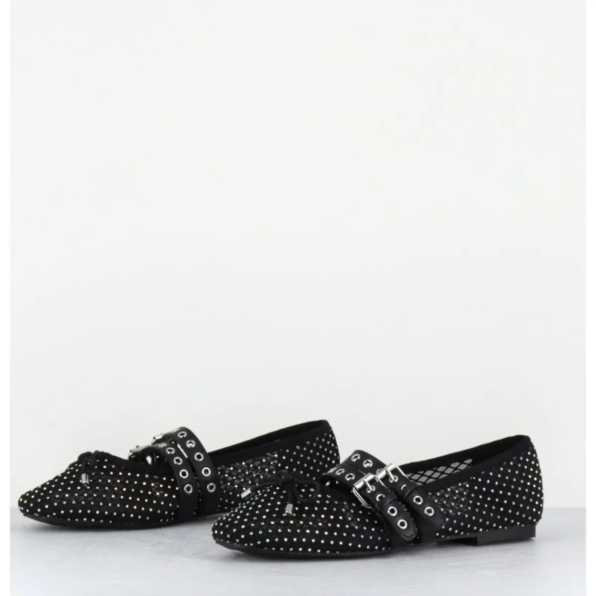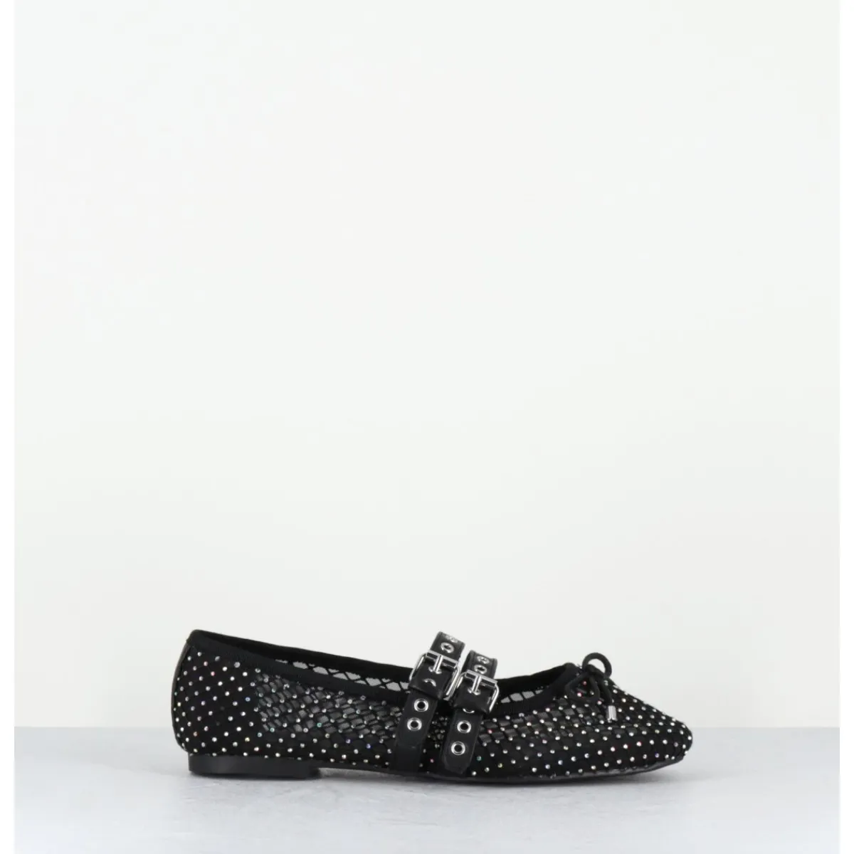 Ballerines en mesh noir effet résille orné de petits strass, double brides réglables en cuir noir esprit Mary-Jane, ligne effilée avec bout arrondi et petit noeud décoratif, montées sur une semelle plate en gomme