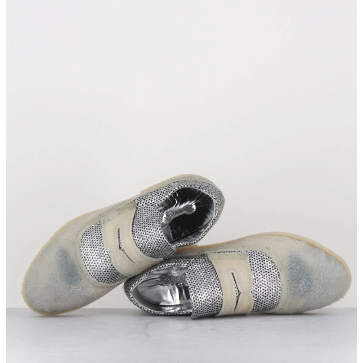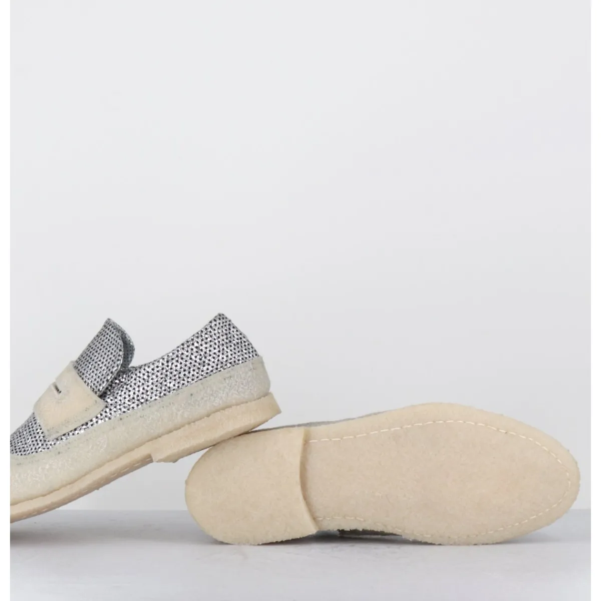 Mocassins en cuir métallisé argent perforé et crêpe naturel, construction sacchetto extrêmement souple cousu intérieur extérieur, ligne effilée en amande