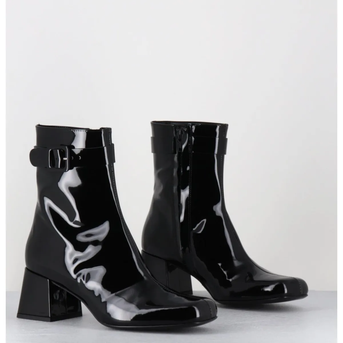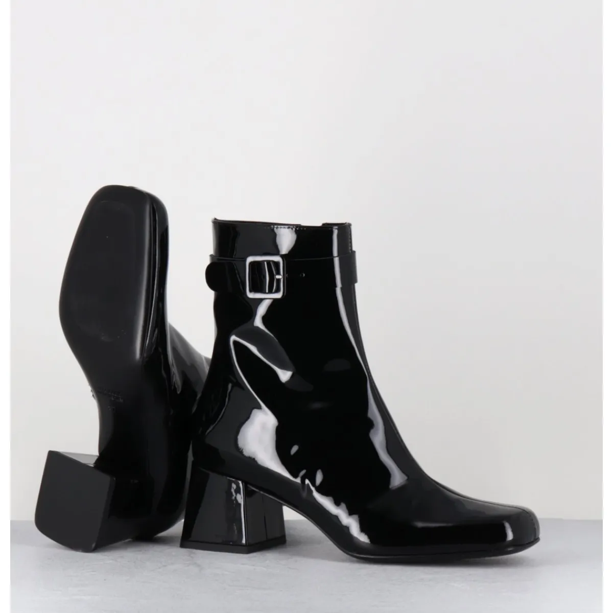 Boots en cuir vernis noir, bout carré et petit talon évasé esprit 60s