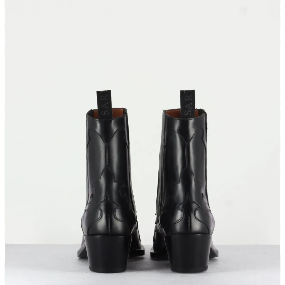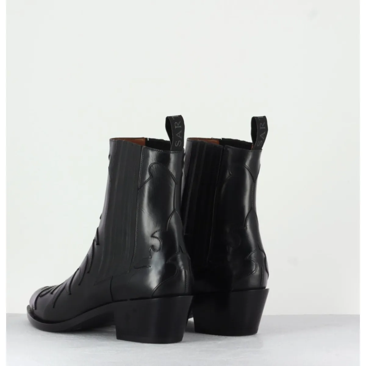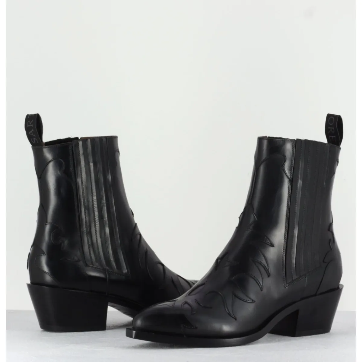 Boots santiag iconique des bottiers Sartore en cuir lisse noir, petit talon biseauté, découpes flammes et élastiques latéraux pour un enclenchement facile .