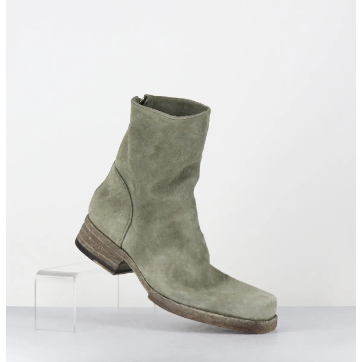 Boots en daim vert kaki en partie non doublé, lavé à la main pour un effet vintage « usé », zip arrière, ligne pure brutaliste à bout carré, tige mi-haute, montées sur une double semelle en cuir cousue intégral et un petit talon bloc confortable