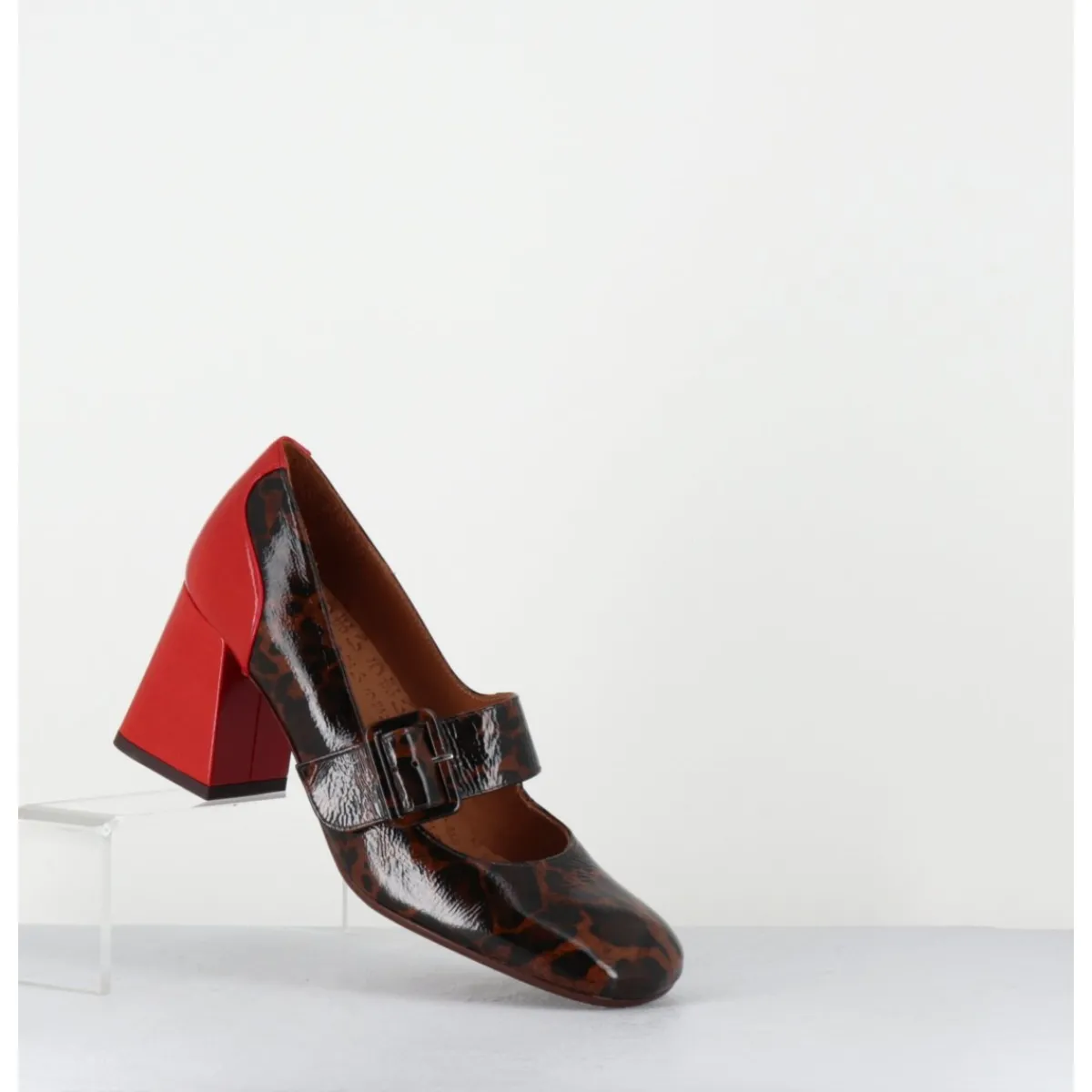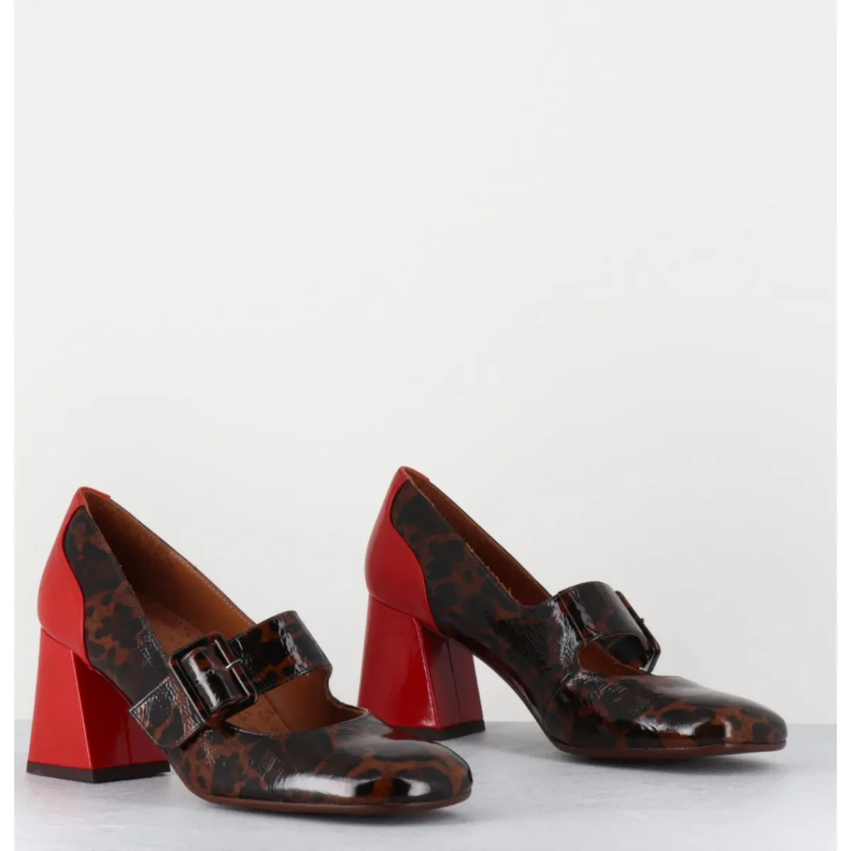 Chaussures Mary-Jane à bride réglable en cuir vernis souple imprimé pied-de-poule léopard, bout carré arrondi, montées sur un talon rétro légèrement évasé recouvert de cuir vernis rouge