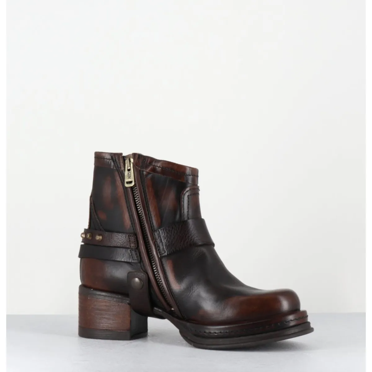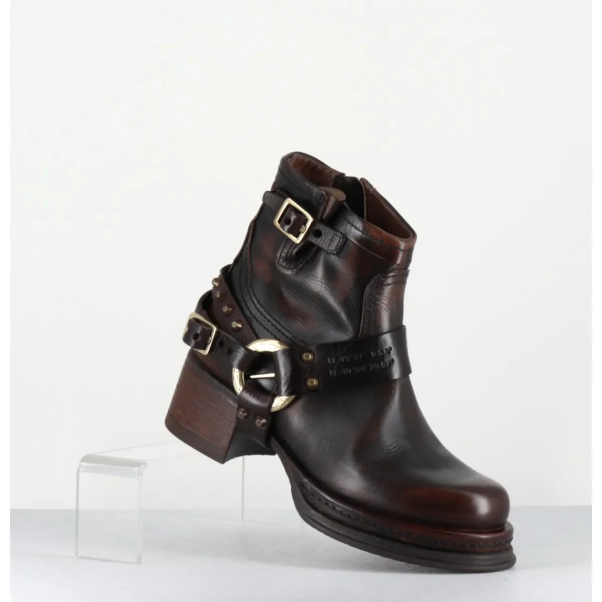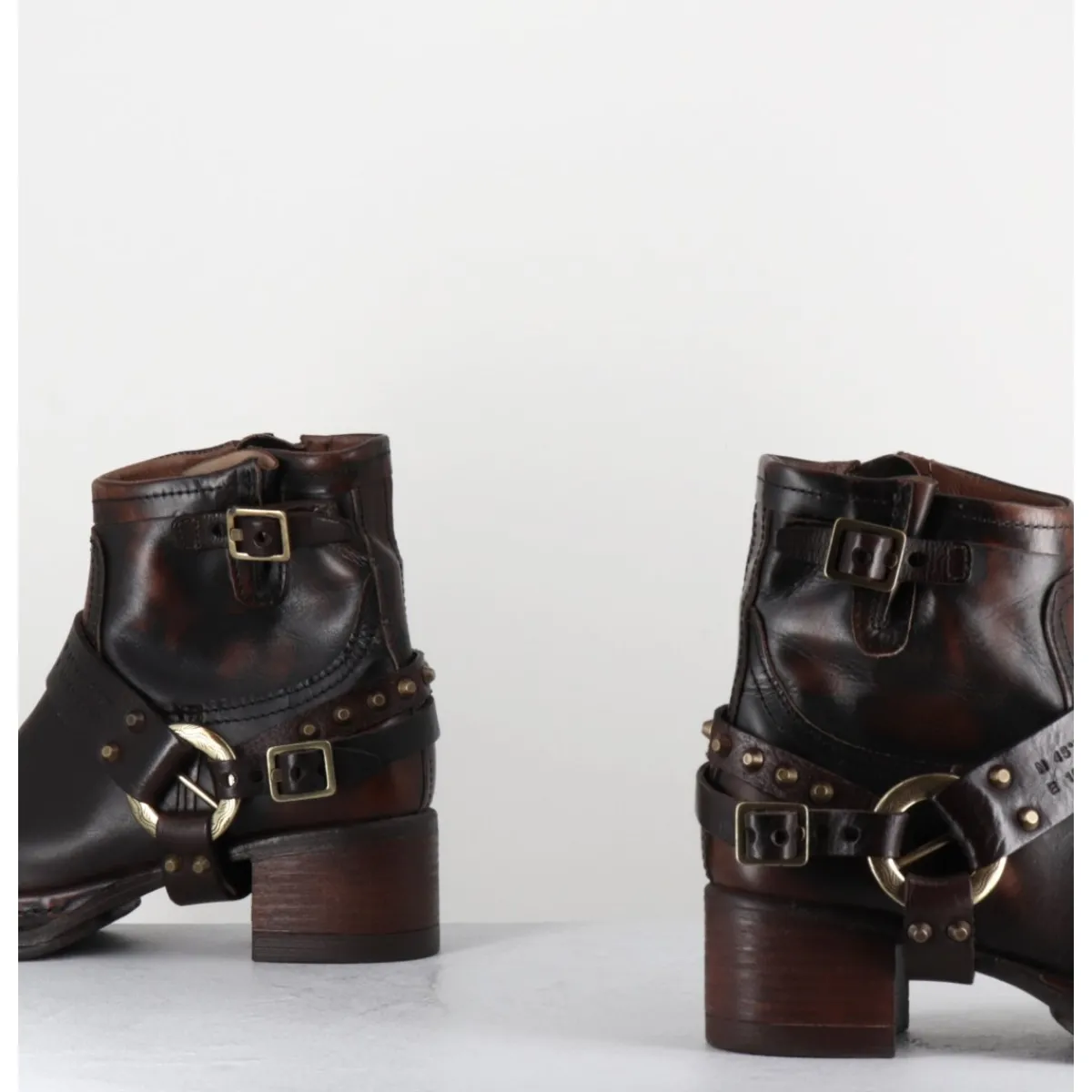 Boots bikers tige courte en cuir marron lustré avec patine vieilli à la main pour un effet vintage, ceinturon à clous dorés, bout arrondi, petit bride à boucle réglable sur la jambe, montées sur une semelle épaisse en gomme et un talon bloc confortable