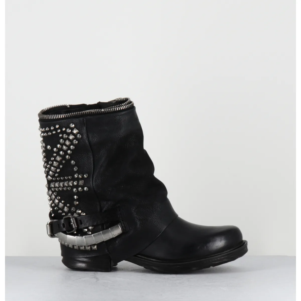 Boots bikers en cuir gras noir avec double sangles à l’arrière et en partie recouverte de clous motif rock