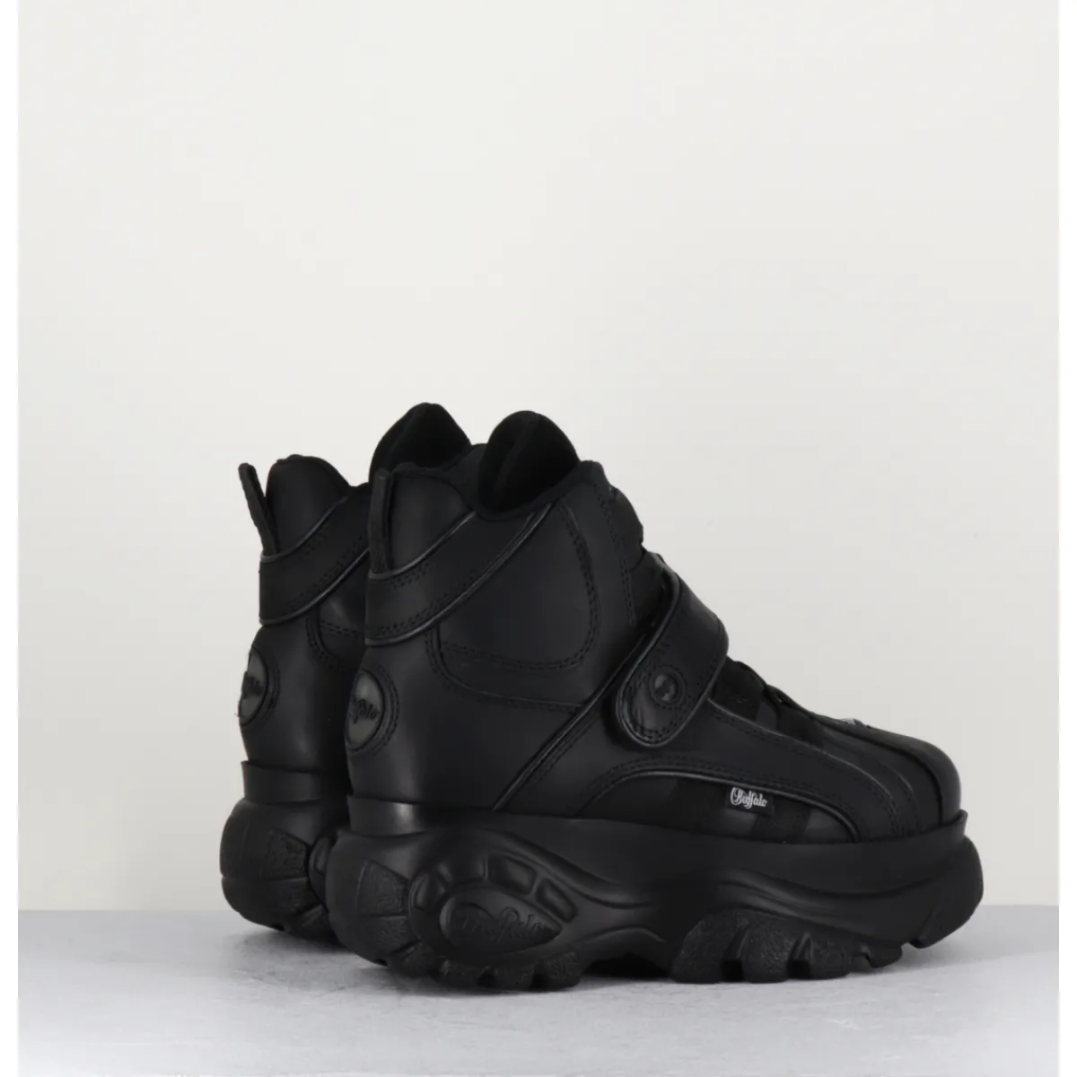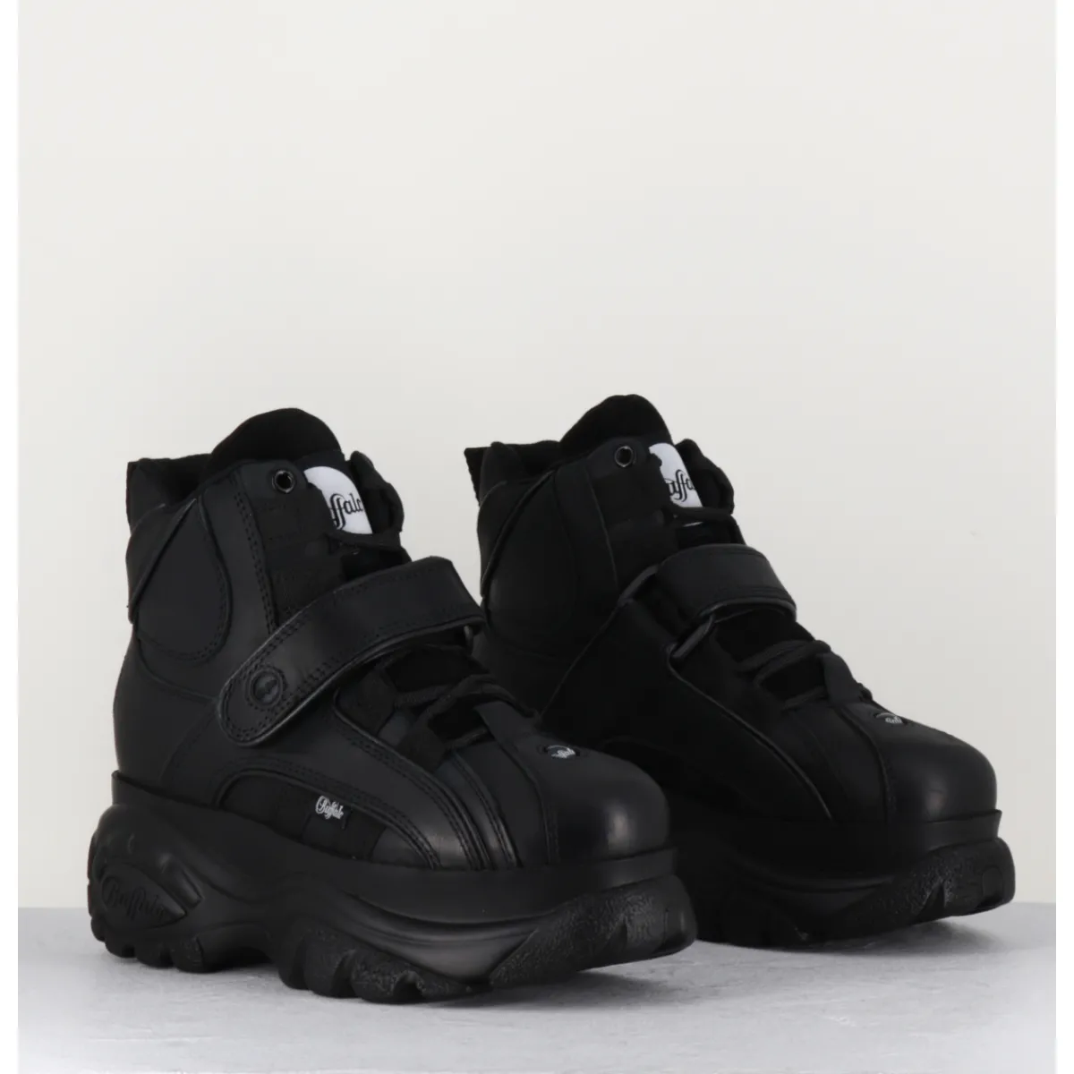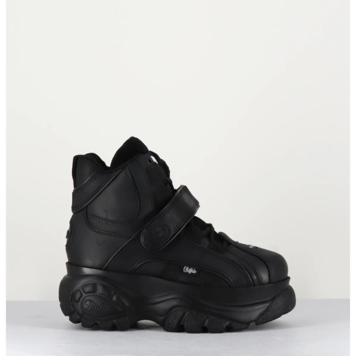 Baskets Buffalo London tige haute en cuir nubuck gras noir, montées sur sa célèbre semelle épaisse plateforme ton sur ton avec logo original. Un classique des 90s !