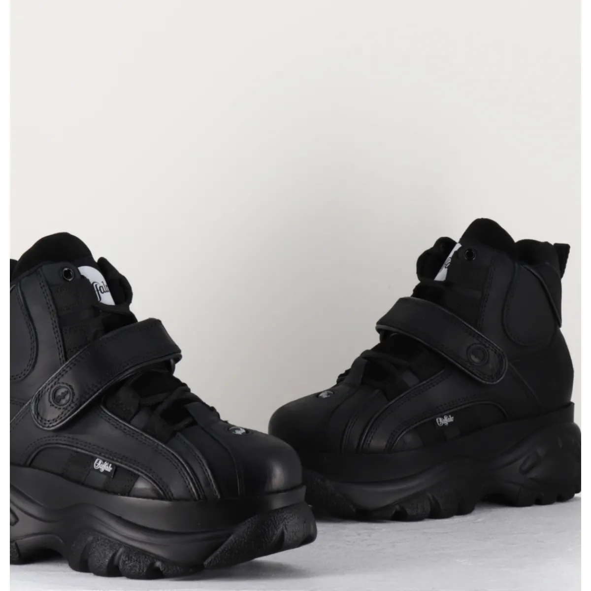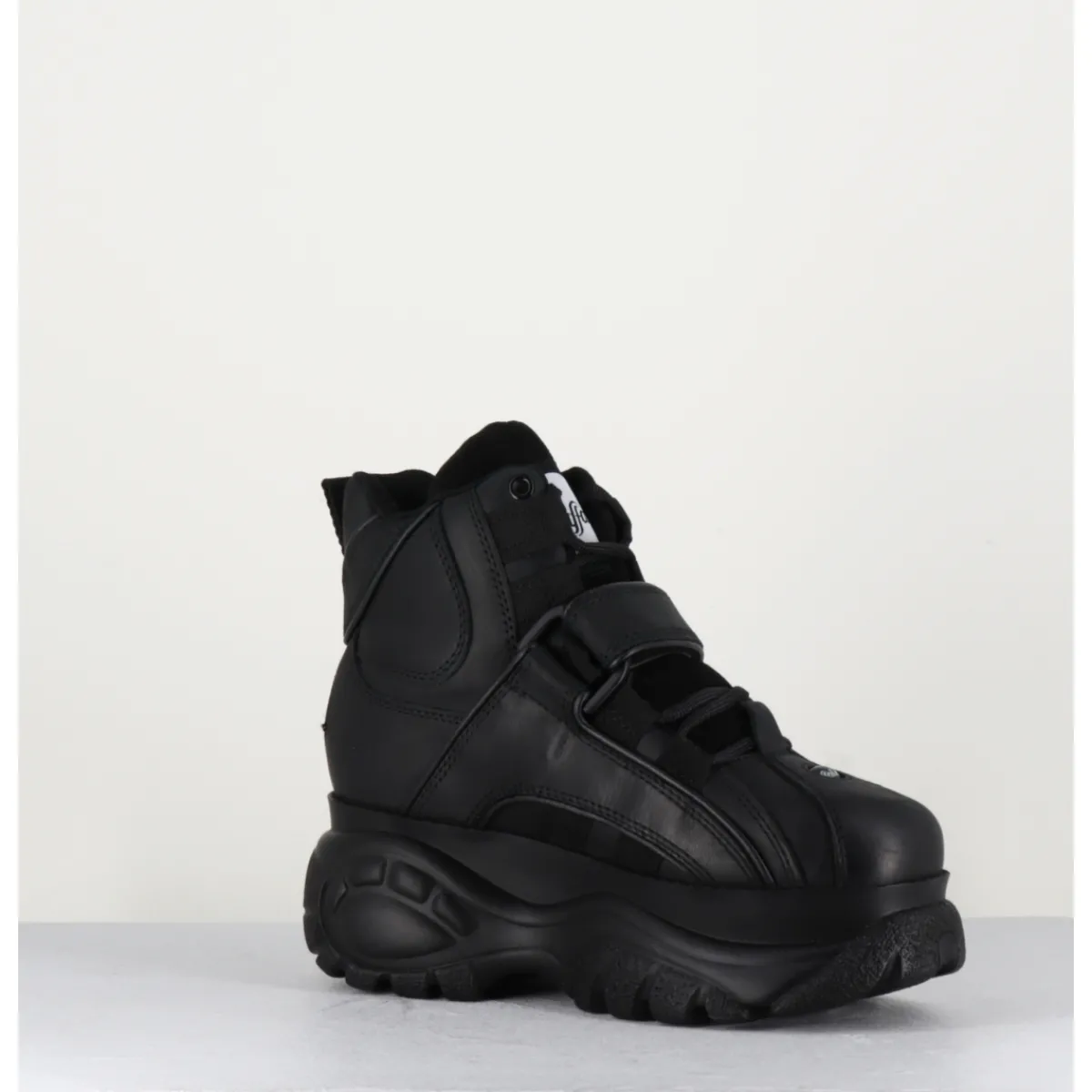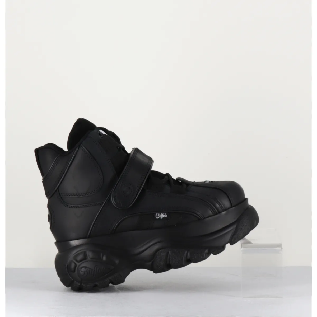 Baskets Buffalo London tige haute en cuir nubuck gras noir, montées sur sa célèbre semelle épaisse plateforme ton sur ton avec logo original. Un classique des 90s !