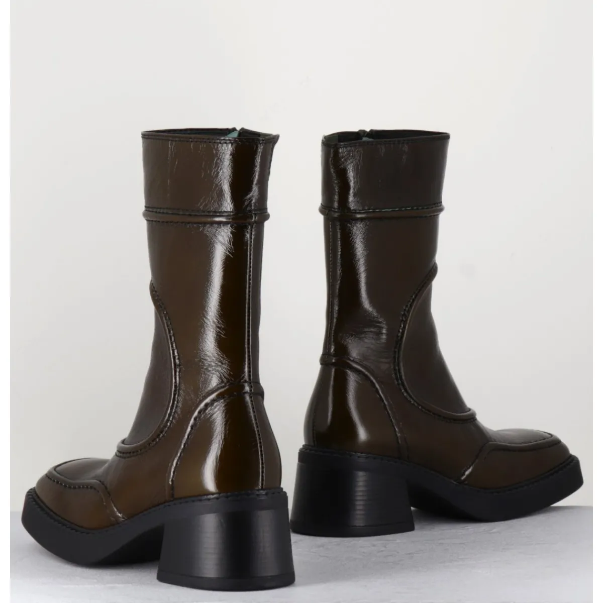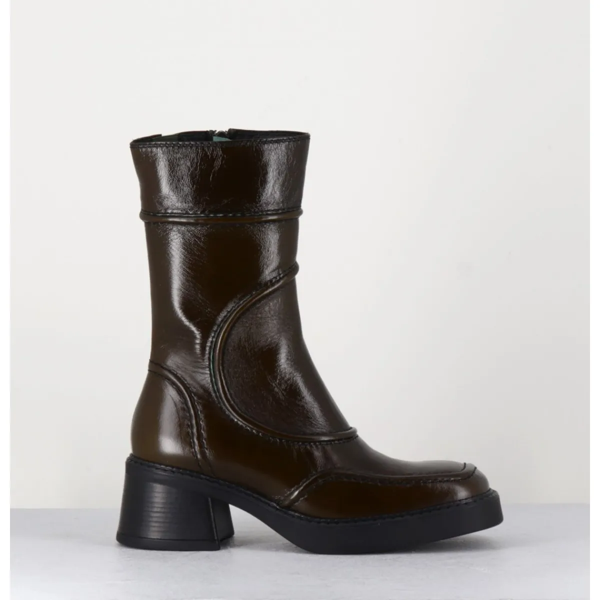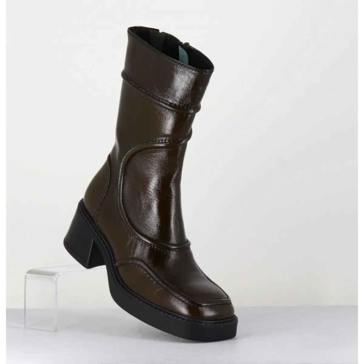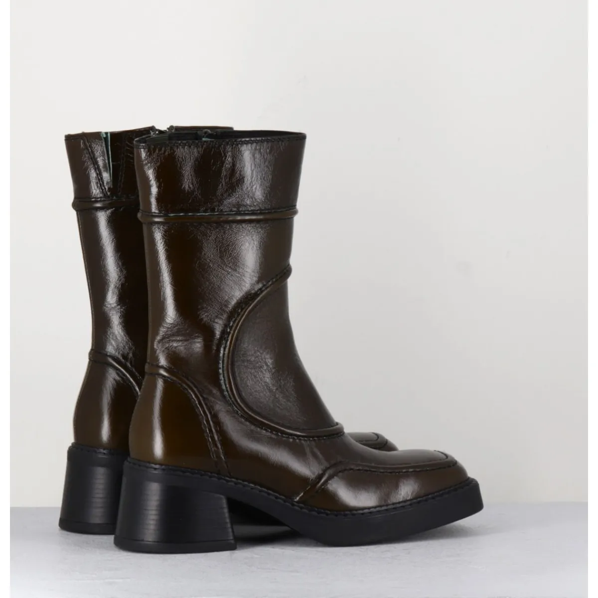 Boots en cuir brillant, découpes & surpiqûres géométriques esprit années 90, bout carré arrondi, montés sur un petit talon bloc et une fine plateforme en gomme.