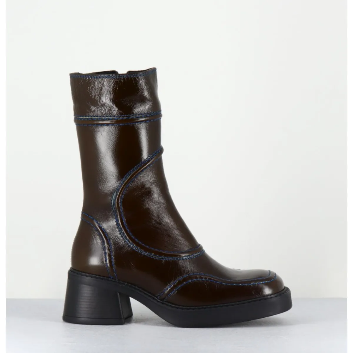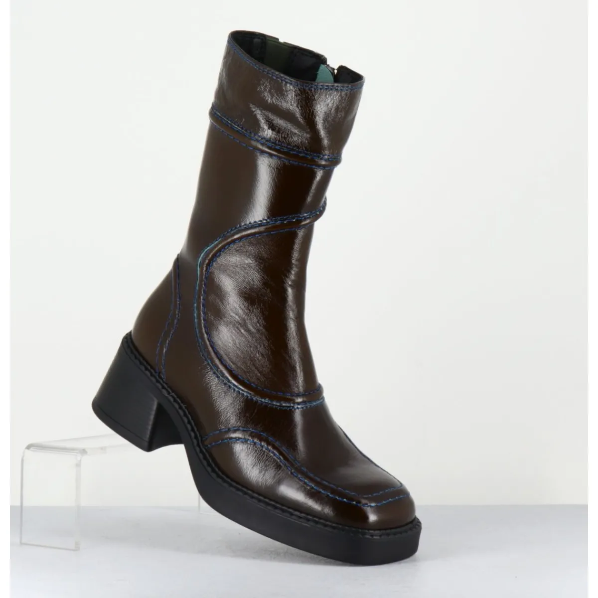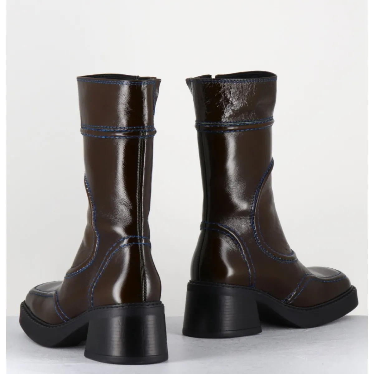 Boots en cuir kaki légèrement brillant, découpes & surpiqûres bleues apparentes esprit années 90, bout carré arrondi, montés sur un petit talon bloc et une fine plateforme en gomme.