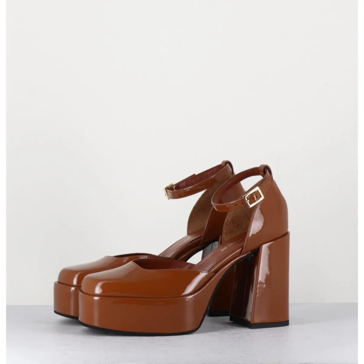 Chaussures-Babies à plateforme en cuir vernis caramel, bout carré arrondi, bride cheville réglable, montés sur un talon large légèrement évasé look rétro 70s