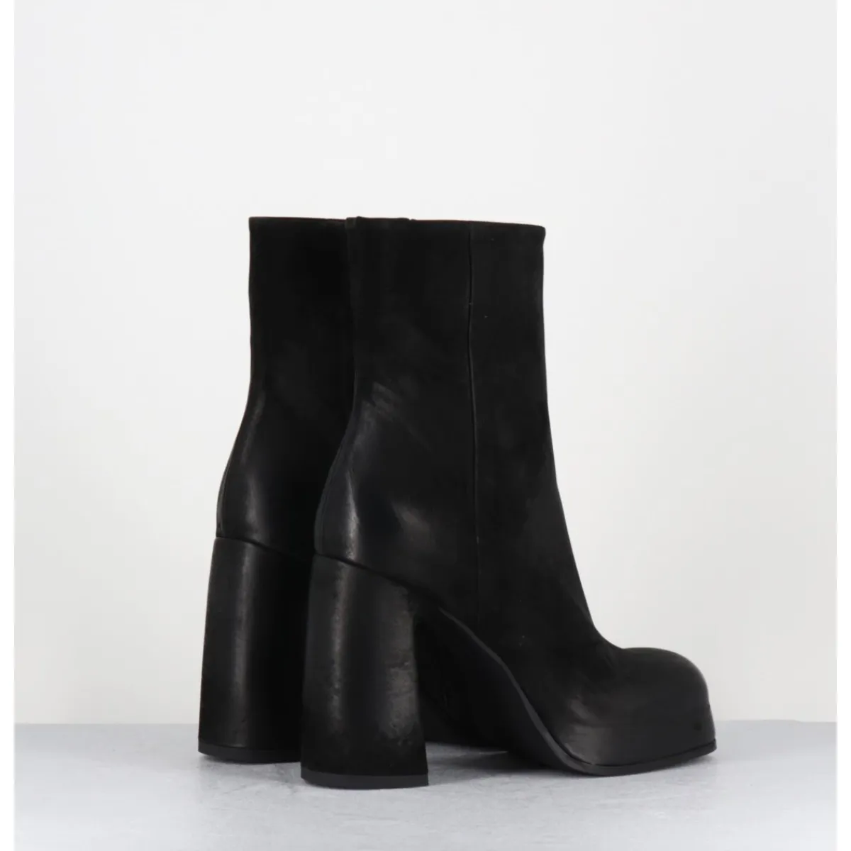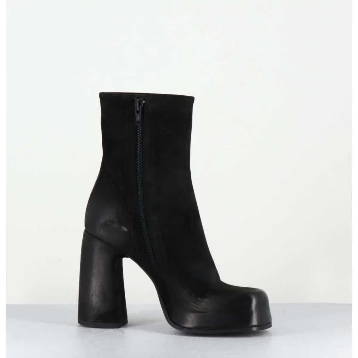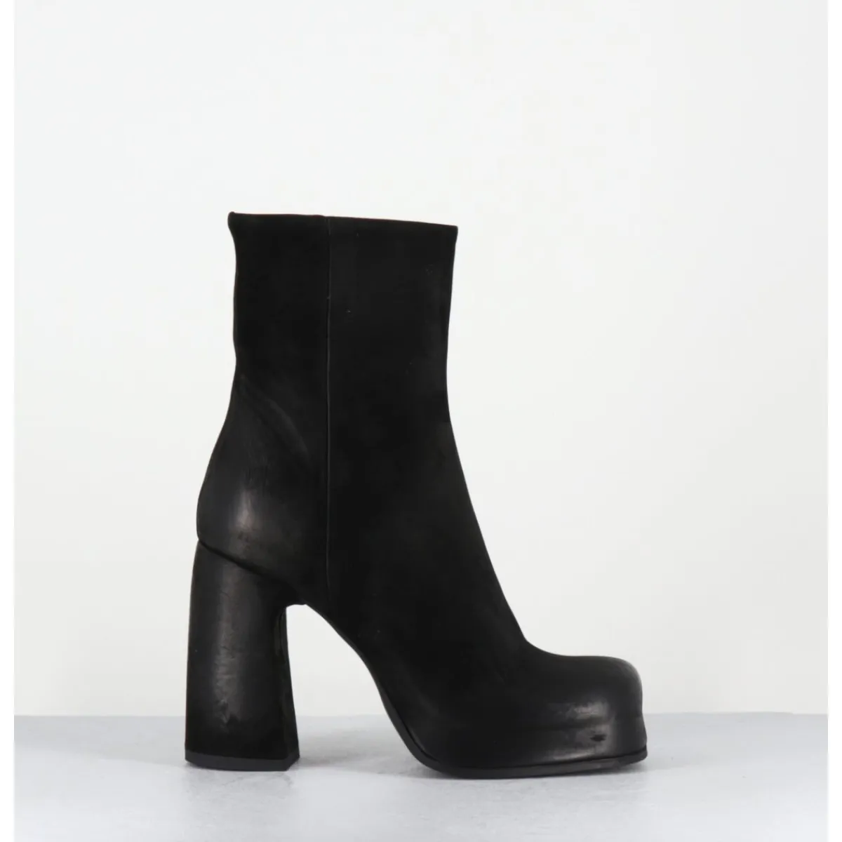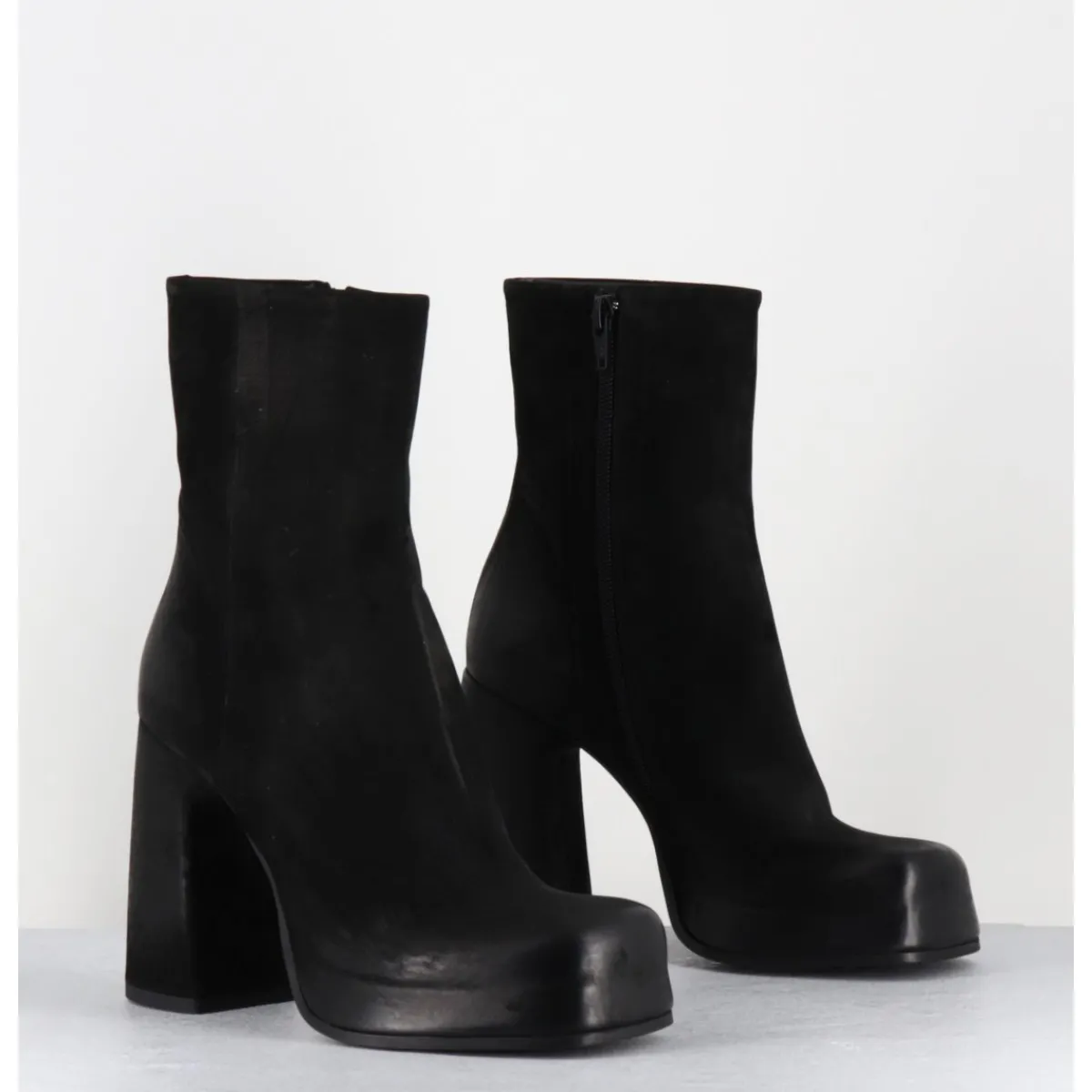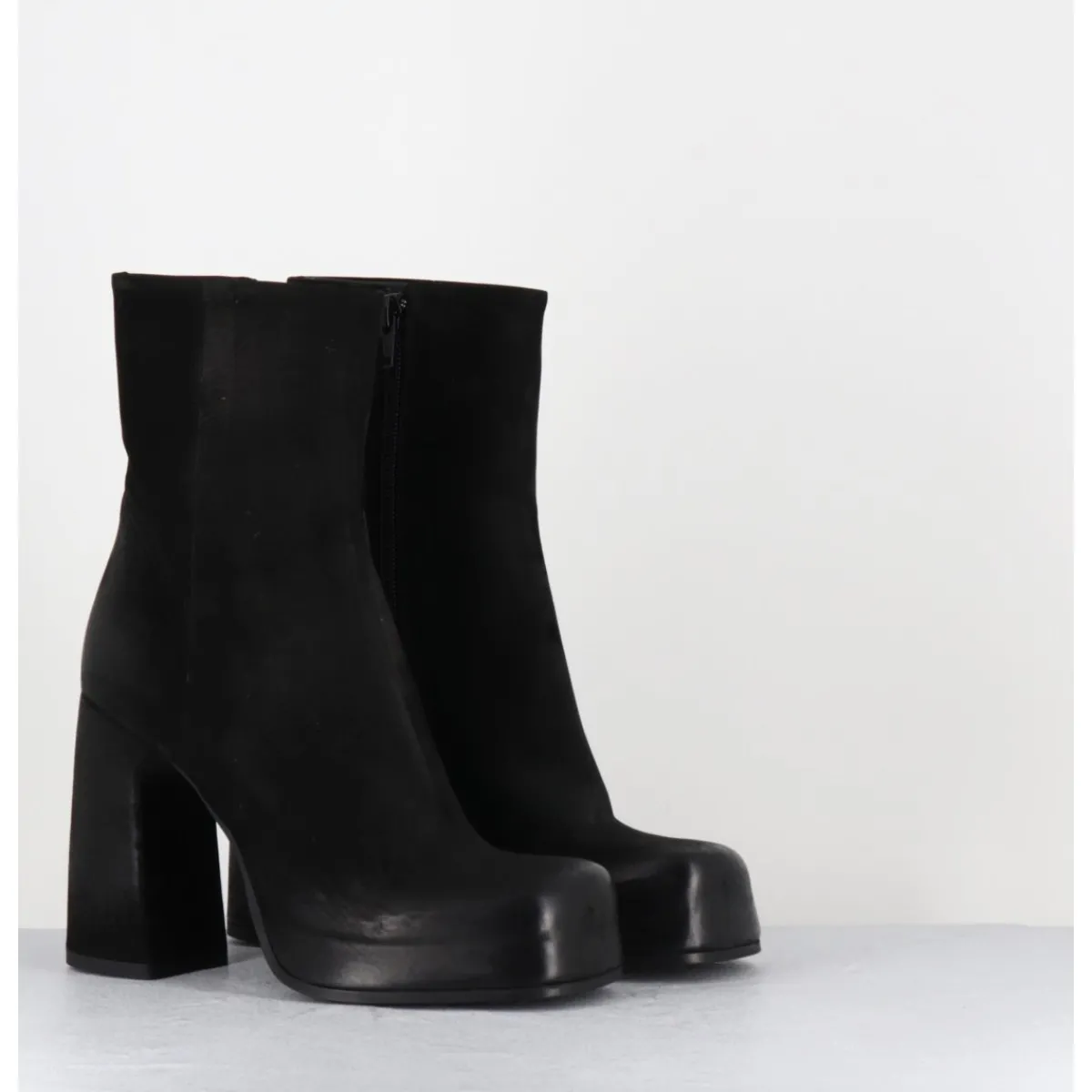 Boots à plateforme en cuir nubuck gras noir, bout carré arrondi, montées sur un talon haut recouvert
