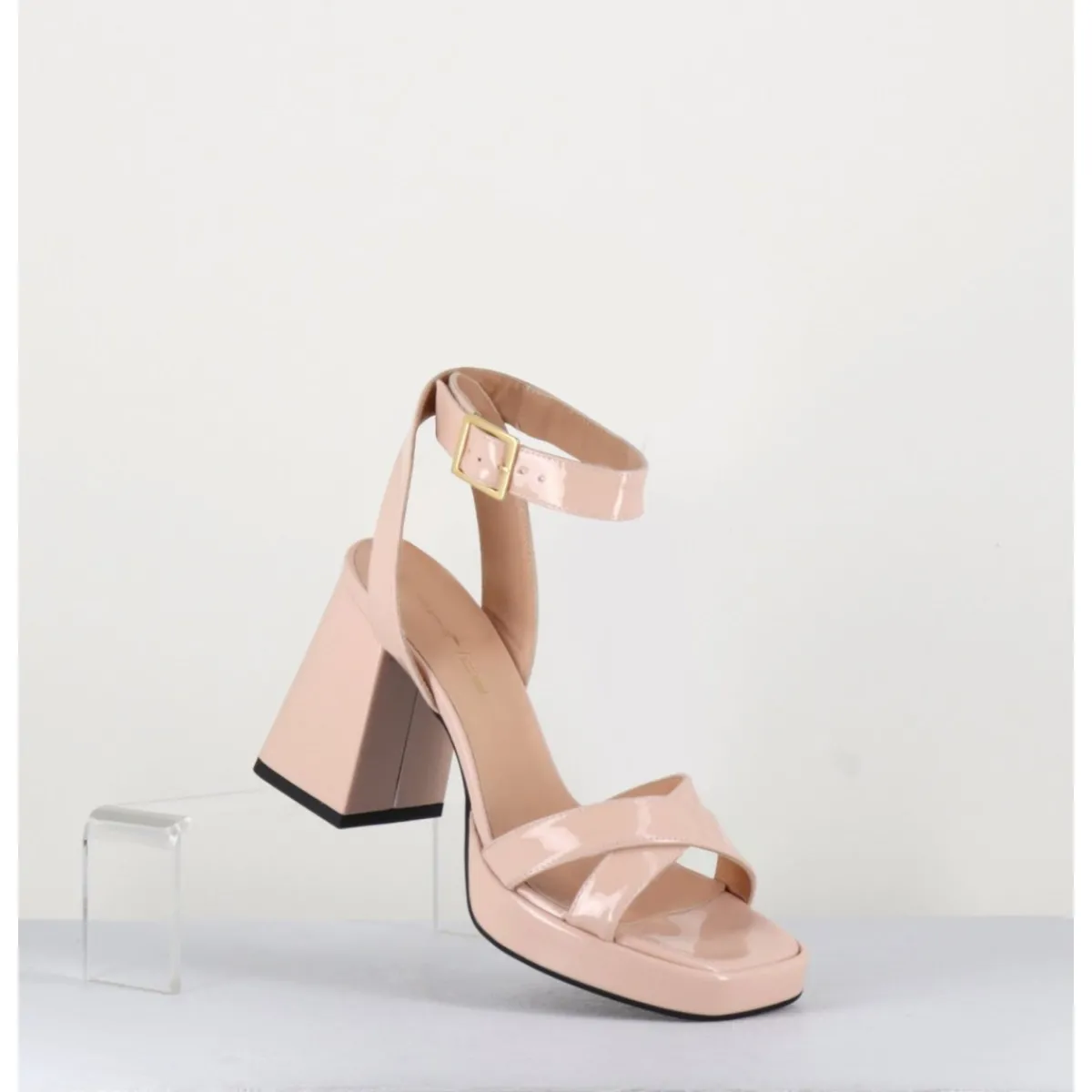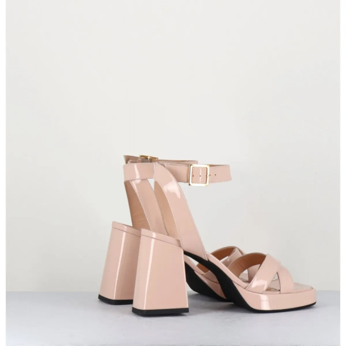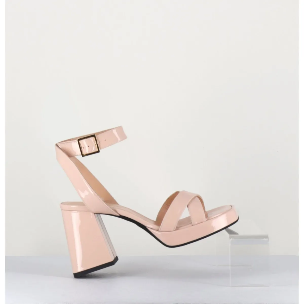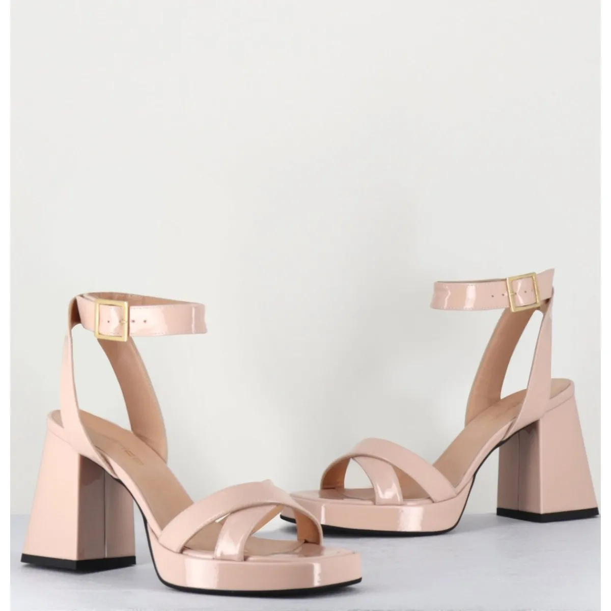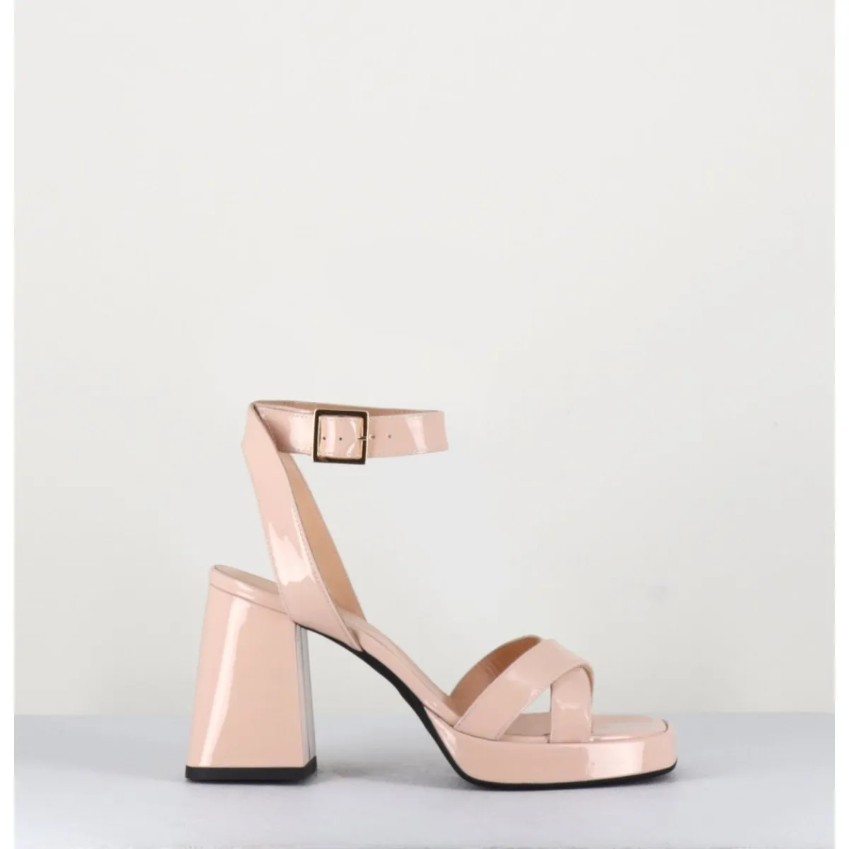Sandales à plateforme 90s bout carré en cuir vernis nude, bride cheville réglable, montées sur un talon large légèrement évasé.