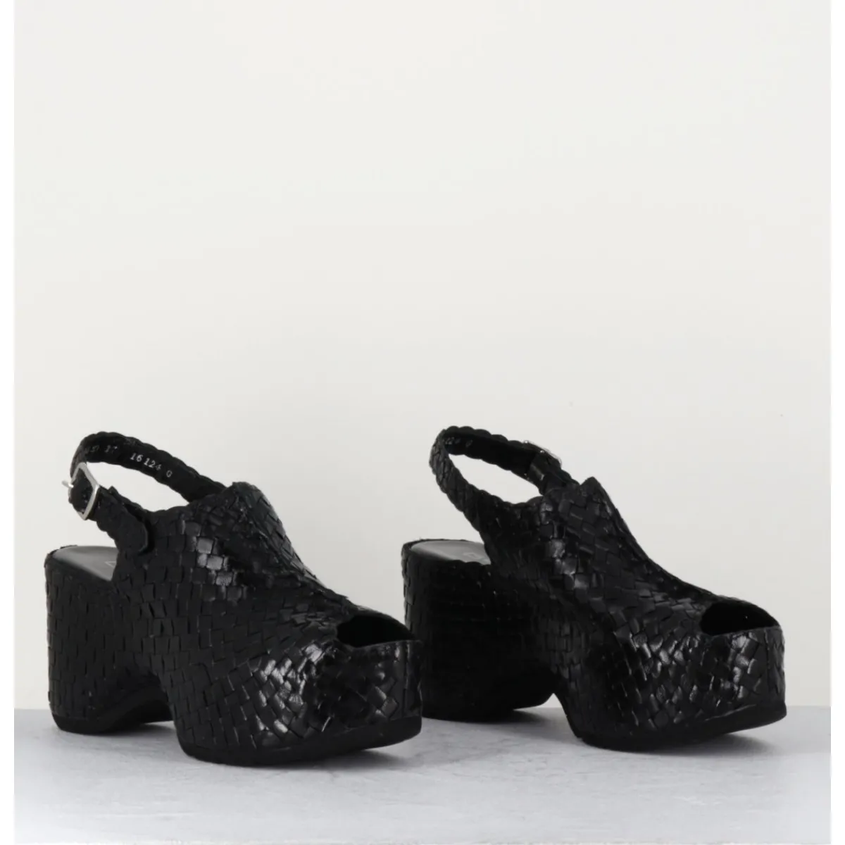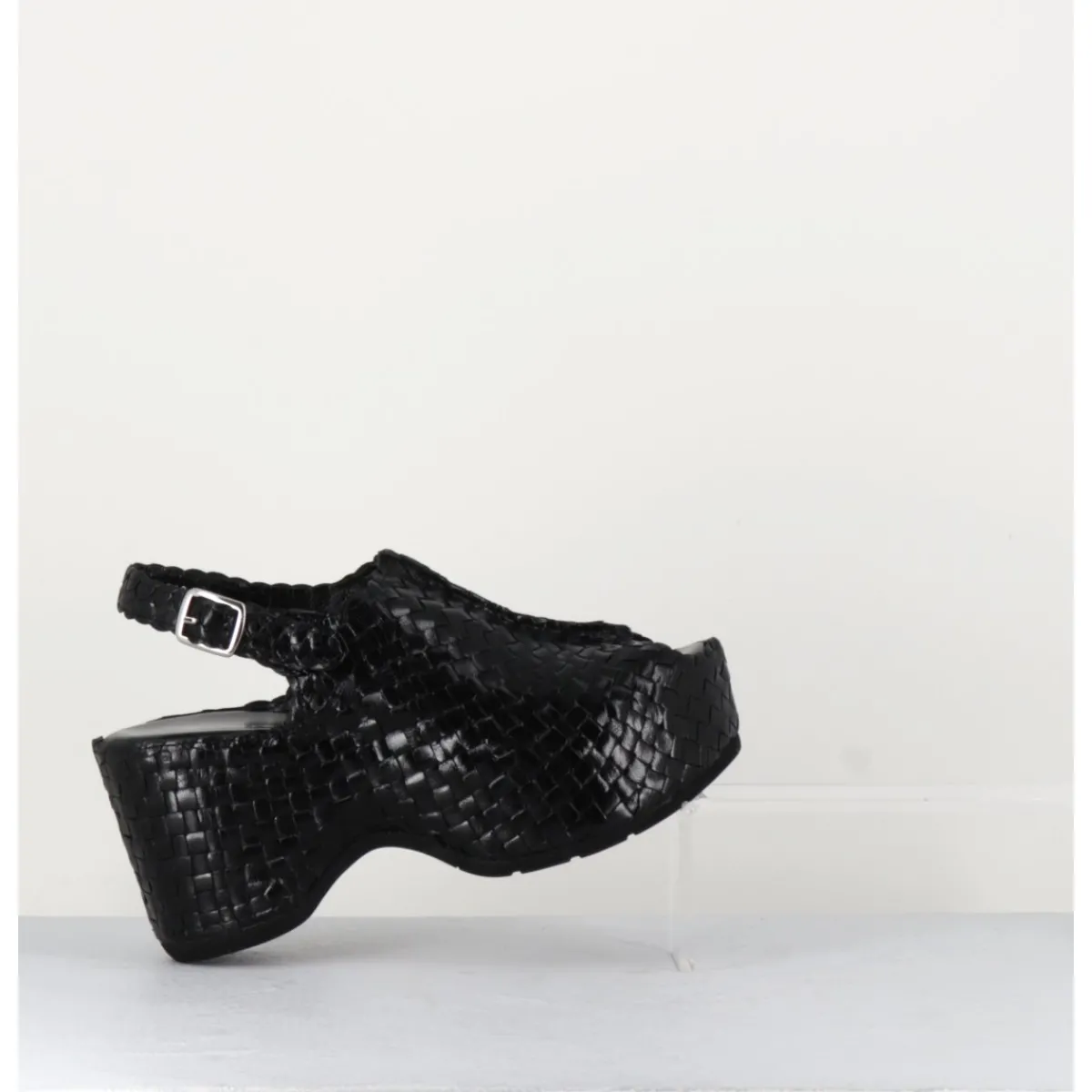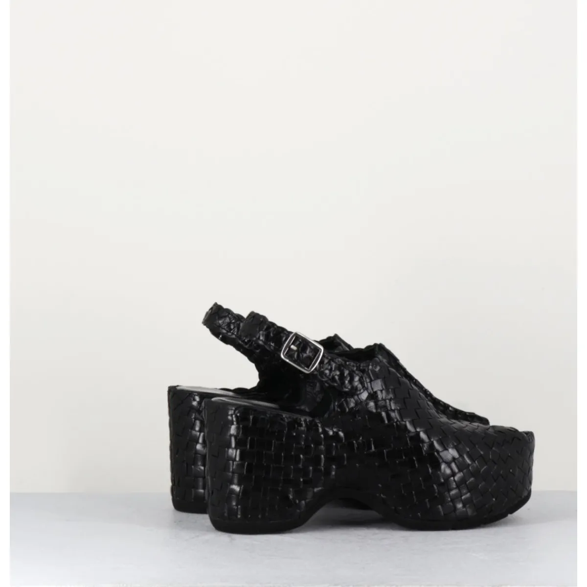 Sandales en cuir noir tressé, bout arrondi ouvert, bride arrière à boucle réglable, montées sur une semelle compensée ultra légère à talon large esprit 70s
