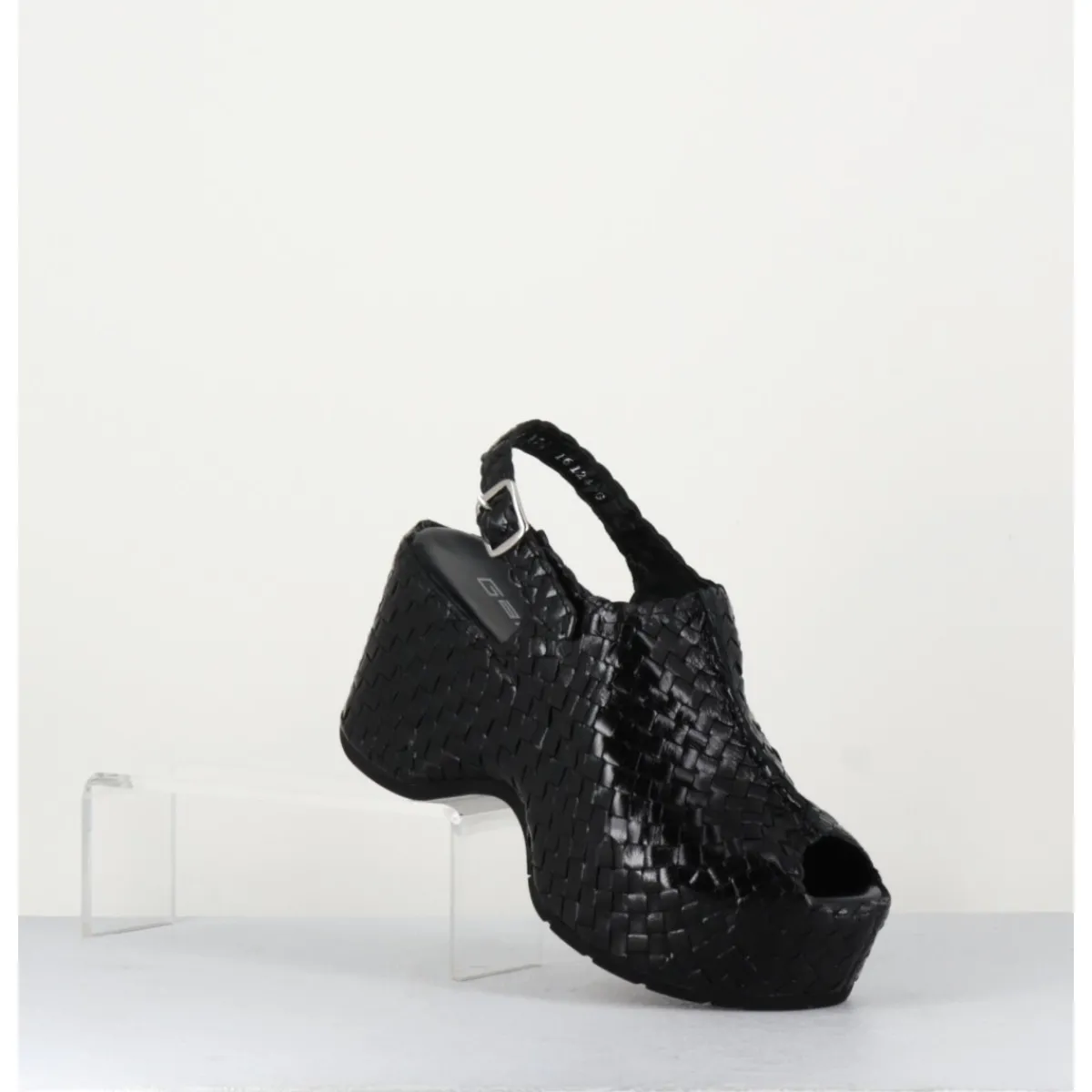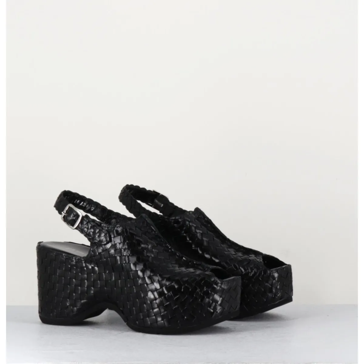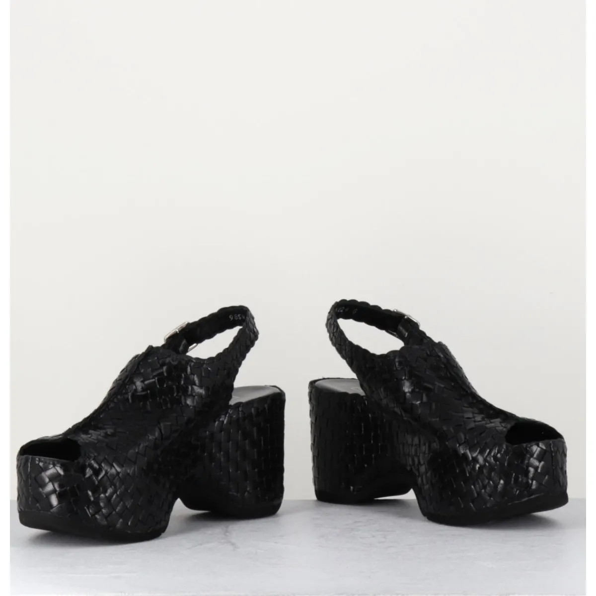 Sandales en cuir noir tressé, bout arrondi ouvert, bride arrière à boucle réglable, montées sur une semelle compensée ultra légère à talon large esprit 70s