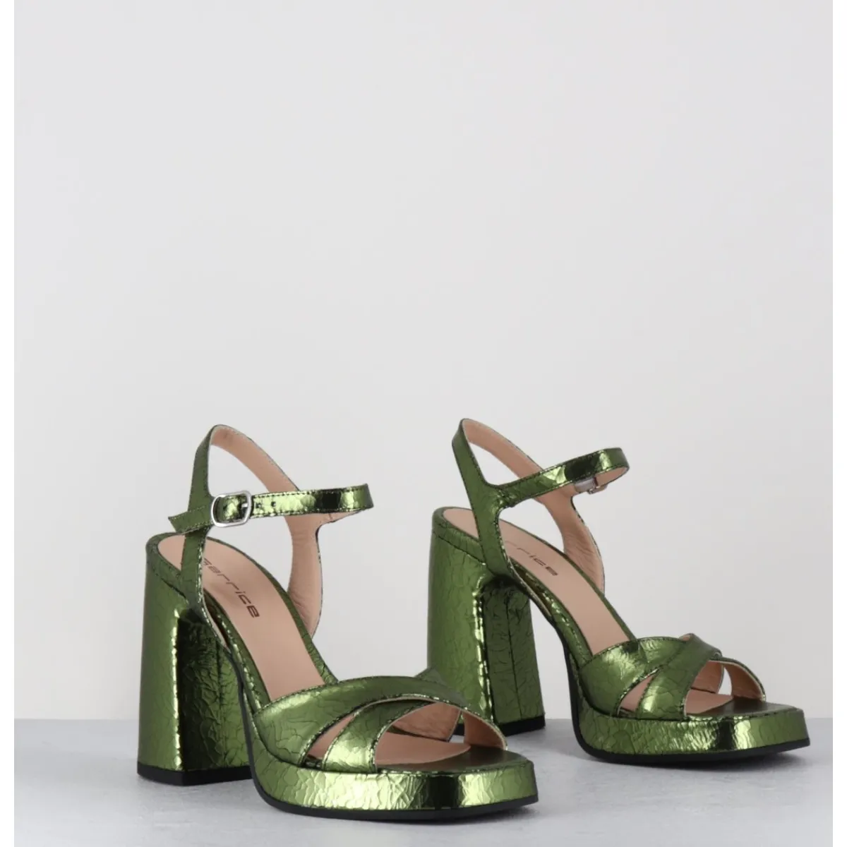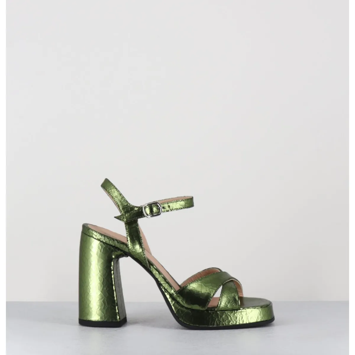 Sandales à plateforme en cuir effet craquelé vert, bout carré doux, ligne pure, montées sur un talon large stylisé confortable