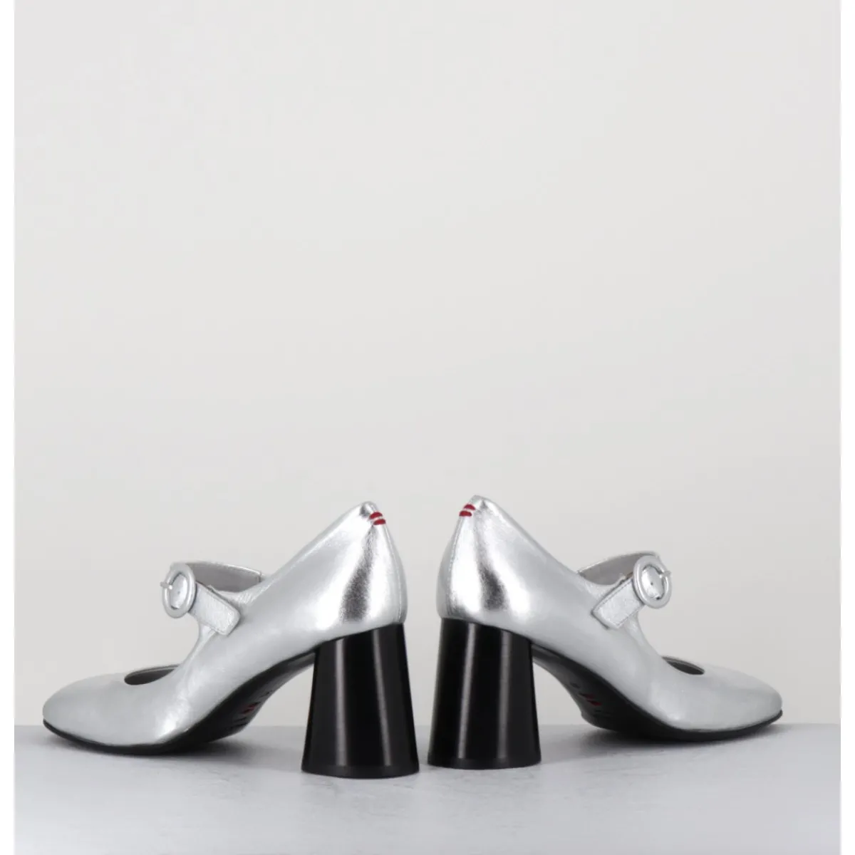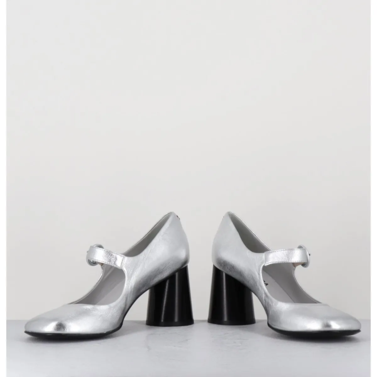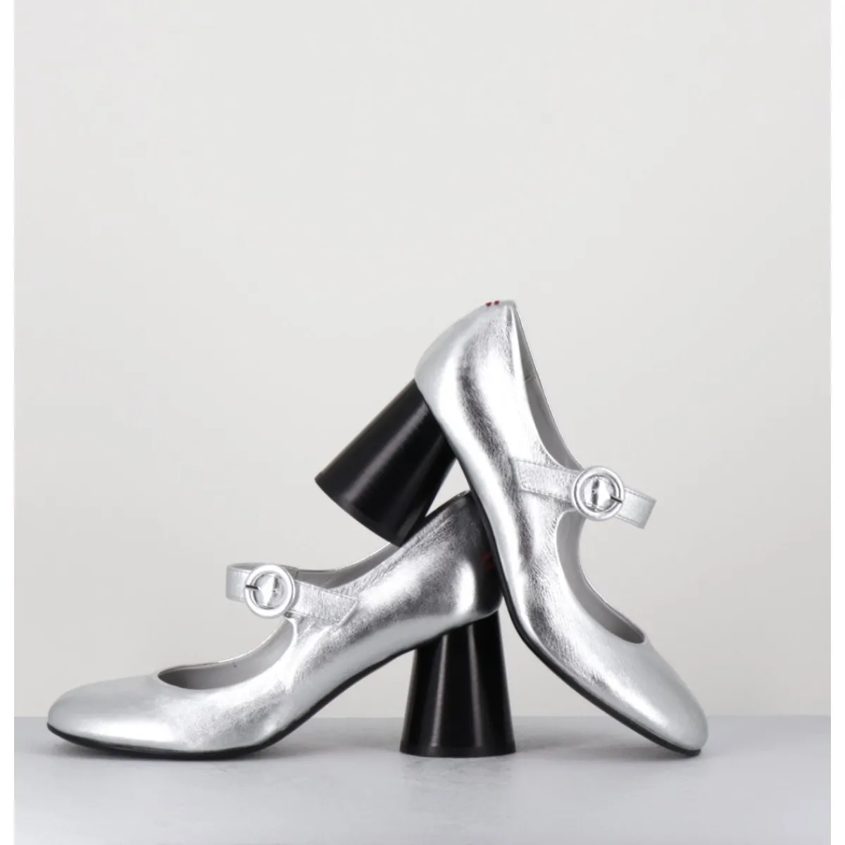 Babies à talon en cuir souple métallisé argent, bout très rond, bride cheville réglable, couture signature de la maison sur le contrefort, montés sur un talon cylindrique évasé peint à la main en noir.