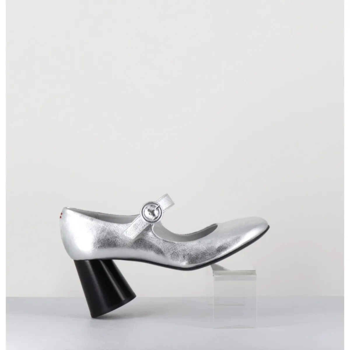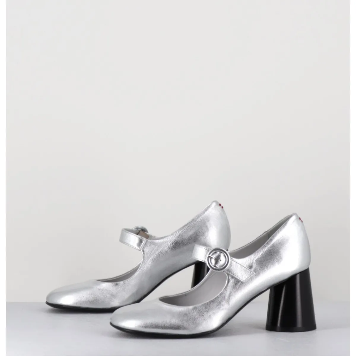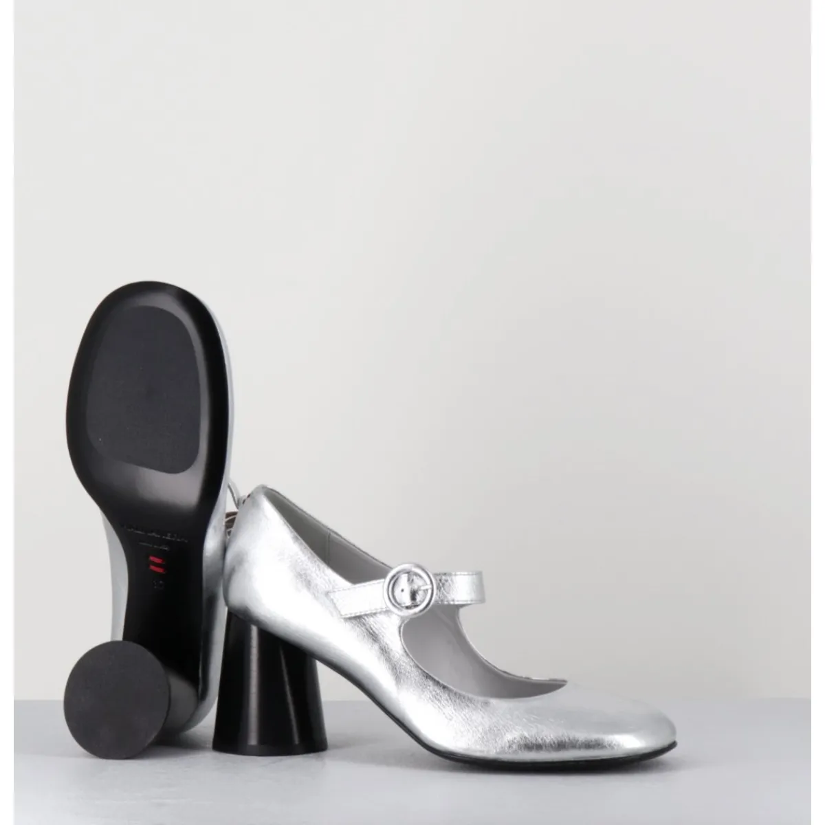 Babies à talon en cuir souple métallisé argent, bout très rond, bride cheville réglable, couture signature de la maison sur le contrefort, montés sur un talon cylindrique évasé peint à la main en noir.