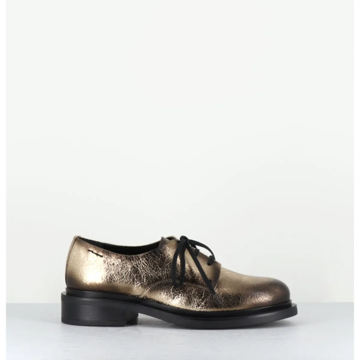 Derbies en cuir craquelé doré, bout arrondi, cuir patiné à la main pour un effet vintage donnant des reflets plus foncés