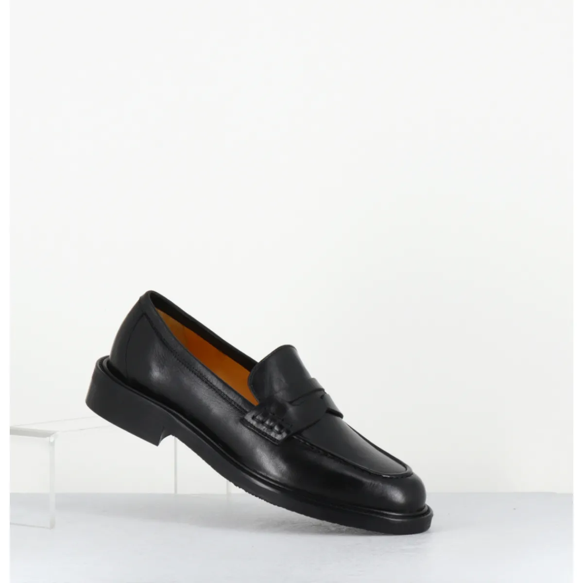 Mocassins plats en cuir noir extrêmement souple , ligne pure montées sur une semelle en gomme ultra légère