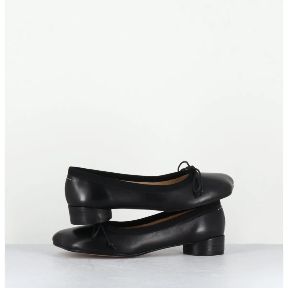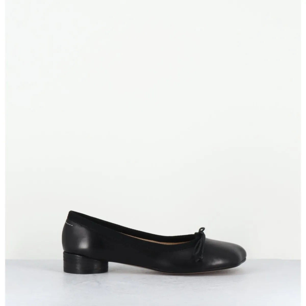 Ballerines look minimaliste en cuir noir souple, dotées d’un petit talon géométrique en pvc avec logo 6 imprimé sur la base. Ces chaussures arborent un bout anatomique, hommage au modèle iconique Tabi et un détail en forme de nœud, le tout complété à l’arrière de la célèbre surpiqûre horizontale de la Maison.