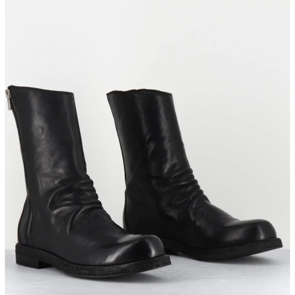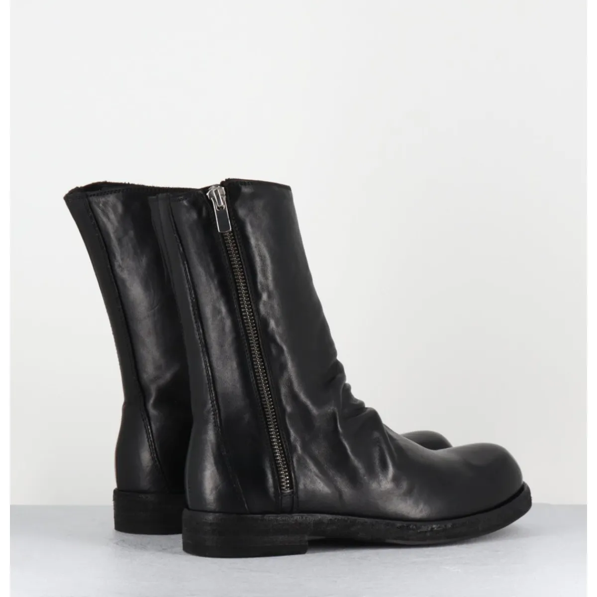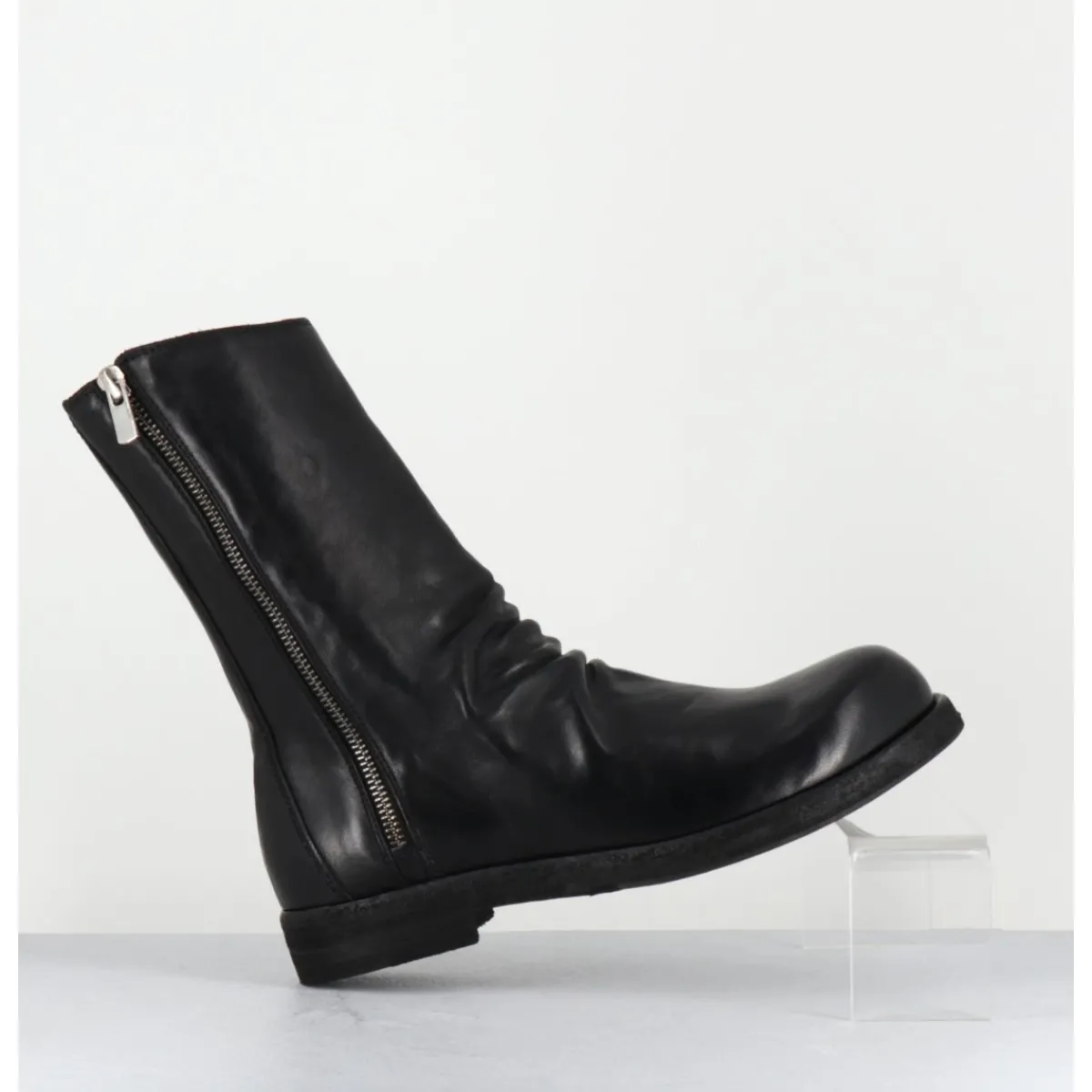 Boots en cuir noir cousue d’une seule pièce à l’avant, deep-dyed et lavé à la main pour un effet ‘vintage’, ligne pure à bout arrondi esprit Avant-Garde, zip asymétrique, montées sur une double semelle en cuir cousue avec un insert de gomme