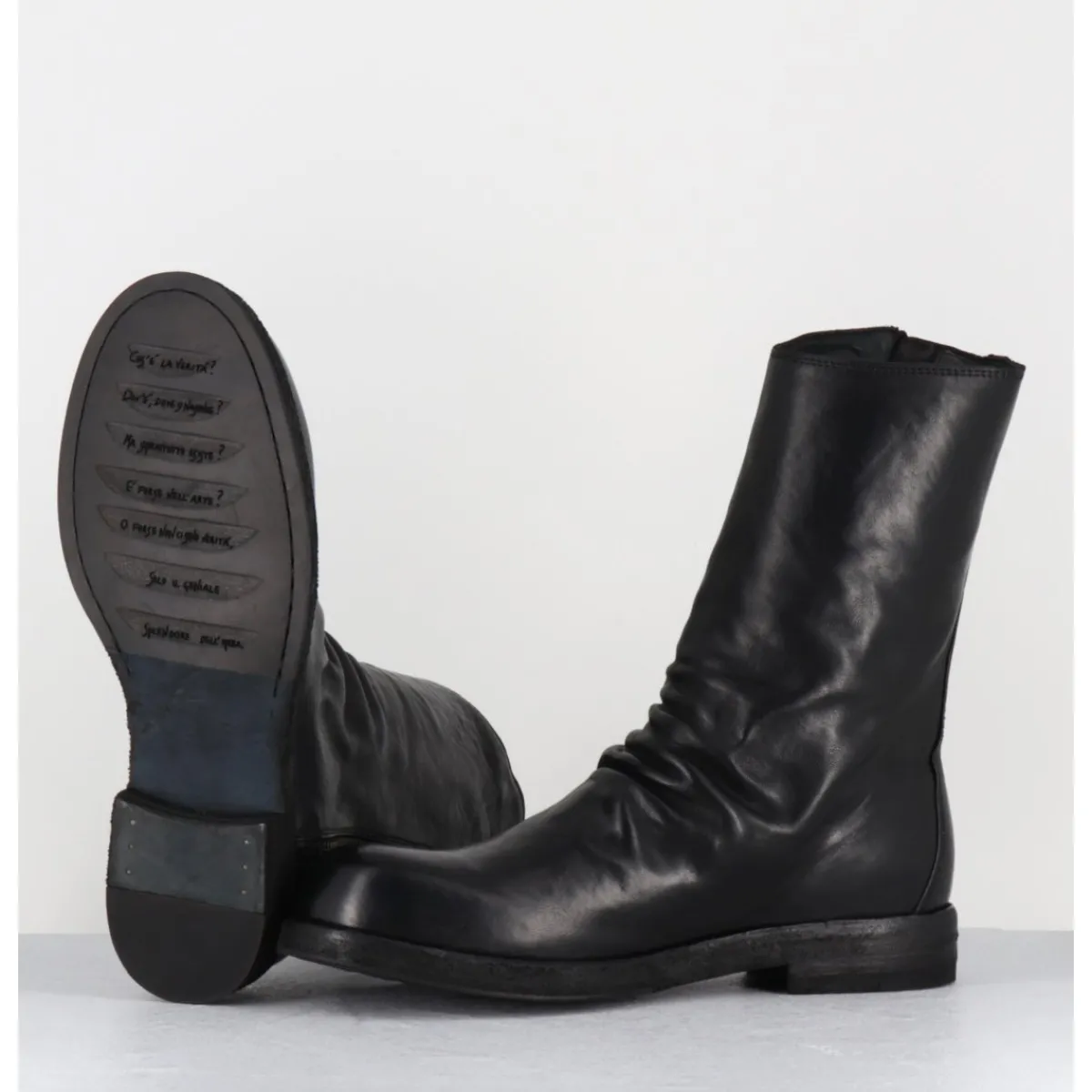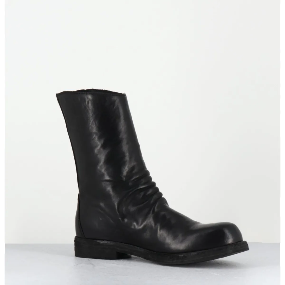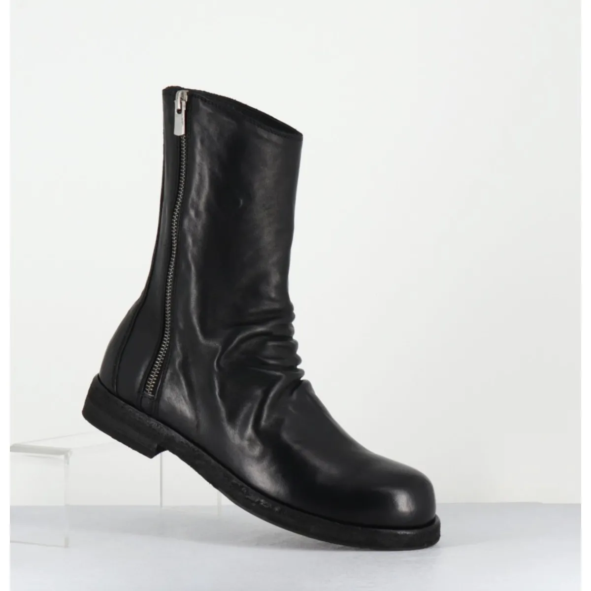 Boots en cuir noir cousue d’une seule pièce à l’avant, deep-dyed et lavé à la main pour un effet ‘vintage’, ligne pure à bout arrondi esprit Avant-Garde, zip asymétrique, montées sur une double semelle en cuir cousue avec un insert de gomme