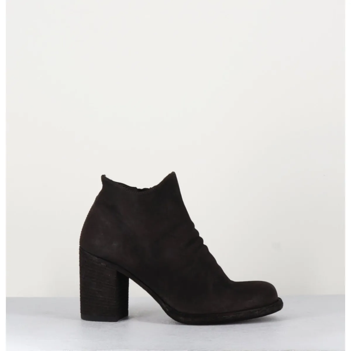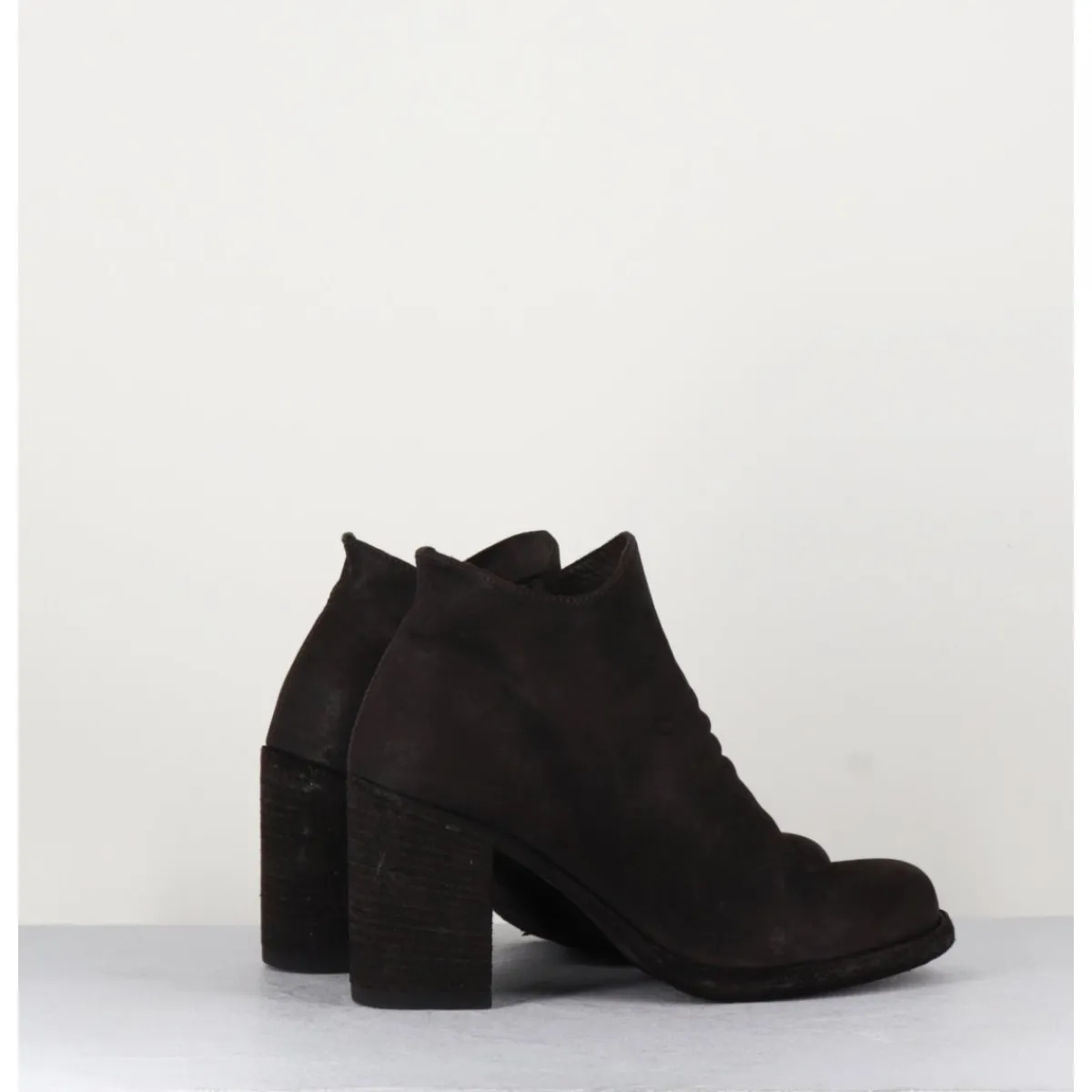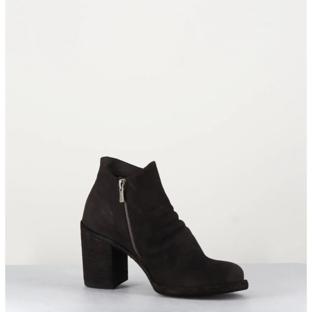 Boots en cuir huilé marron, tige très courte, bout en amande, zip intérieur, montée sur un talon bloc évasé en cuir effet bois.