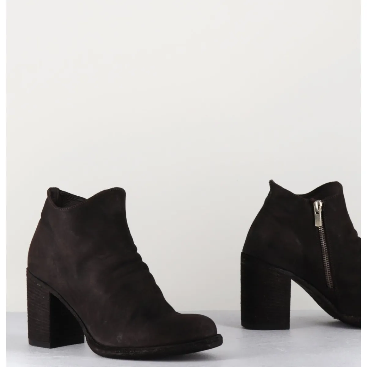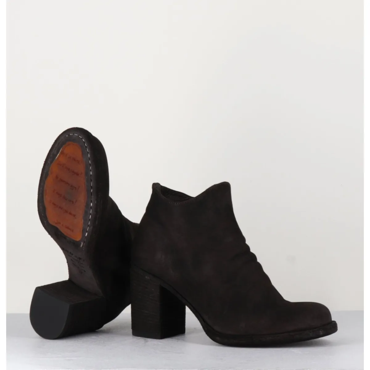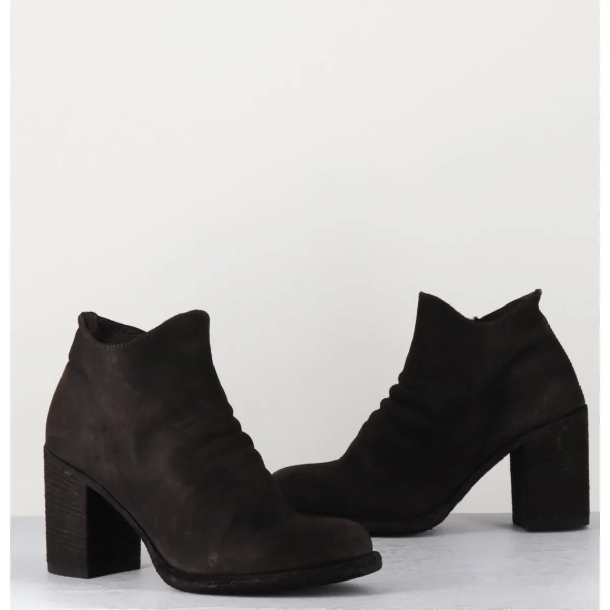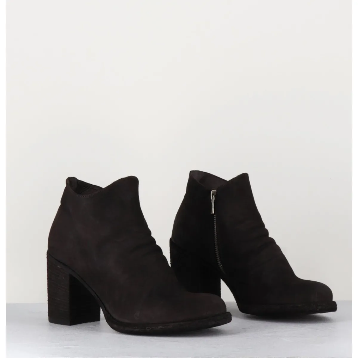 Boots en cuir huilé marron, tige très courte, bout en amande, zip intérieur, montée sur un talon bloc évasé en cuir effet bois.