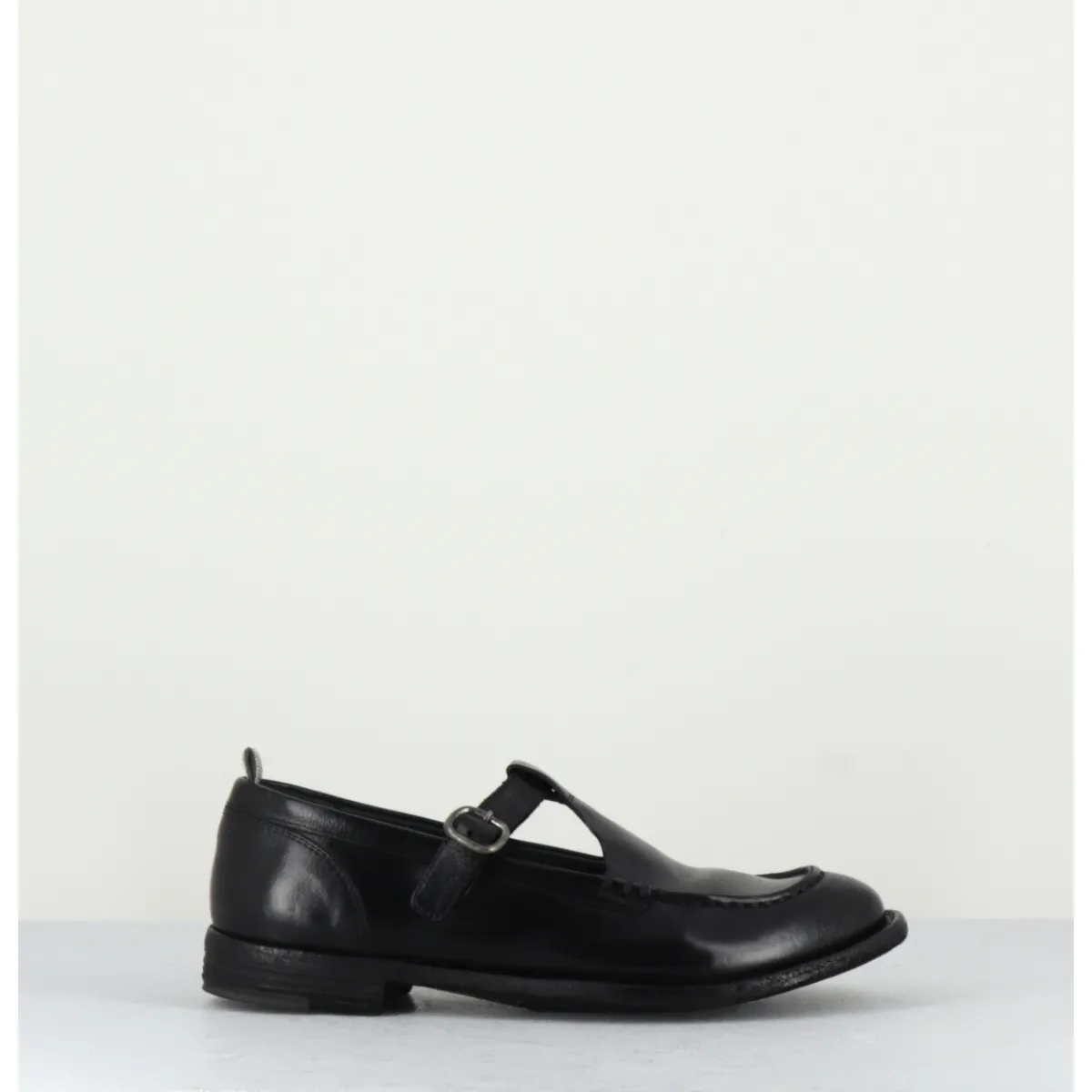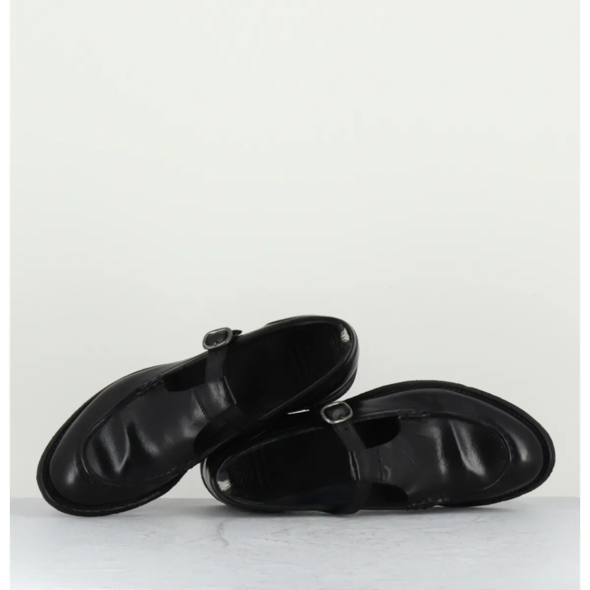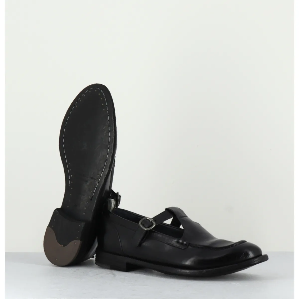 Black leather Mary-Jane shoes with adjustable silver buckle, almond toe, mounted on a flexible hand-sewn sole with gum insert.