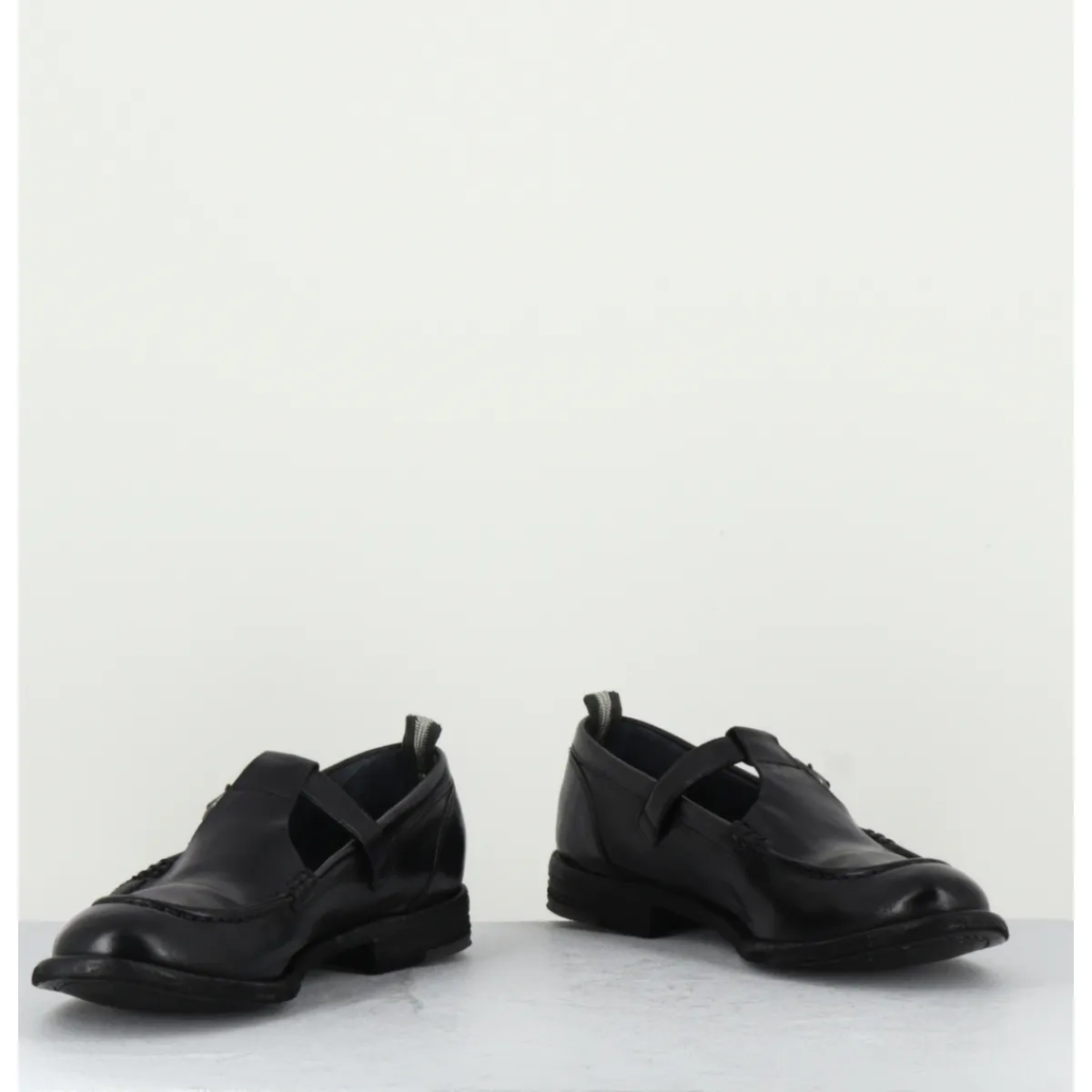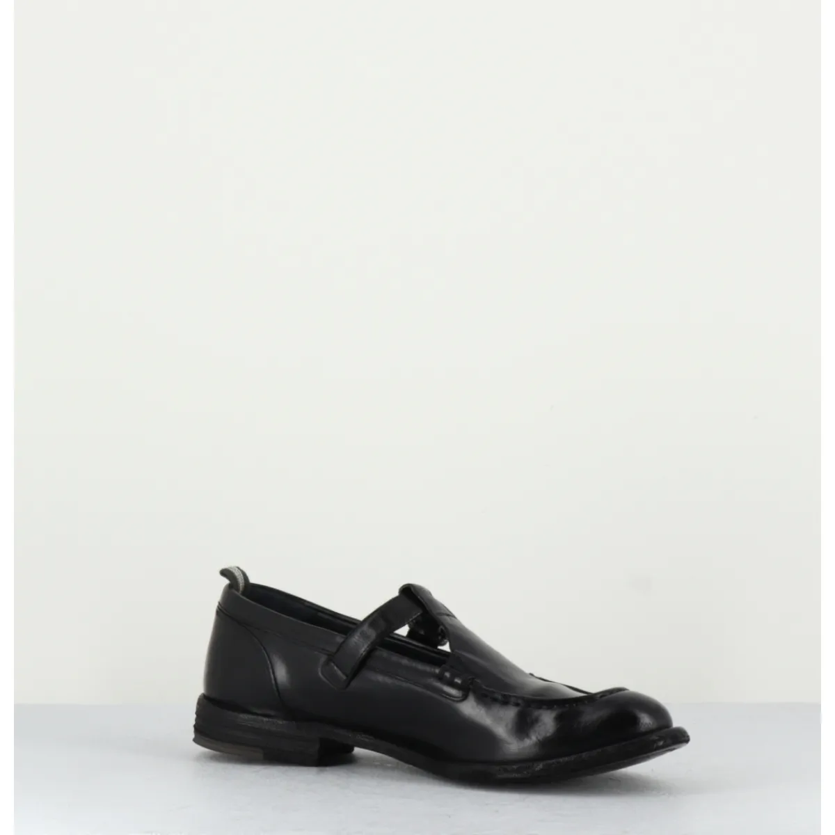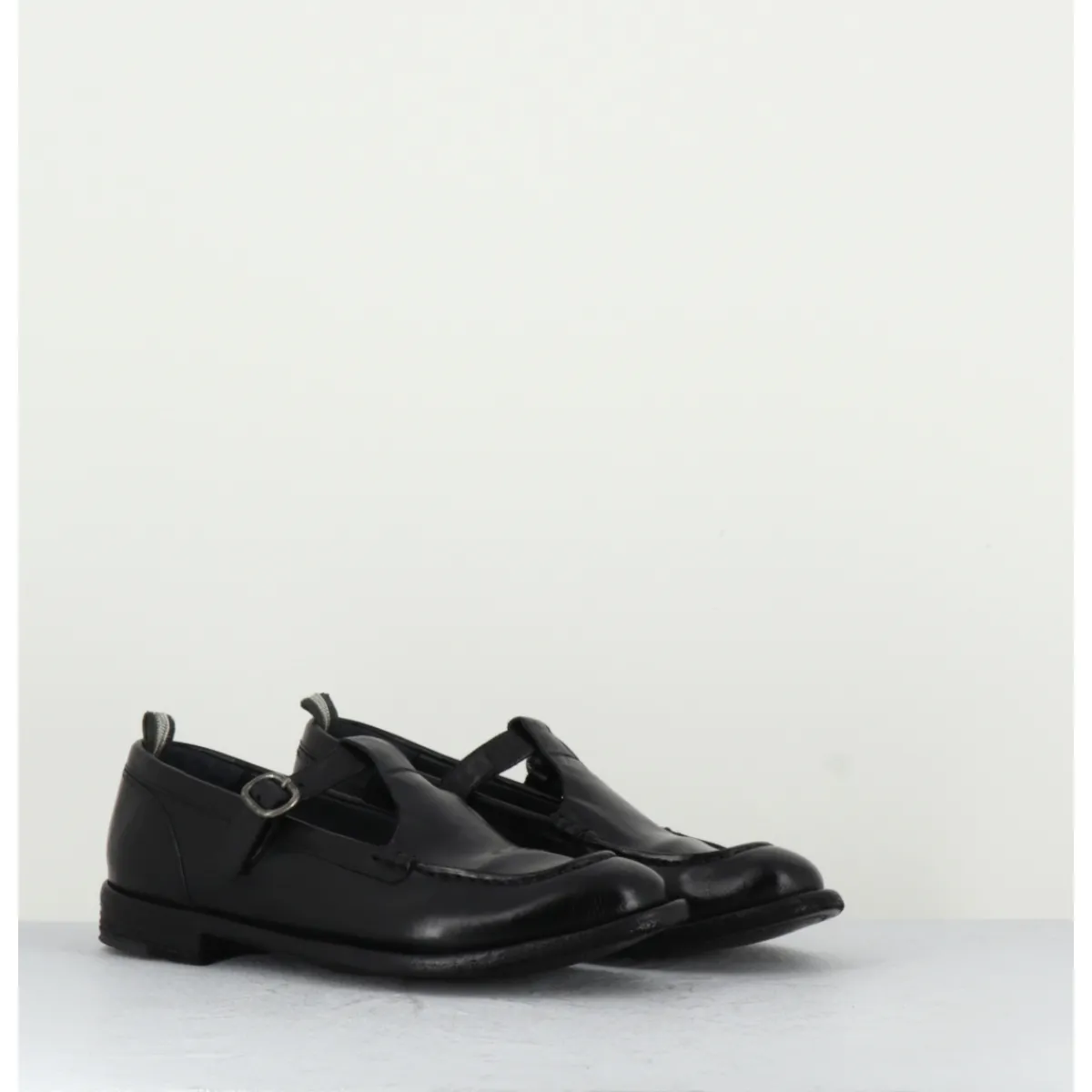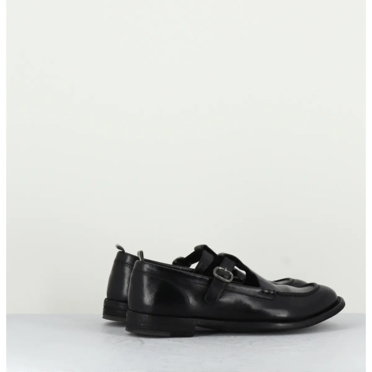 Black leather Mary-Jane shoes with adjustable silver buckle, almond toe, mounted on a flexible hand-sewn sole with gum insert.