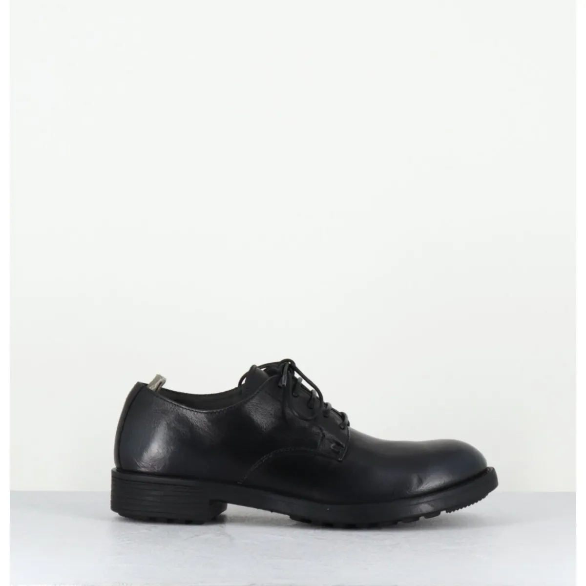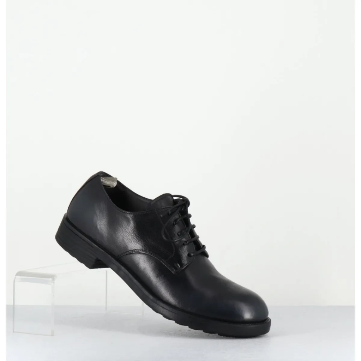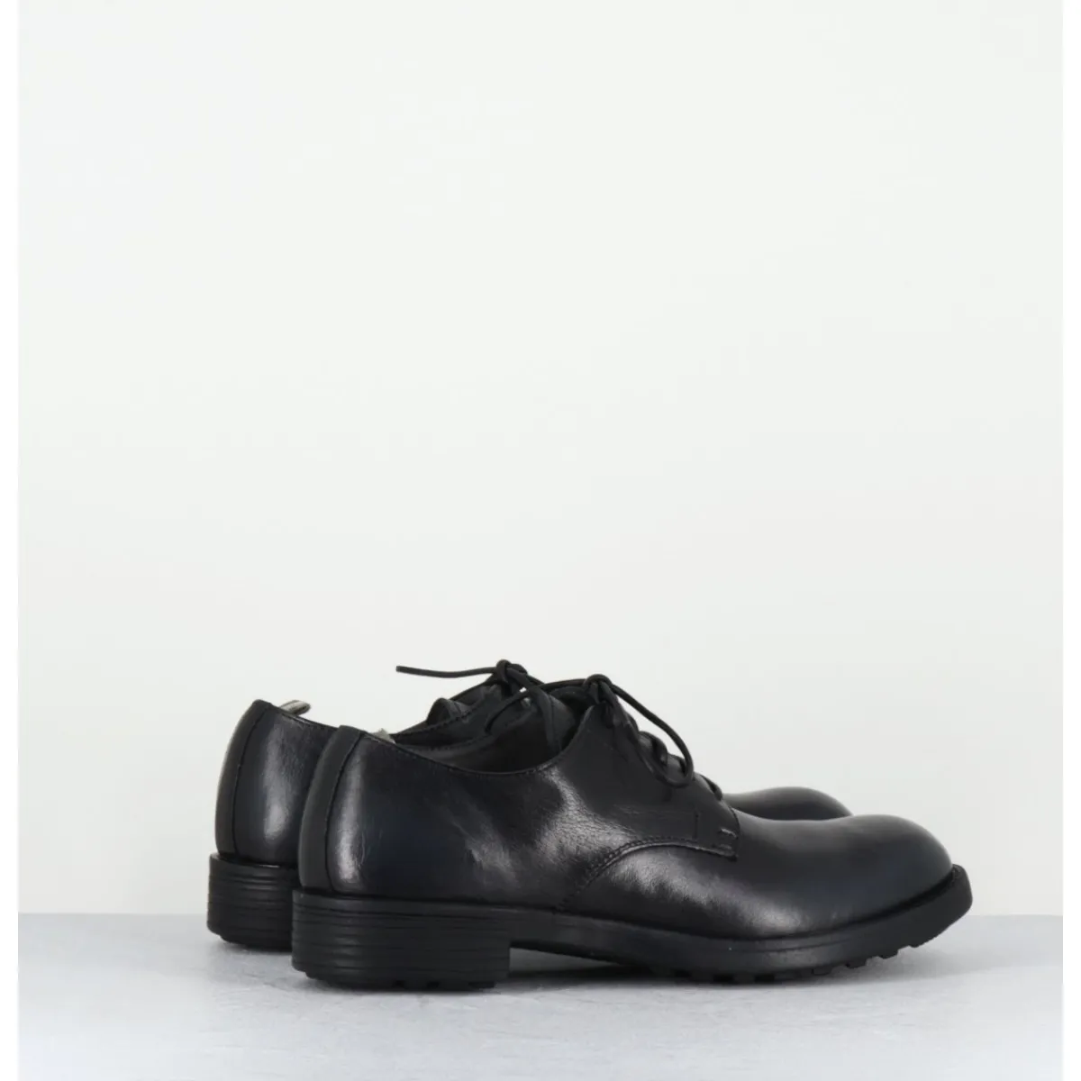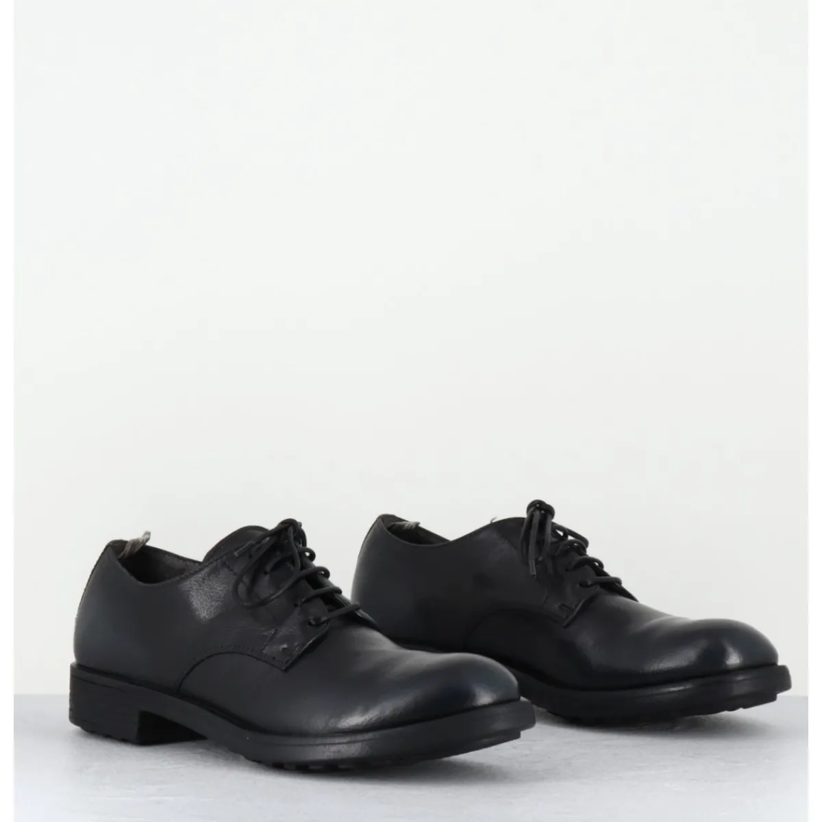 Derby à lacets en cuir noir brossé au bleu, ligne pure à bout rond, montées sur une nouvelle semelle cousue réalisée entièrement en caoutchouc naturel résistante pour une absolue légèreté et flexibilité