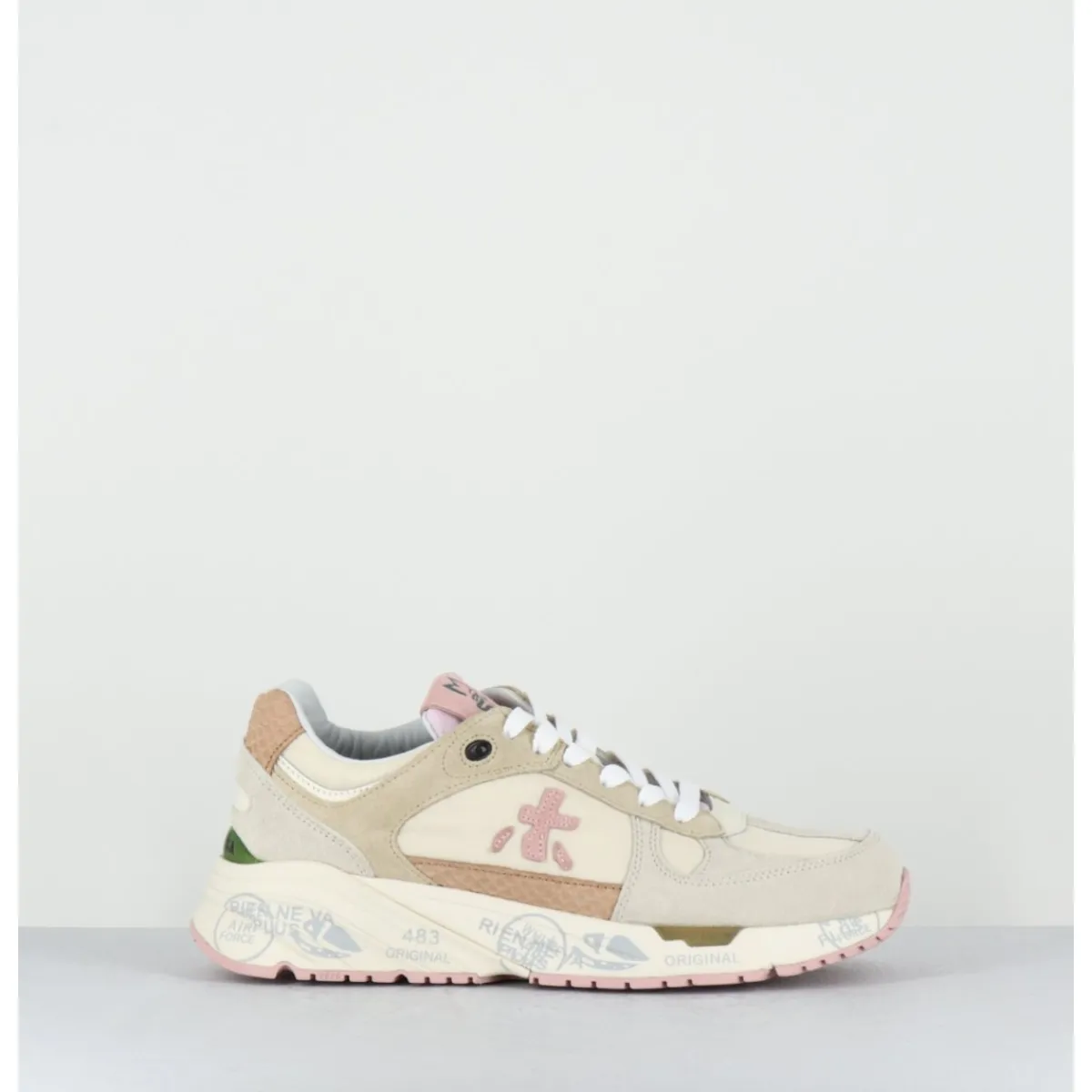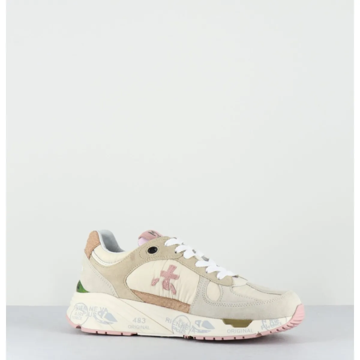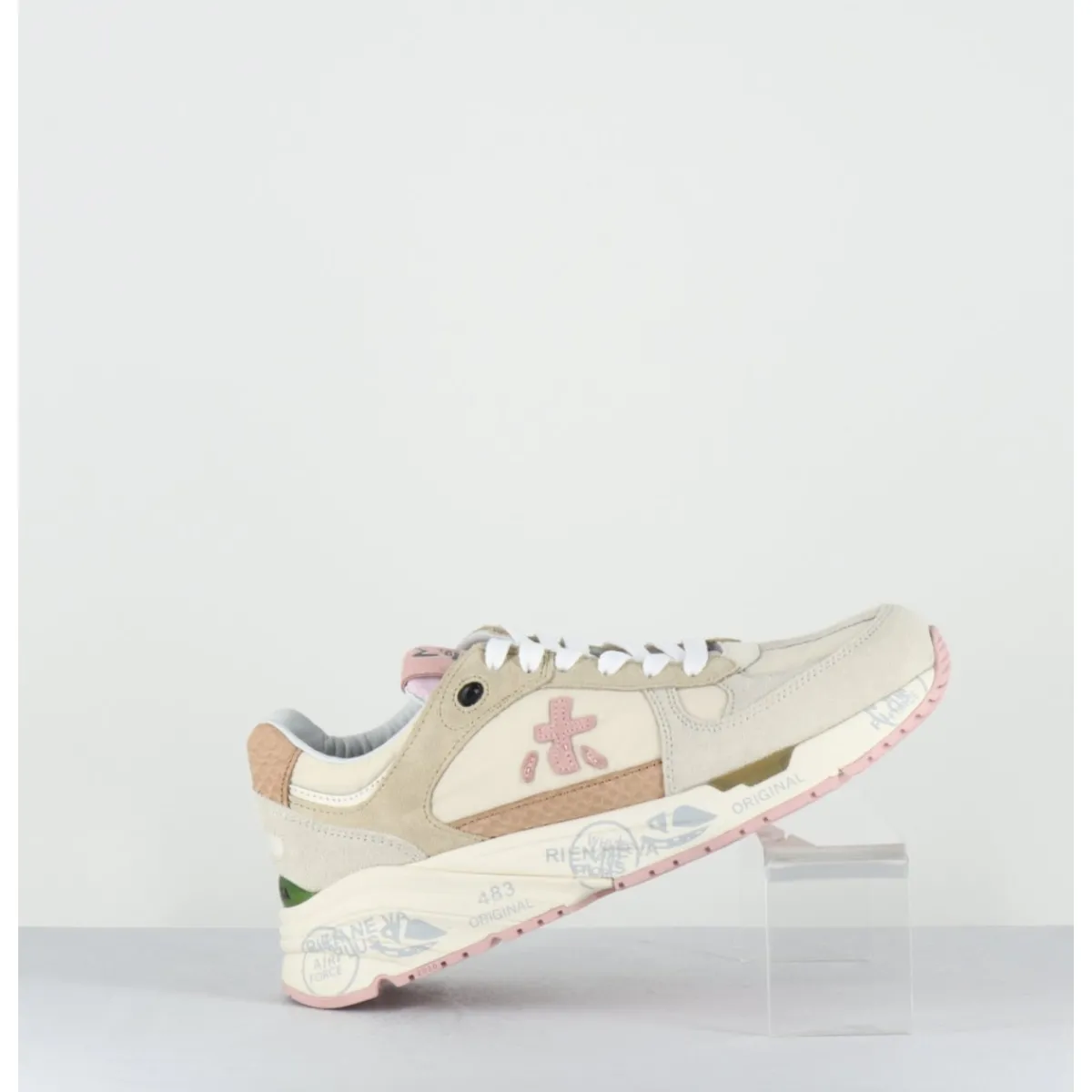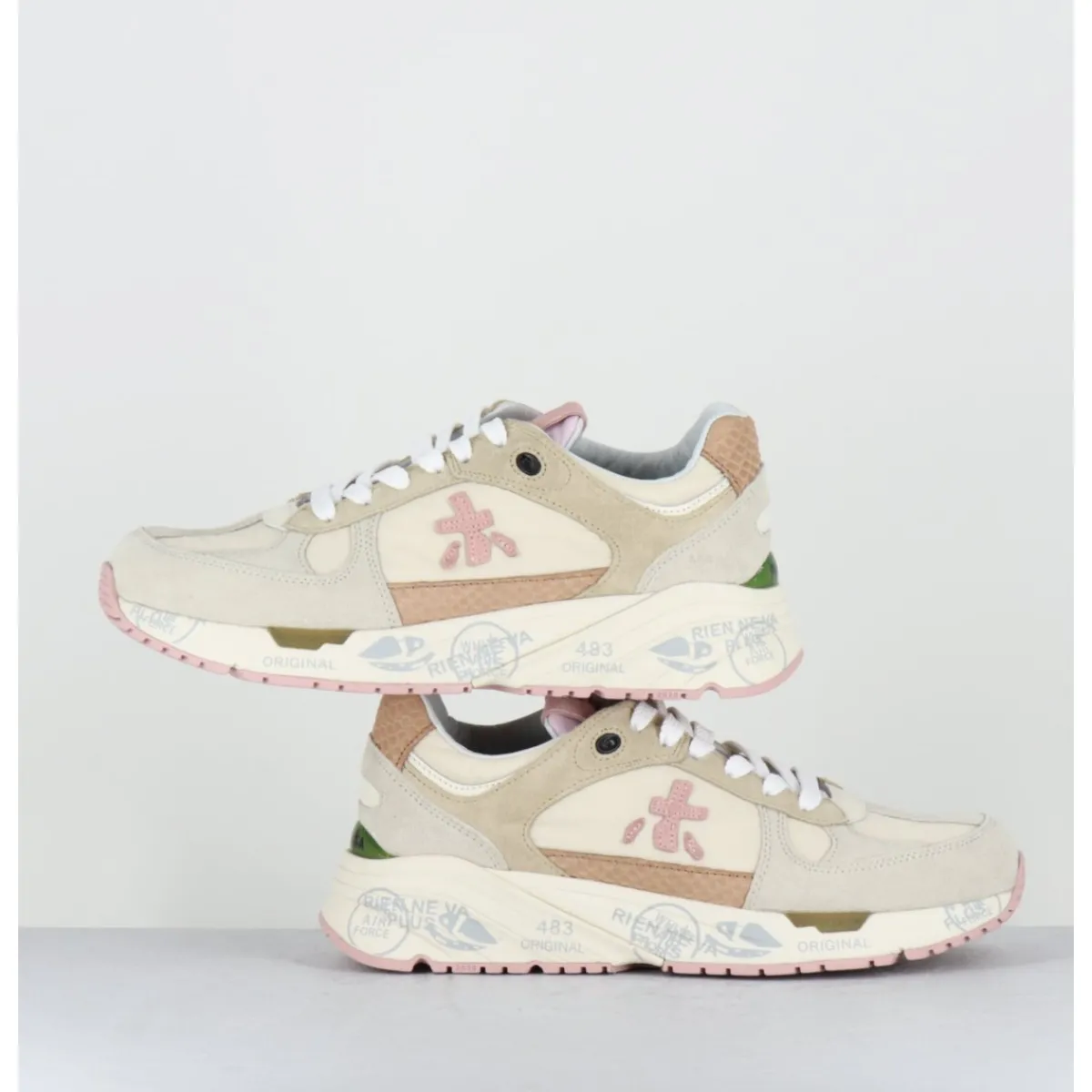 Sneakers esprit années 90 en cuir & textile camaieu de beige & rose pale, détails imprimé reptile, montées sur une semelle épaisse blanche en gomme, avec imprimé signature de la Maison Italienne Premiata.