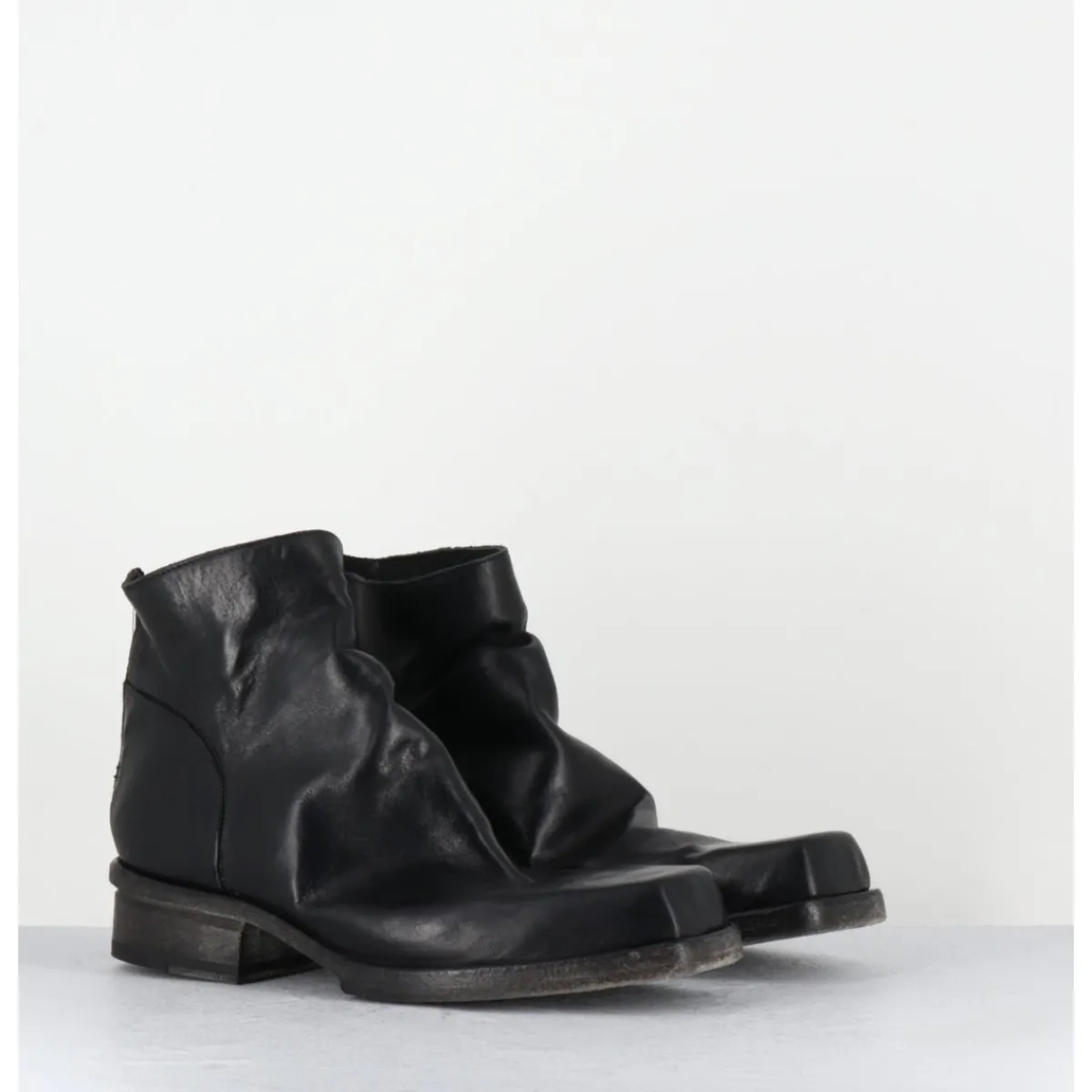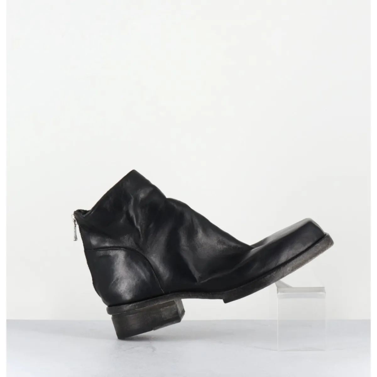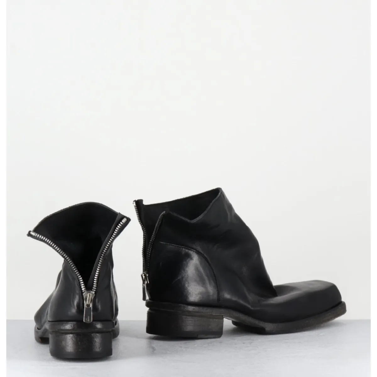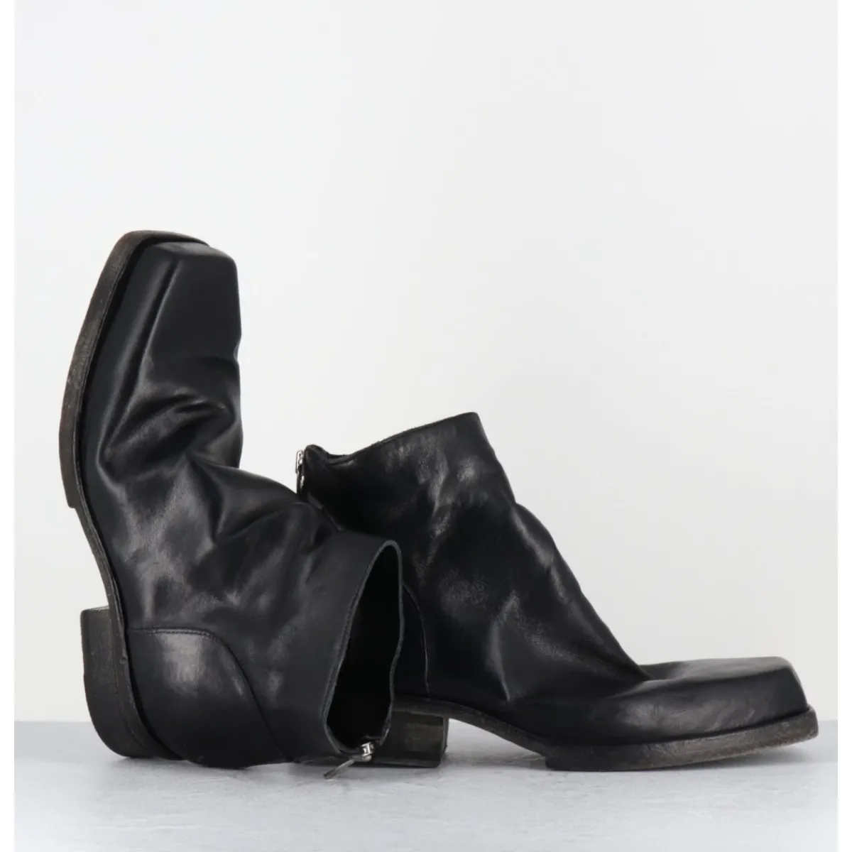 Boots en cuir noir en partie non doublé, lavé à la main pour un effet vintage « usé », zip arrière, ligne pure brutaliste à bout carré, tige courte, montées sur une double semelle en cuir cousue intégral et un petit talon bloc confortable