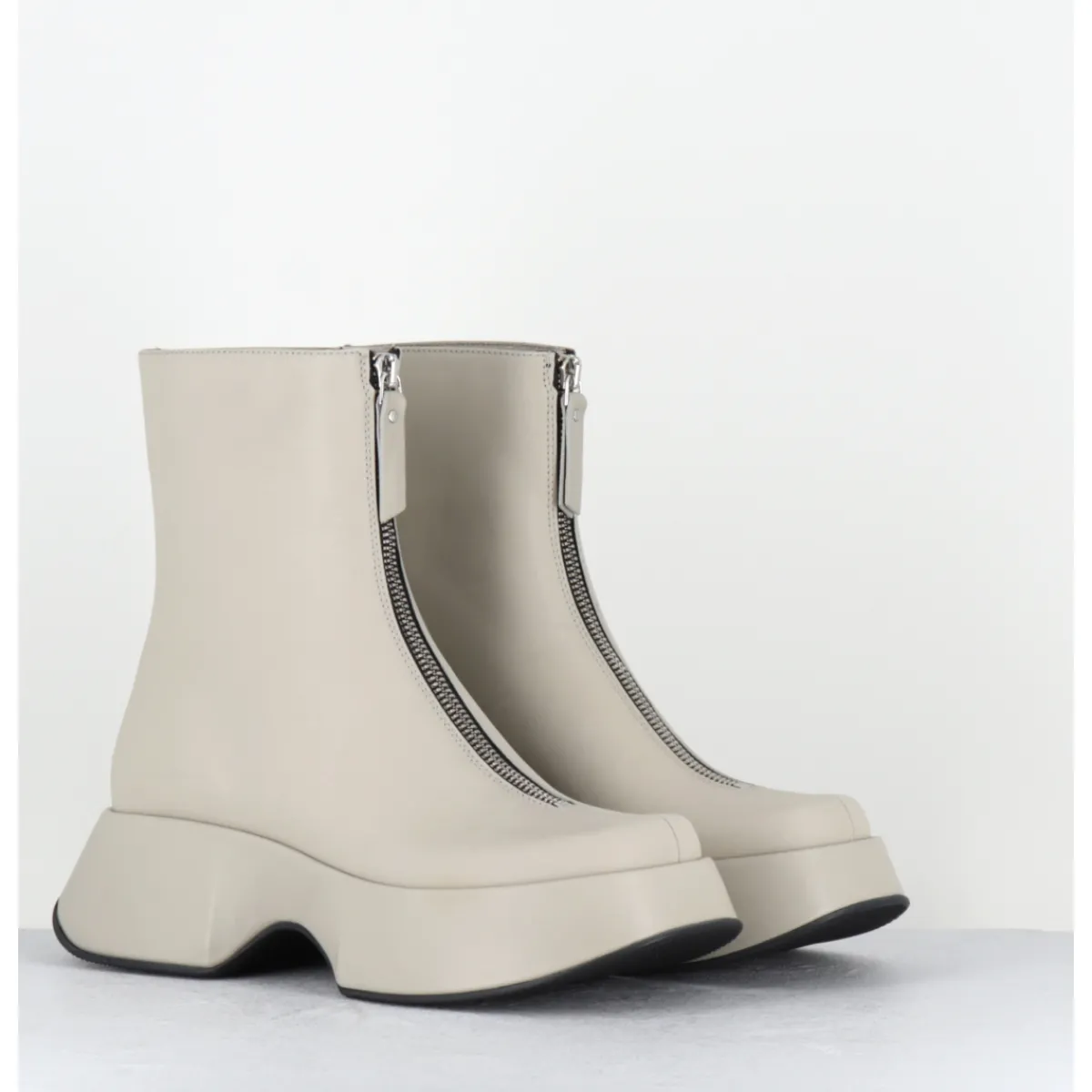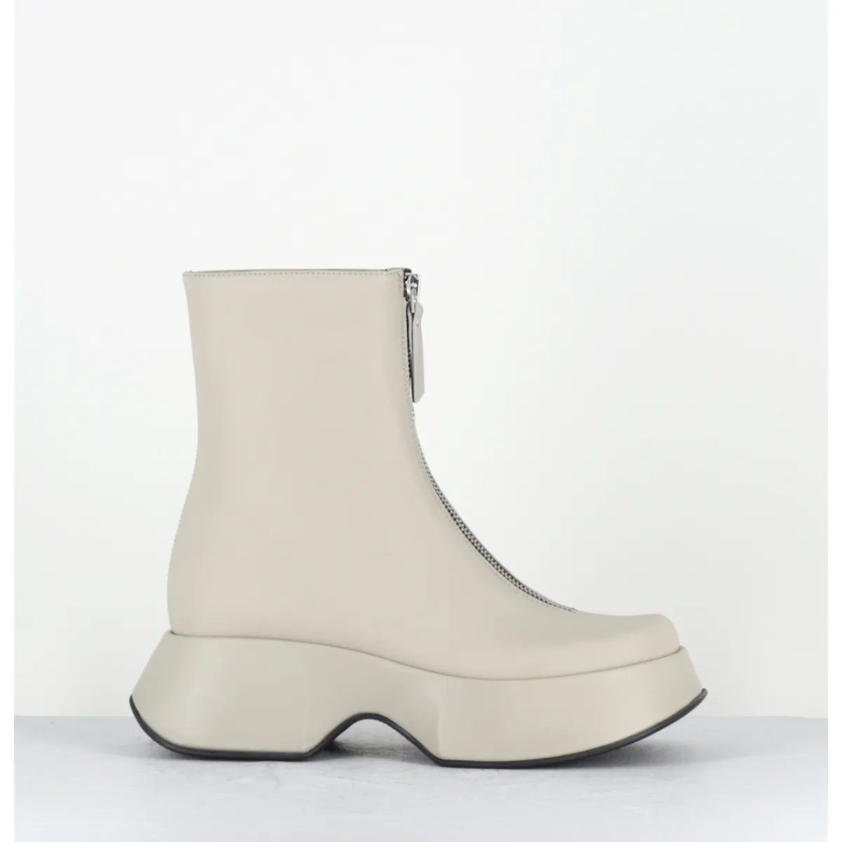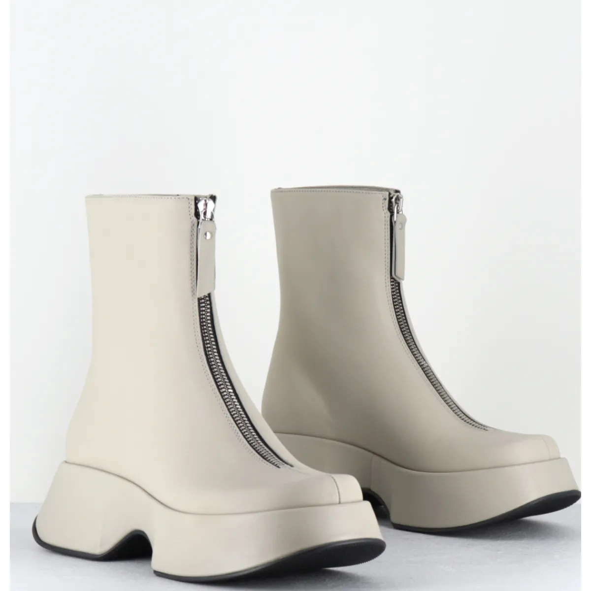 Boots en cuir blanc cassé, zip central, montées sur une plateforme bloc légère