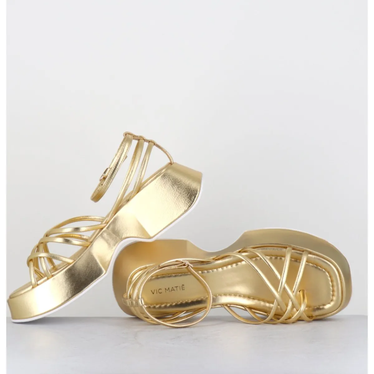 Sandales compensées en cuir métallisé doré multi-brides & entre-doigts, montées sur une plateforme stylisée en micro fibre ultra légère recouverte