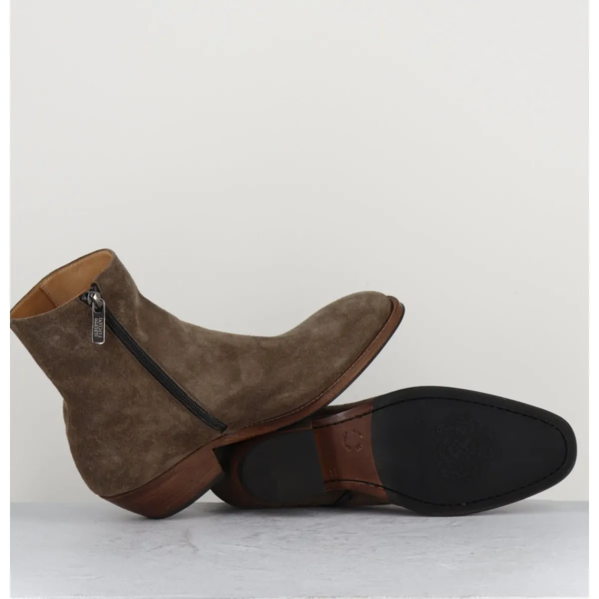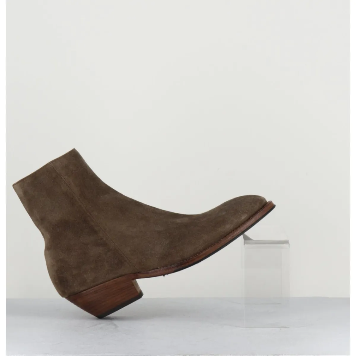 Bottines esprit santiags en daim taupe extrêmement souple, zip intérieur, bout effilé sobre, montées sur une semelle en cuir et gomme cousue main & un talon biseauté.