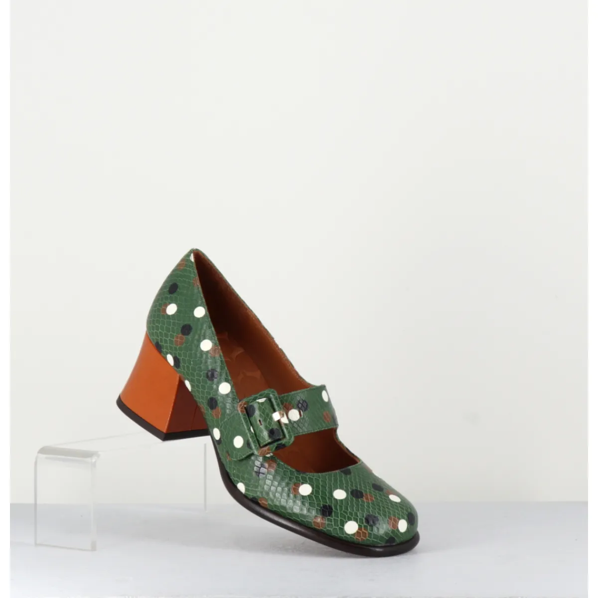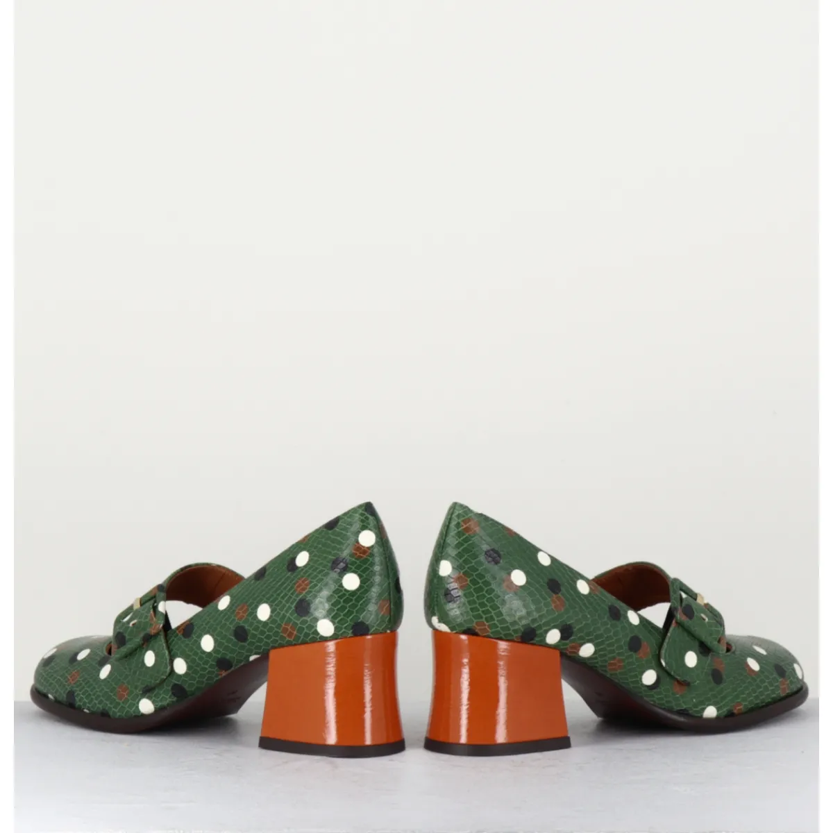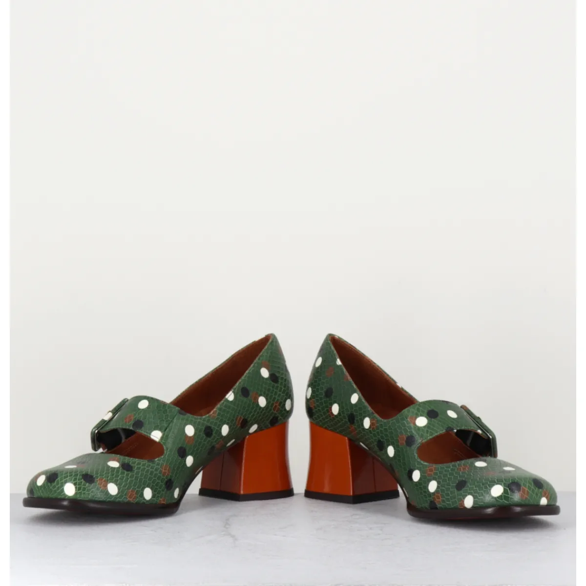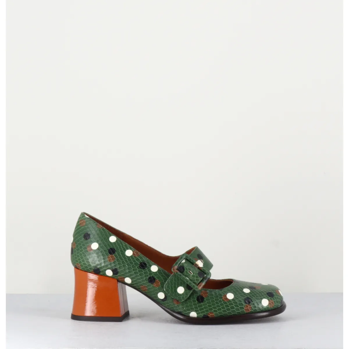 Petites chaussures babies rétro en cuir gaufré effet reptile vert & imprimé pois blanc/noir/marron, bout carré arrondi, montées sur un petit talon recouvert de cuir effet vernis orangé, légèrement évasé esprit 70s