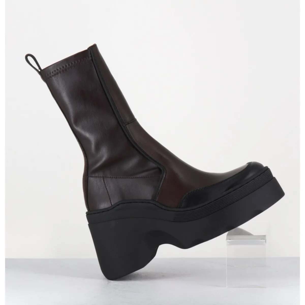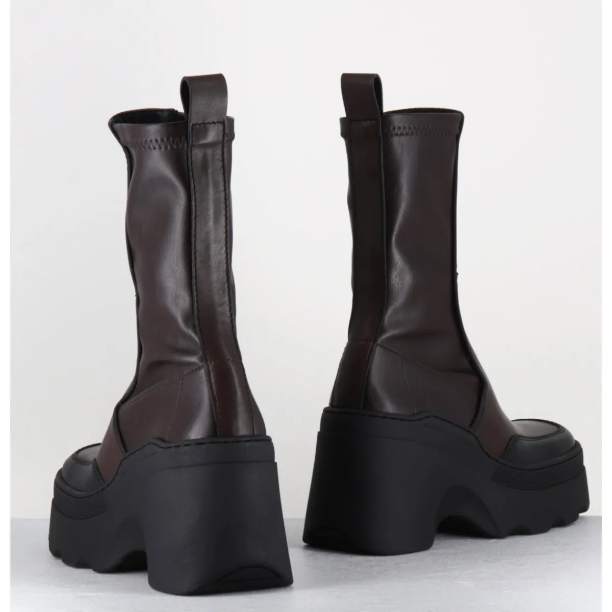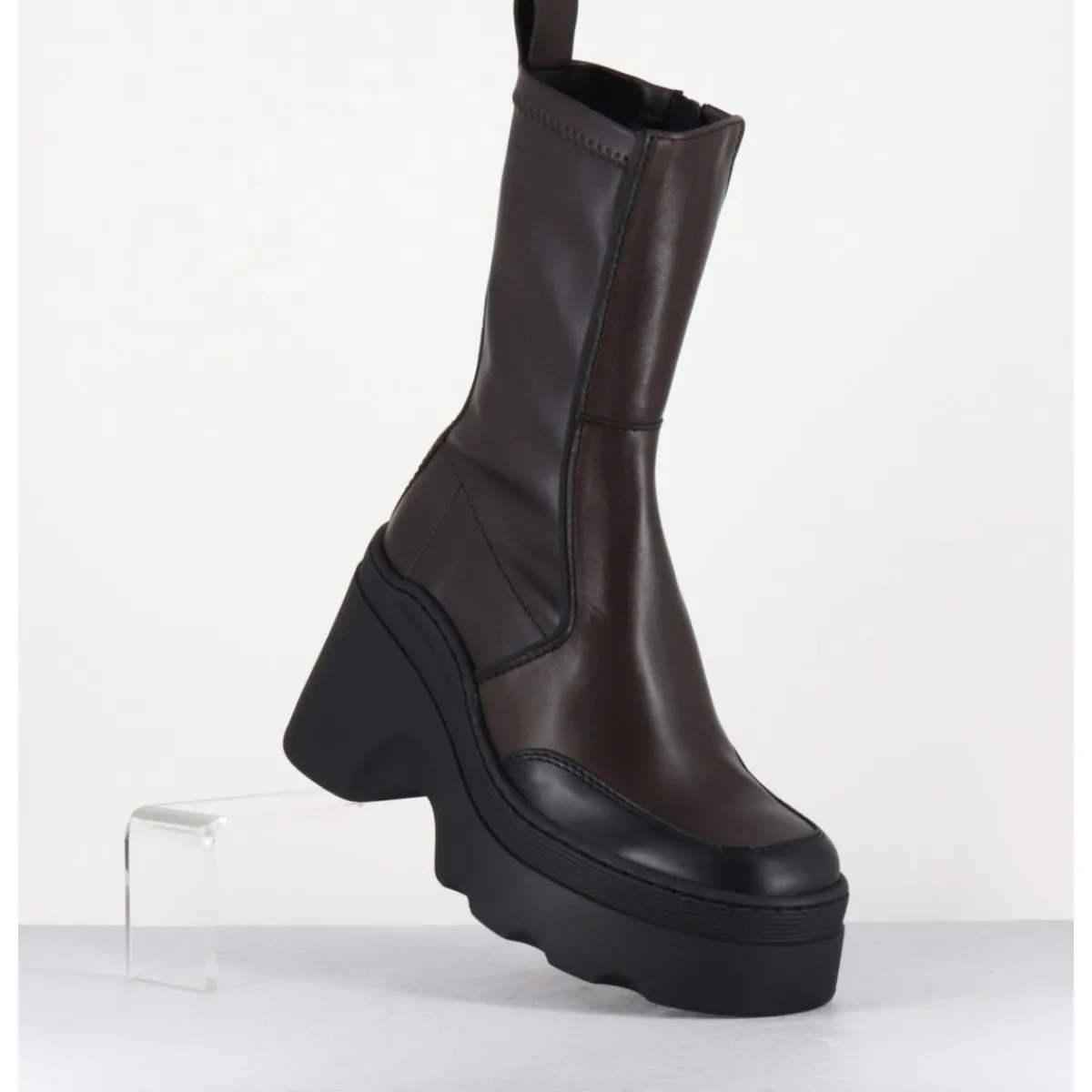 Boots réalisées à partir d’empiècements de cuir marron avec surpiqûres contrastantes, arrière en stretch pour un effet galbant sur la jambe; montées sur une semelle compensée esprit bratz