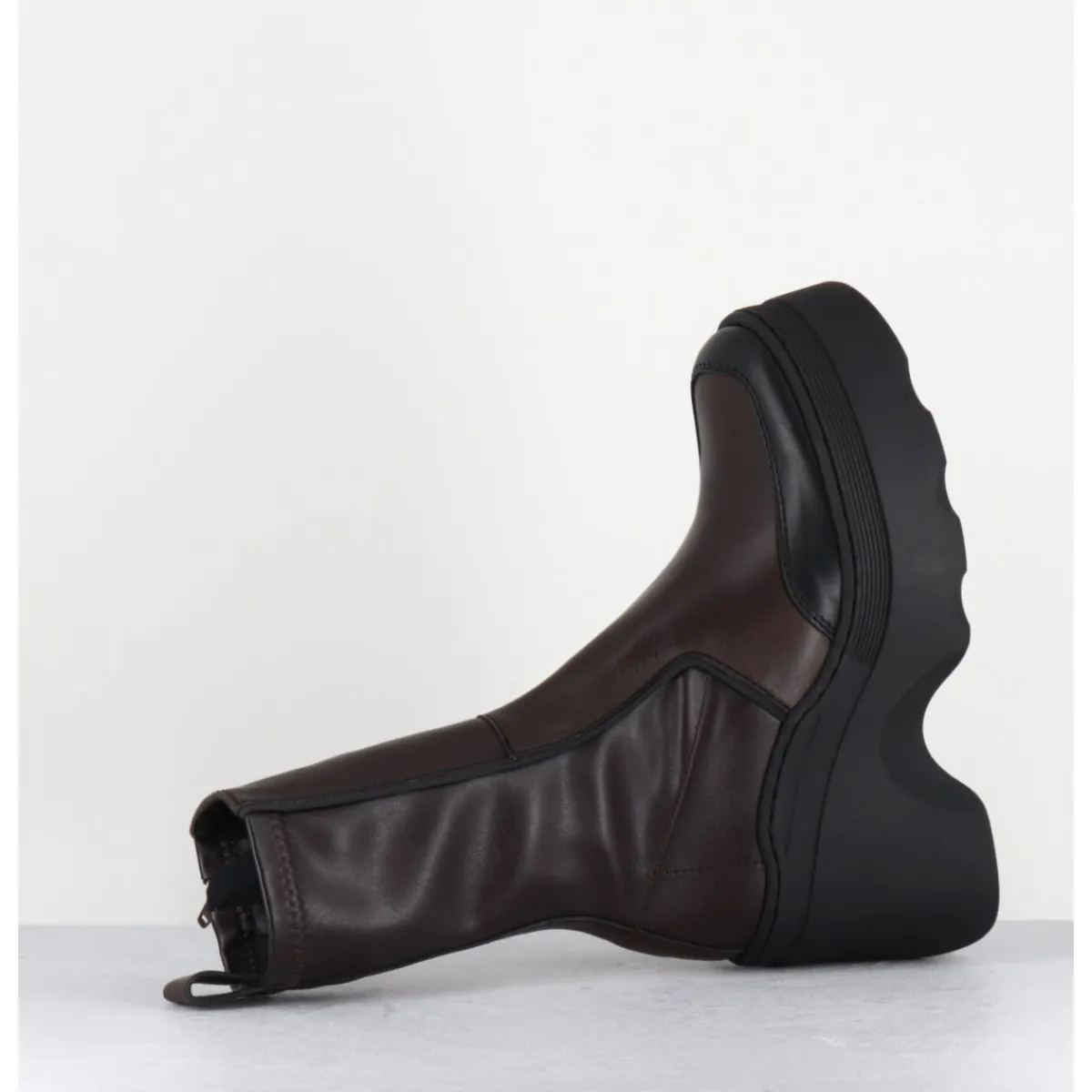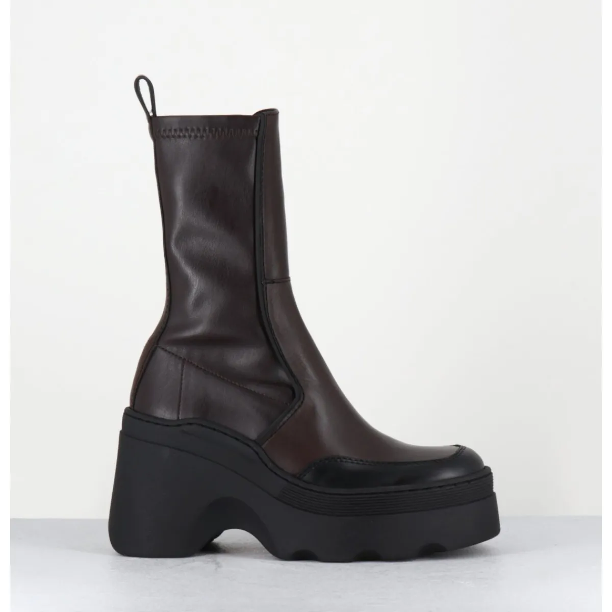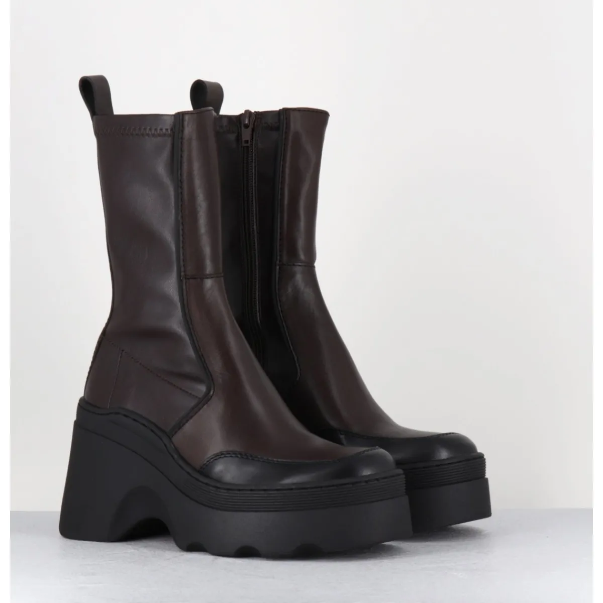 Boots réalisées à partir d’empiècements de cuir marron avec surpiqûres contrastantes, arrière en stretch pour un effet galbant sur la jambe; montées sur une semelle compensée esprit bratz