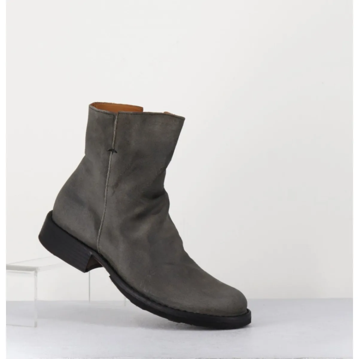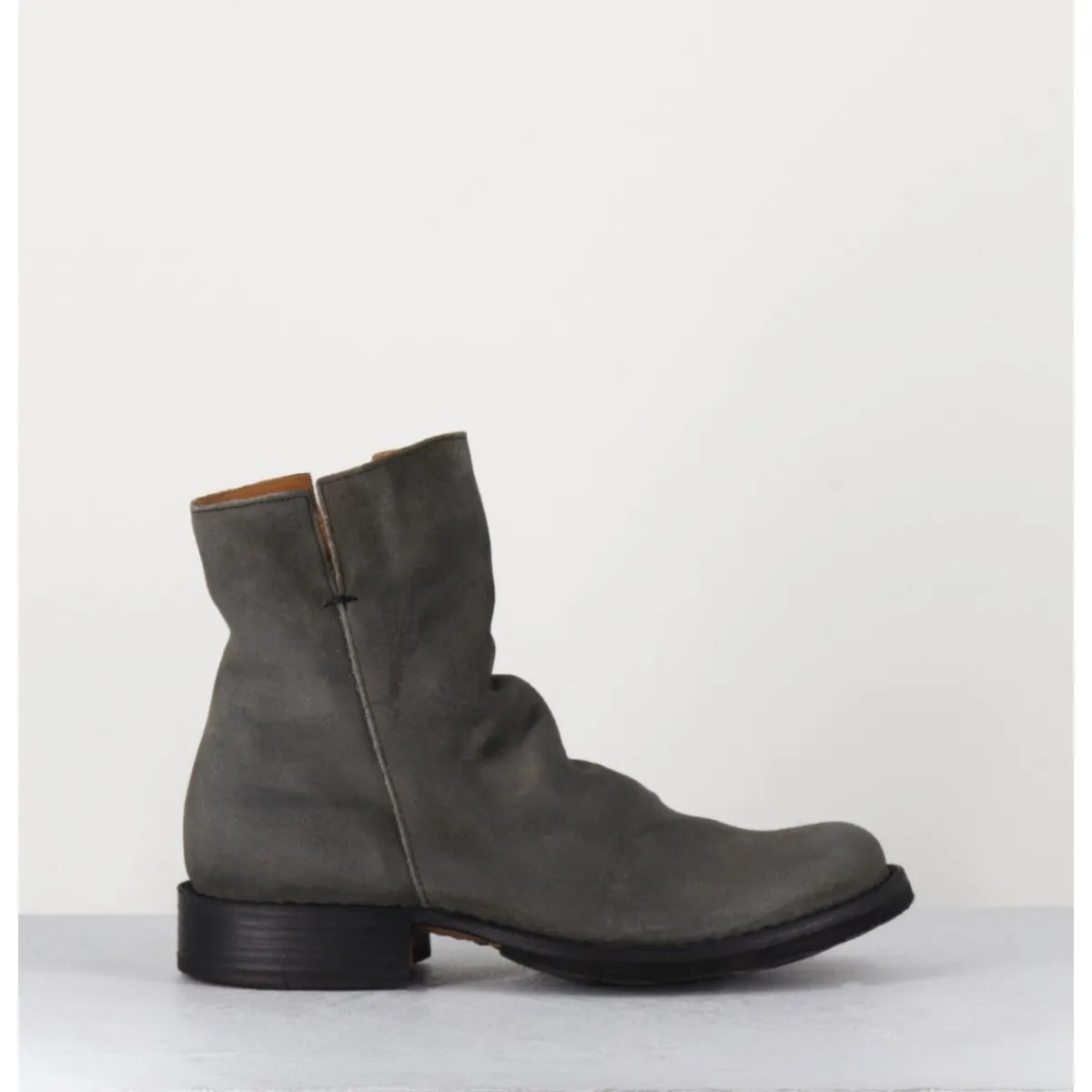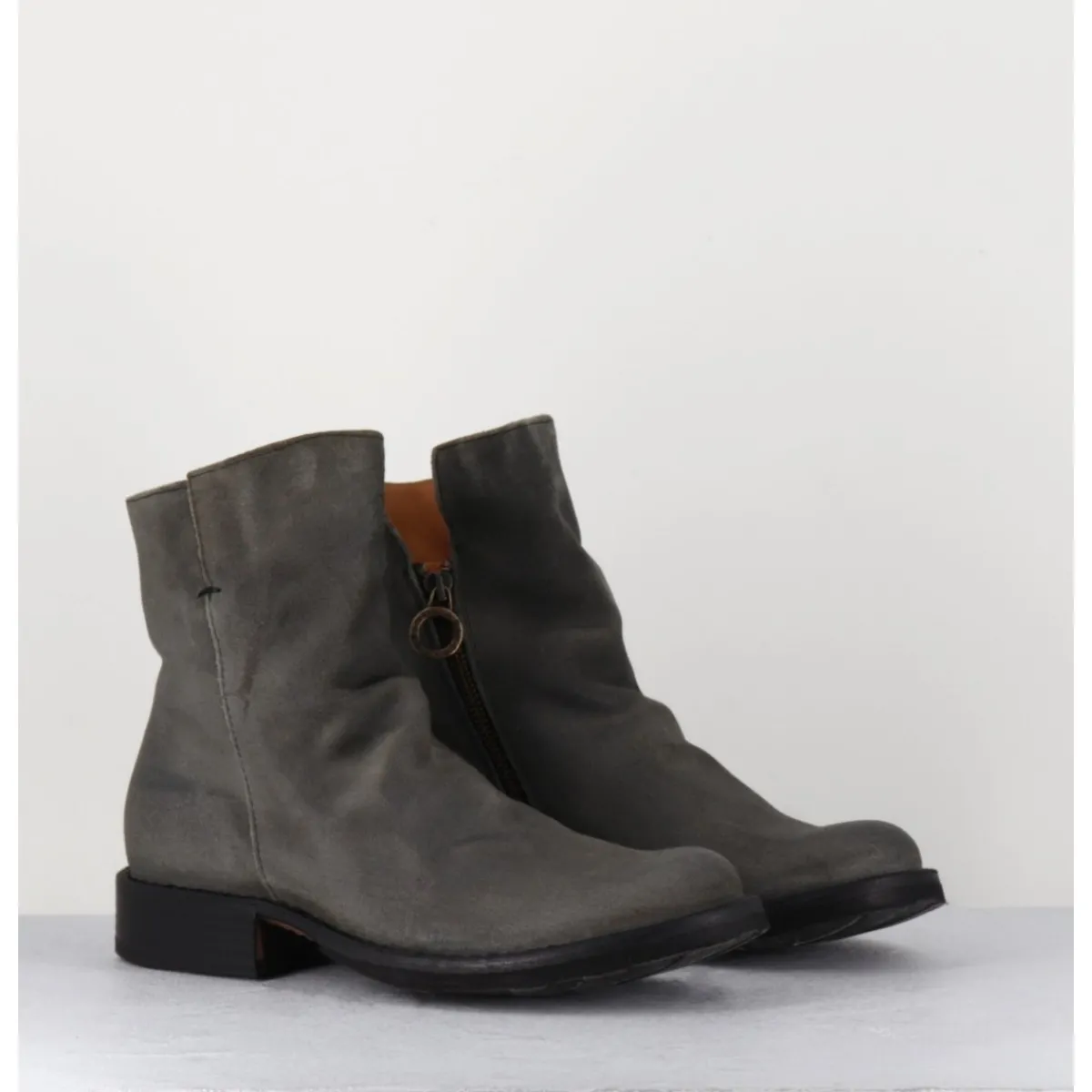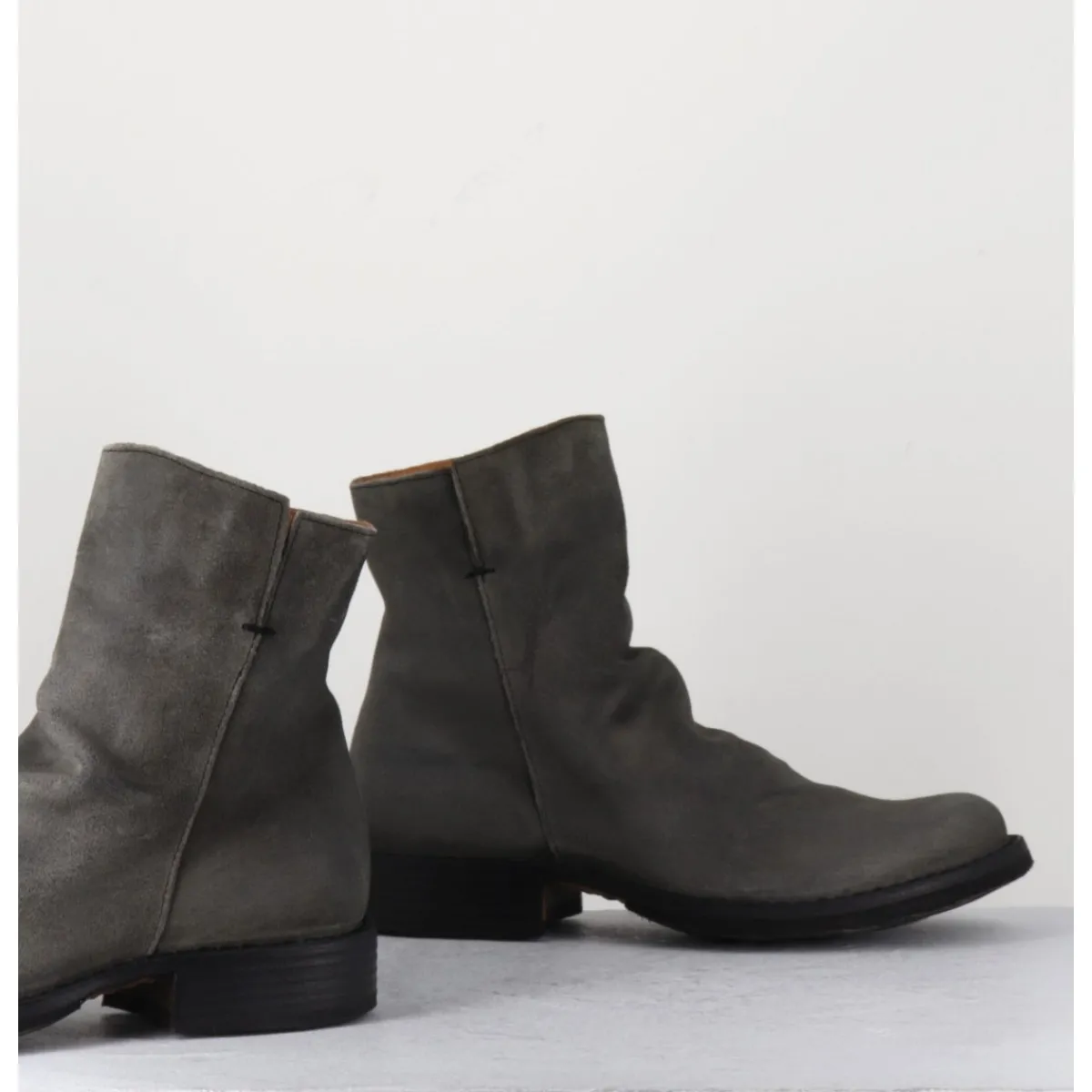 Boots esprit biker en veau velours gris taupe, bout arrondi, travail de plissé à l’avant & zip intérieur, montées sur une semelle en cuir et caoutchouc cousue. Modèle iconique de la Maison présent dans nos collections depuis de nombreuses années
