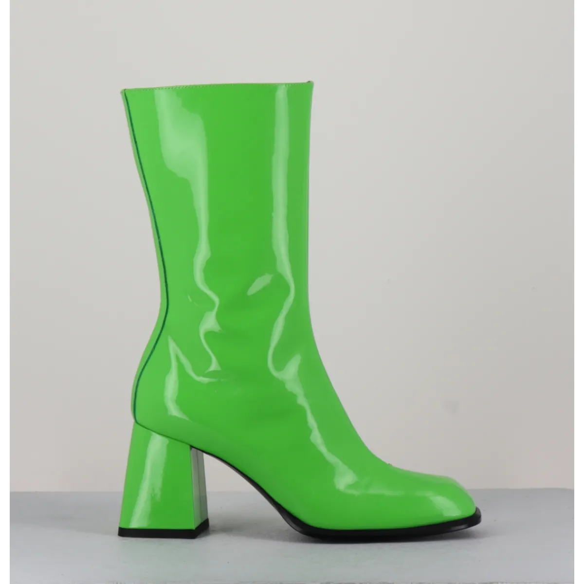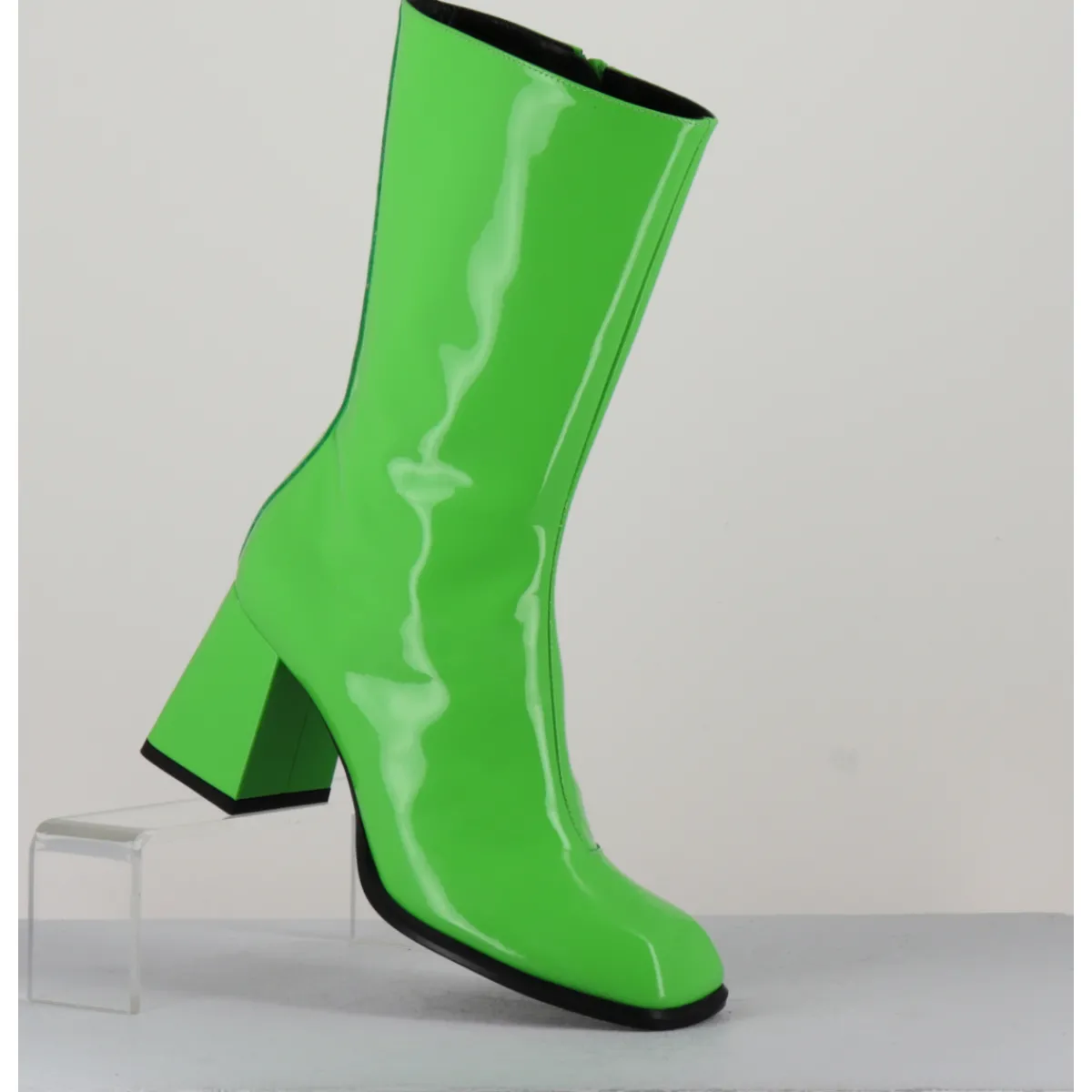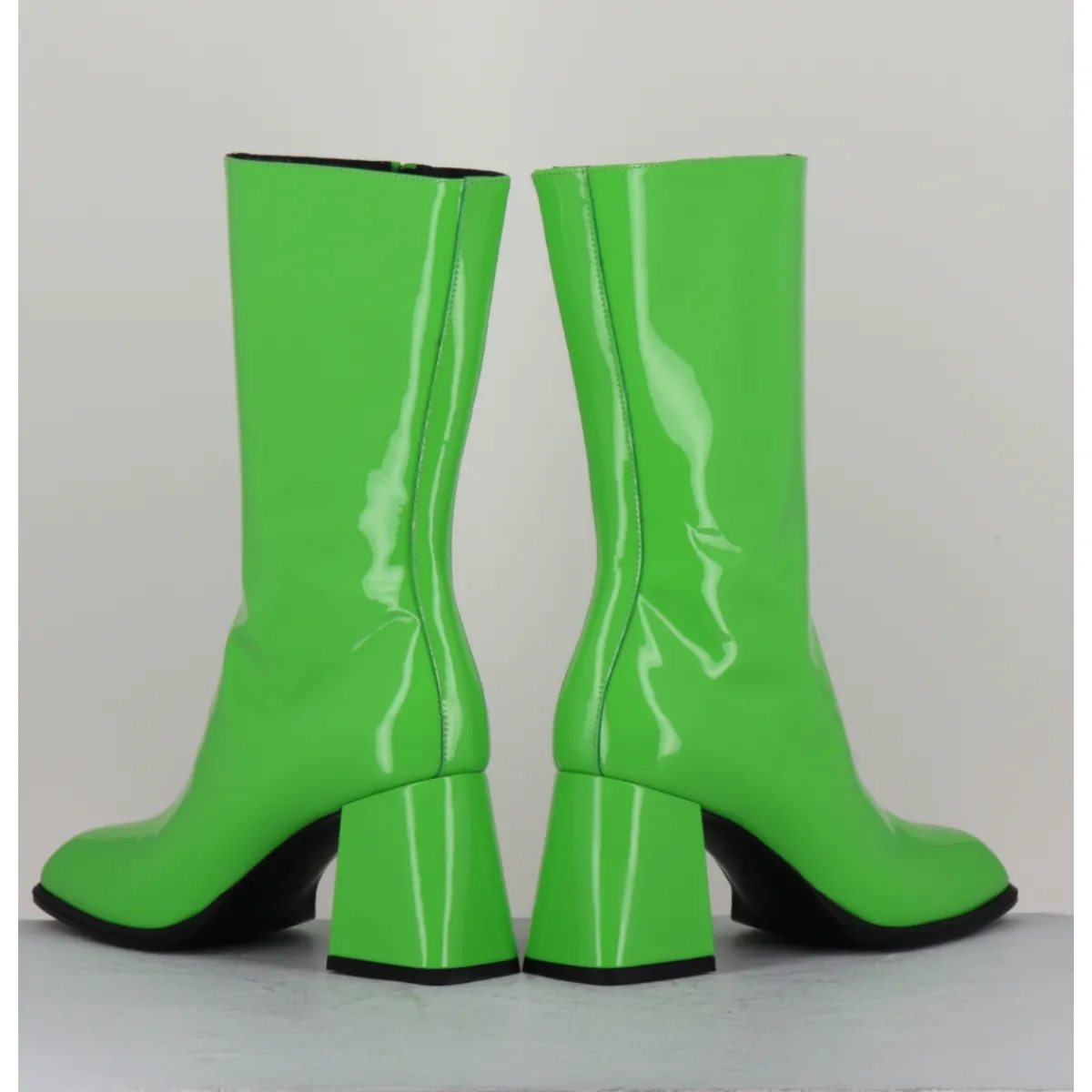 Boots tige haut en cuir vernis vert pomme, bout carré arrondi, zip intérieur, montées sur un talon évasé esprit années 70